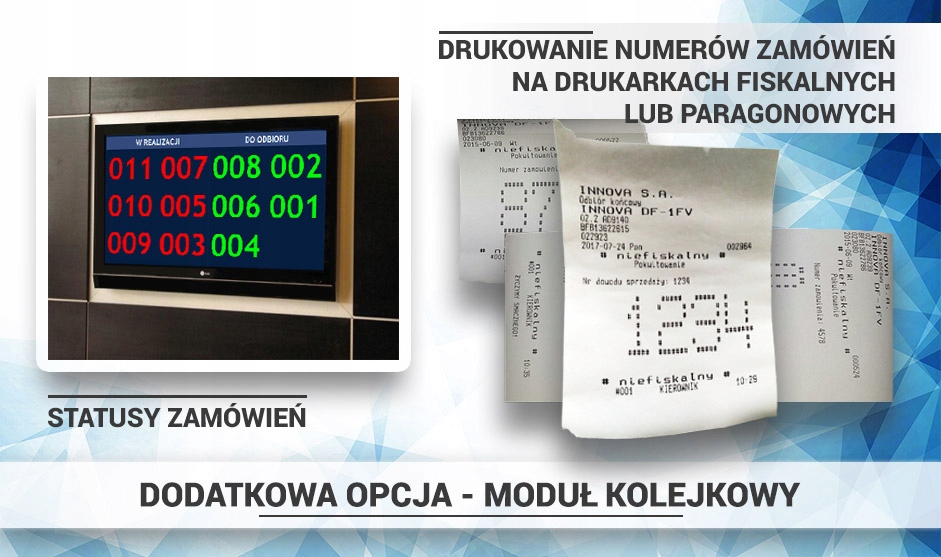Обработка очереди путем распечатки номера и отображения его на дополнительный экран. Очередь также работает с экраном KDS. "Отклик" реализован на экран на кухне может привести к замене номера "в реализации "на"для получения"