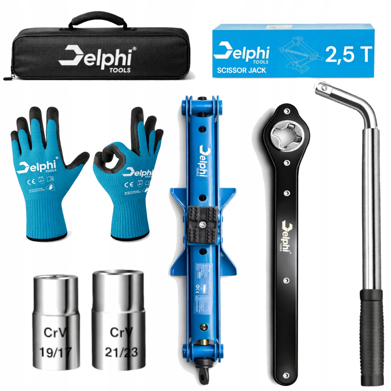 Zestaw z podnośnikiem trapezowym Delphi Tools 2,5T zawiera wszystko, co niezbędne do wymiany opon: podnośnik o udźwigu 2,5 tony, nasadki 19/17 mm i 21/23 mm, grzechotkę, klucz do kół, rękawice ochronne oraz torbę transportową. Idealny do samochodów osobowych, zapewnia wygodę i bezpieczeństwo pracy.