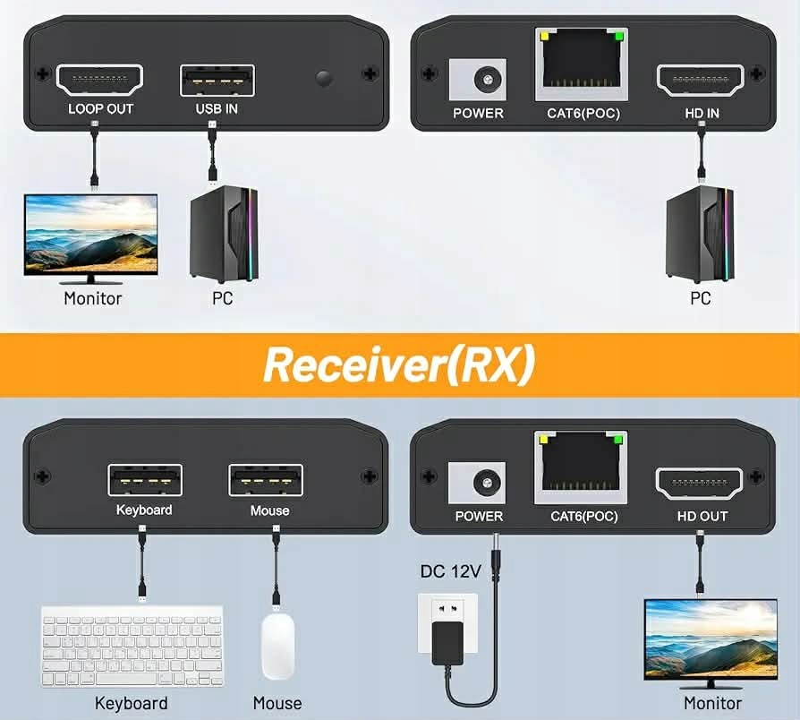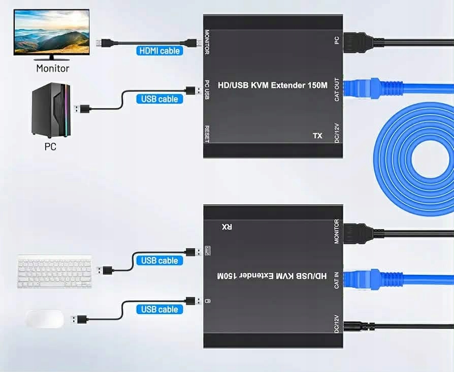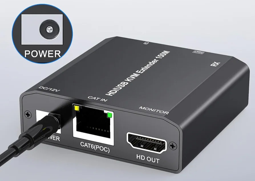 Plug and Play, nie wymaga sterowników. Point-to-Point automatycznie pobiera adres IP i identyfikuje oraz konfiguruje różne wyświetlacze. 150 m HDMI KVM USB Extender obsługuje zasilanie Power over Ethernet (POE). Podłącz po prostu dostarczony zasilacz DC 12 V do gniazda odbiornika HDMI KVM Extender, aby wszystkie urządzenia działały poprawnie. Obsługuje połączenie punkt-punkt do 150 metrów za pomocą kabla Cat5 / Cat5e / Cat6