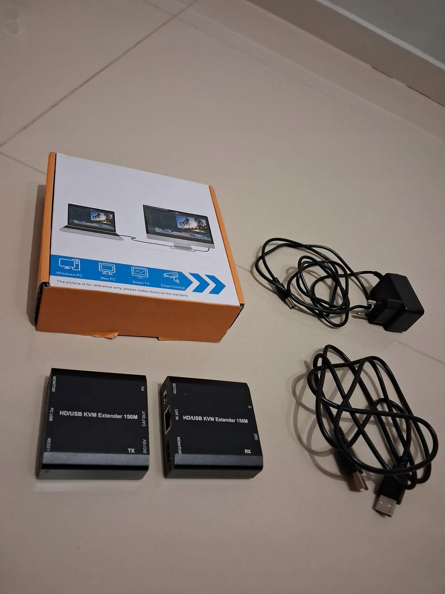 1 nadajnik przedłużacza KVM, 1 odbiornik przedłużacza KVM, 1 ładowarka DC 12 V, 1 kabel USB A-A.