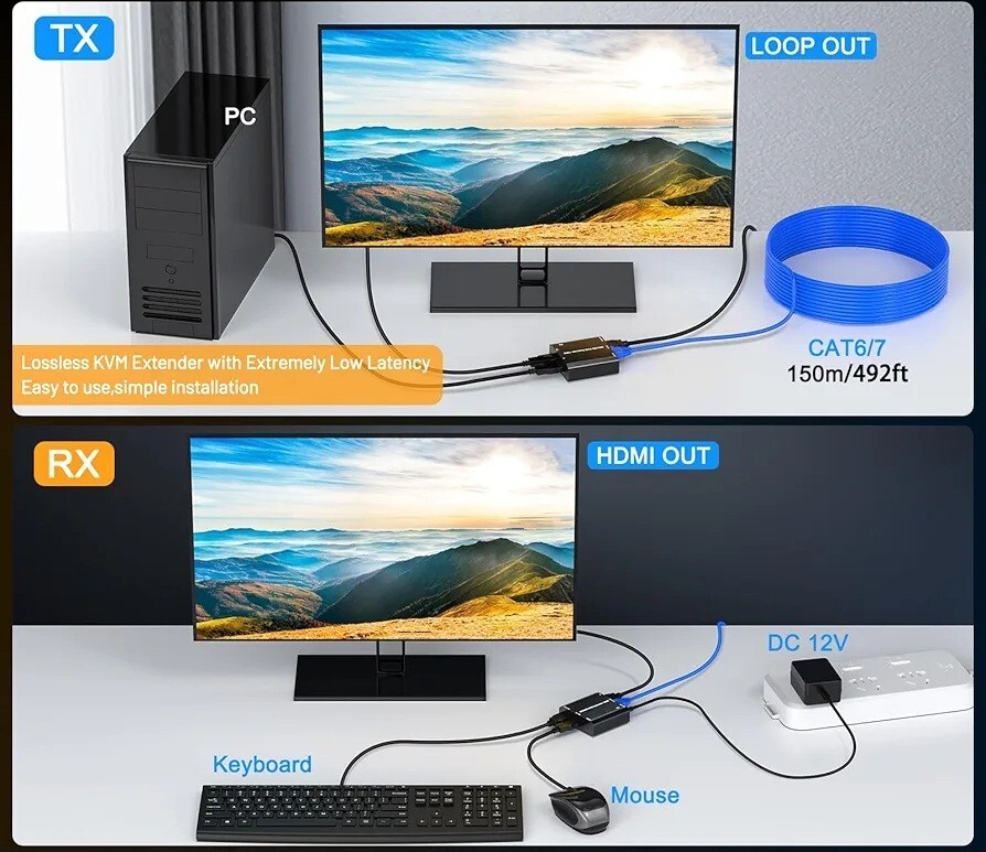 Przedłużacz USB YOUTINGHDAV HDMI KVM wykorzystuje kabel Ethernet CAT5e/CAT6 do przesyłania sygnałów klawiatury, myszy i HDMI na zdalne monitory i myszy oraz klawiatury. Przedłużacz KVM-over-IP przesyła sygnały audio i wideo HDMI oraz sygnały klawiatury i myszy USB 2.0 w oparciu o standardową technologię IP, dzięki czemu można wykonywać interaktywne zdalne operacje z dużej odległości