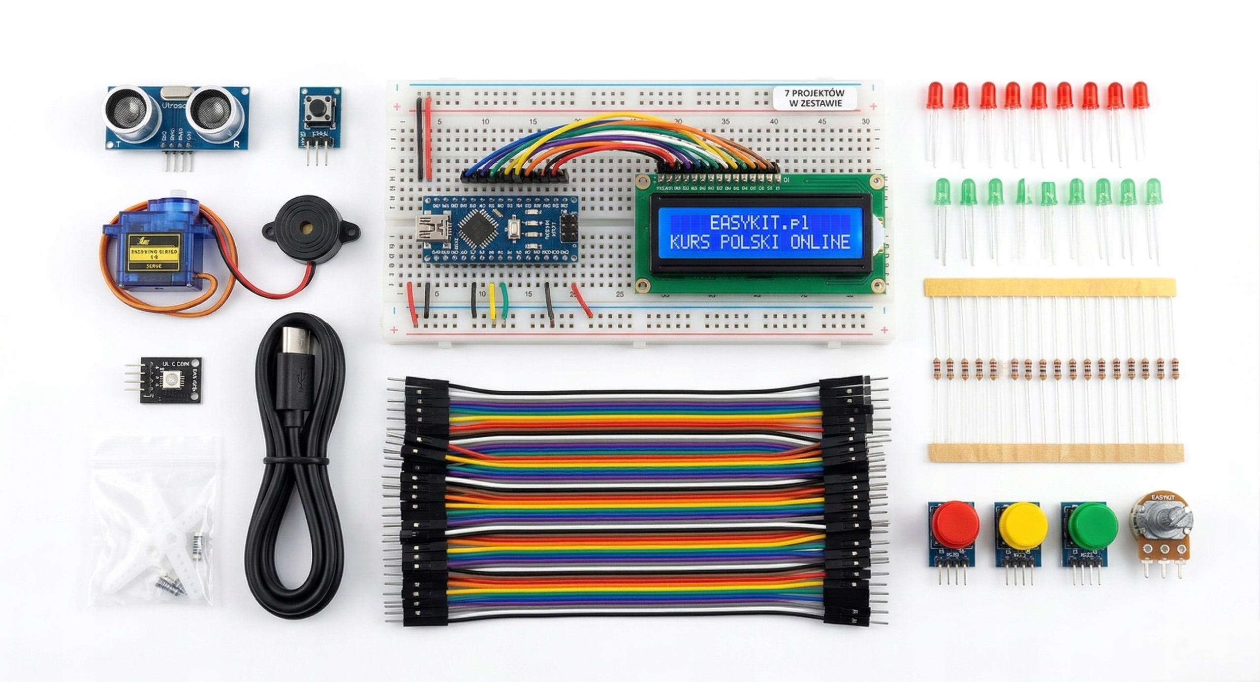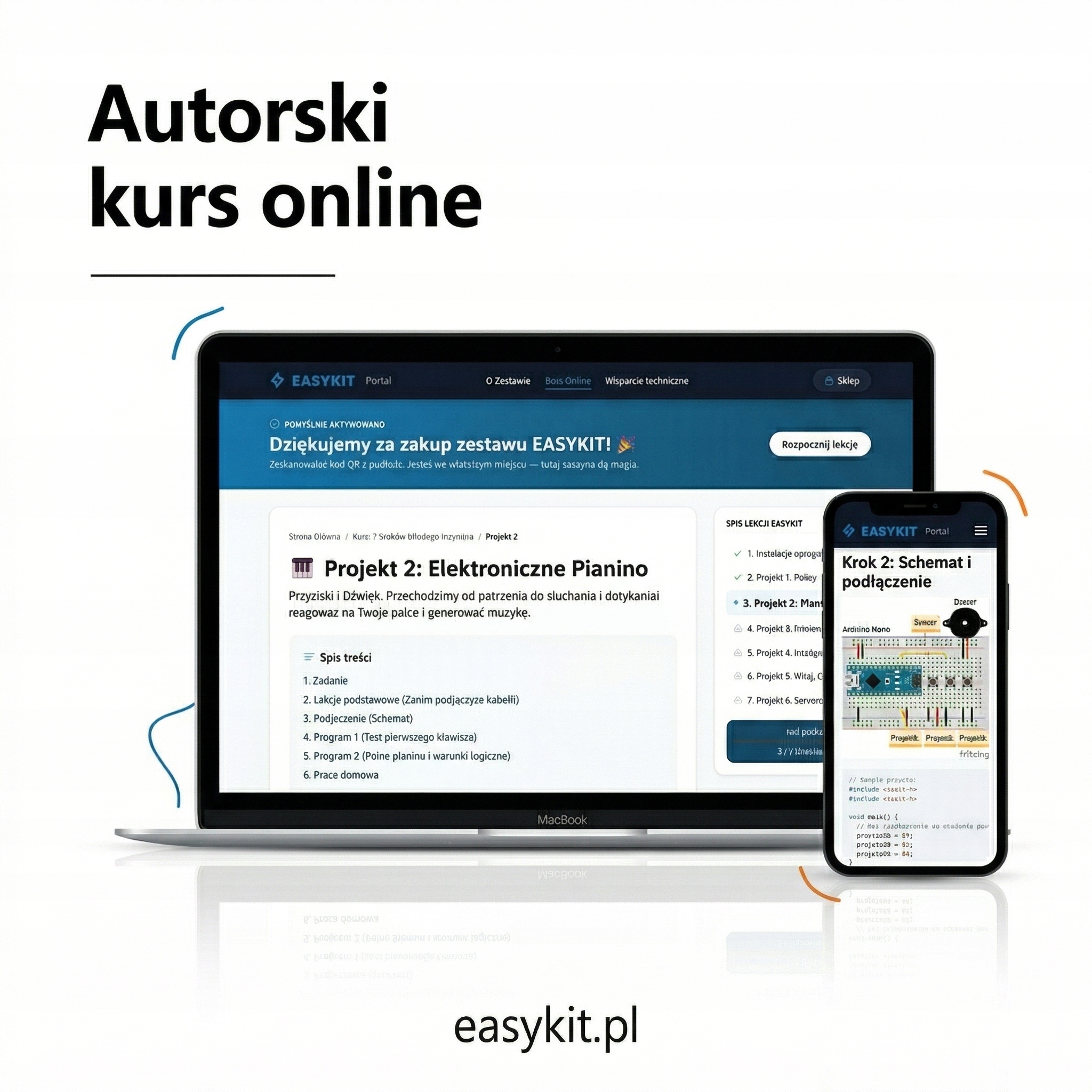 Nie musisz nic szukać w internecie – prowadzimy od zera do pierwszego działającego układu! W pudełku znajdziesz kod QR do naszej platformy. Stworzycie razem m.in.: