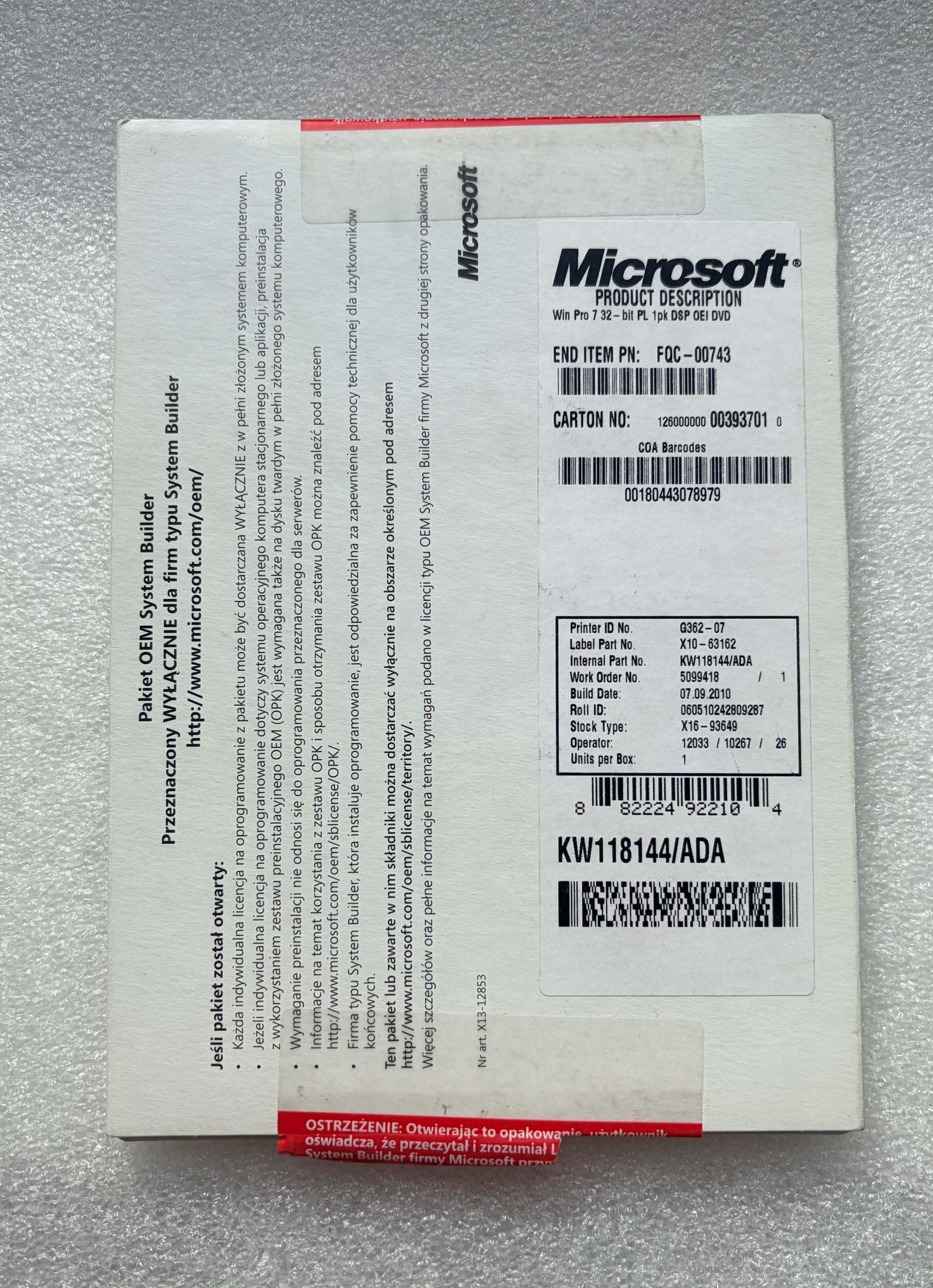 Sprzedaż dotyczy Windows 7 pro w języku polskim. W komplecie: pudelko, płyta DVD, aktywator.