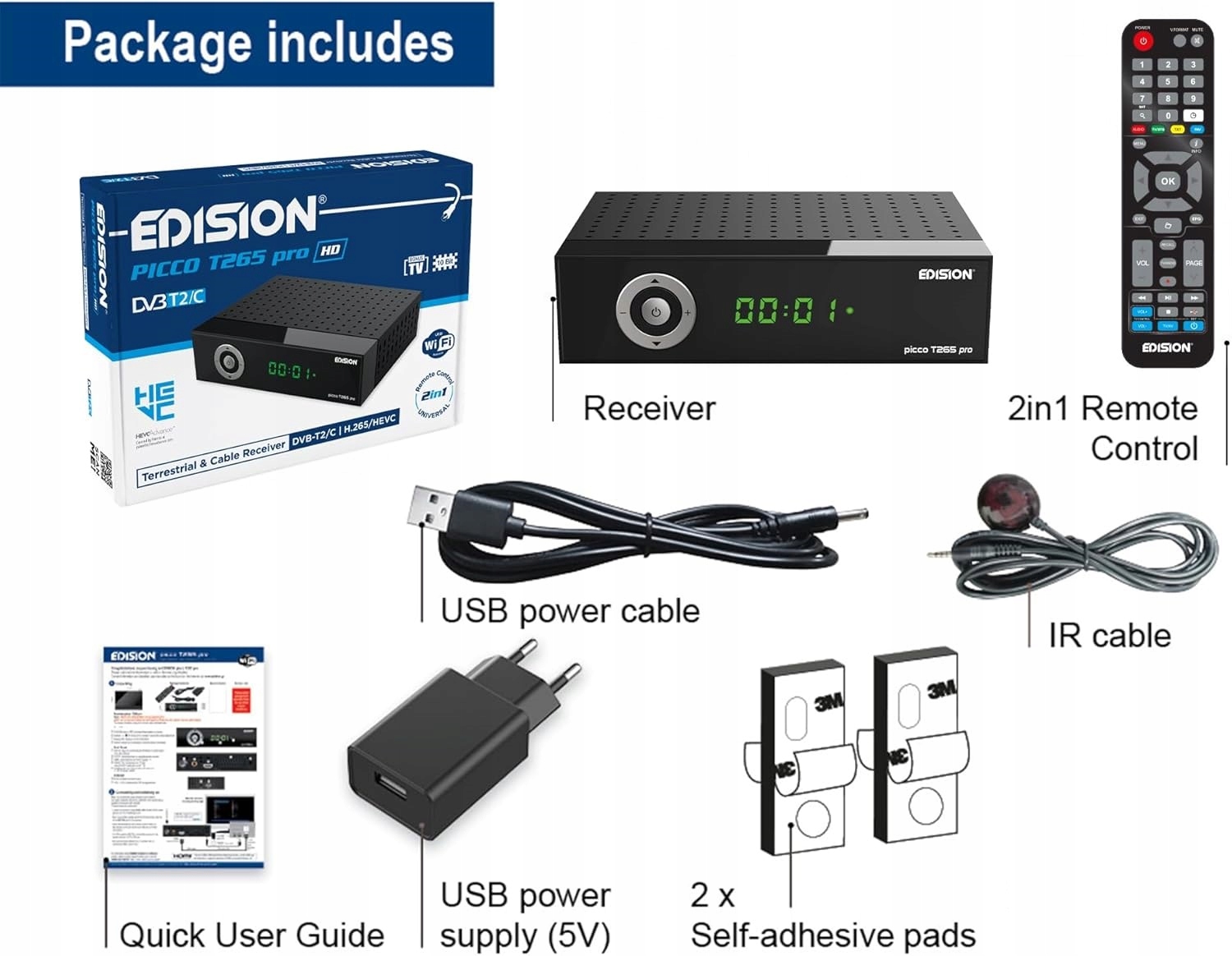PICCO T265 pro HD to nowy odbiornik EDISION do odbioru sygnału naziemnej telewizji cyfrowej i kablowej, Full High Definition DVB-T2/C H265 HEVC 10Bit. Nowoczesny design, zaawansowane procesy produkcyjne i nowy wygląd panelu przedniego z wyświetlaczem, a także pięć (5) przycisków w układzie kołowym dla trzech (3) funkcji, w połączeniu z nowym, zaawansowanym procesorem i podzespołami, zapewniają użytkownikom najwyższy poziom komfortu. Dodatkowe funkcje obejmują zupełnie nowy pilot zdalnego sterowania IR 2 w 1 EDI-RCU 4 Learn, o wyjątkowo ergonomicznym i praktycznym zastosowaniu, cztery (4) domyślne ustawienia telewizora LG/SAMSUNG*, które można również programować, a także zasilacz 2 w 1 USB 5V. Ten specjalny zasilacz dekodera 2 w 1 USB 5V działa jak zwykły zasilacz podłączony do sieci elektrycznej, ale użytkownik może podłączyć kabel zasilający USB do portu USB telewizora. PICCO T265 pro HD obsługuje USB WiFi, zapewniając dostęp do aplikacji takich jak YouTube, prognoza pogody i aktualizacje oprogramowania online, z dodatkową anteną USB WiFi EDI-Mega. Obsługiwane są również funkcje odtwarzacza multimedialnego Η265 oraz nagrywania PVR**. Urządzenie zostało zaprojektowane ze szczególnym naciskiem na łatwość obsługi, ponieważ zawiera również kabel Jack-IR, dzięki czemu dekoder jest praktycznie niewidoczny, na przykład poprzez umieszczenie go za telewizorem.