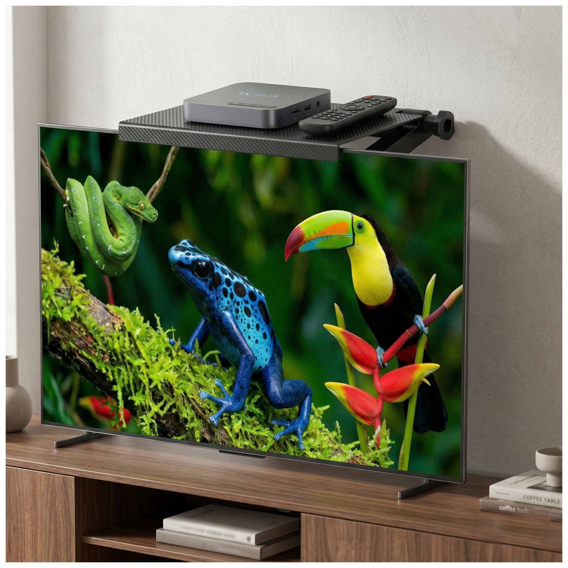 Zapomnij o skomplikowanych instrukcjach oraz bałaganie związanym z instalacją tradycyjnych uchwytów ściennych. Półka mocowana jest bezpośrednio na górnej krawędzi telewizora w zaledwie kilka sekund, co czyni ją rozwiązaniem dostępnym dla każdego.