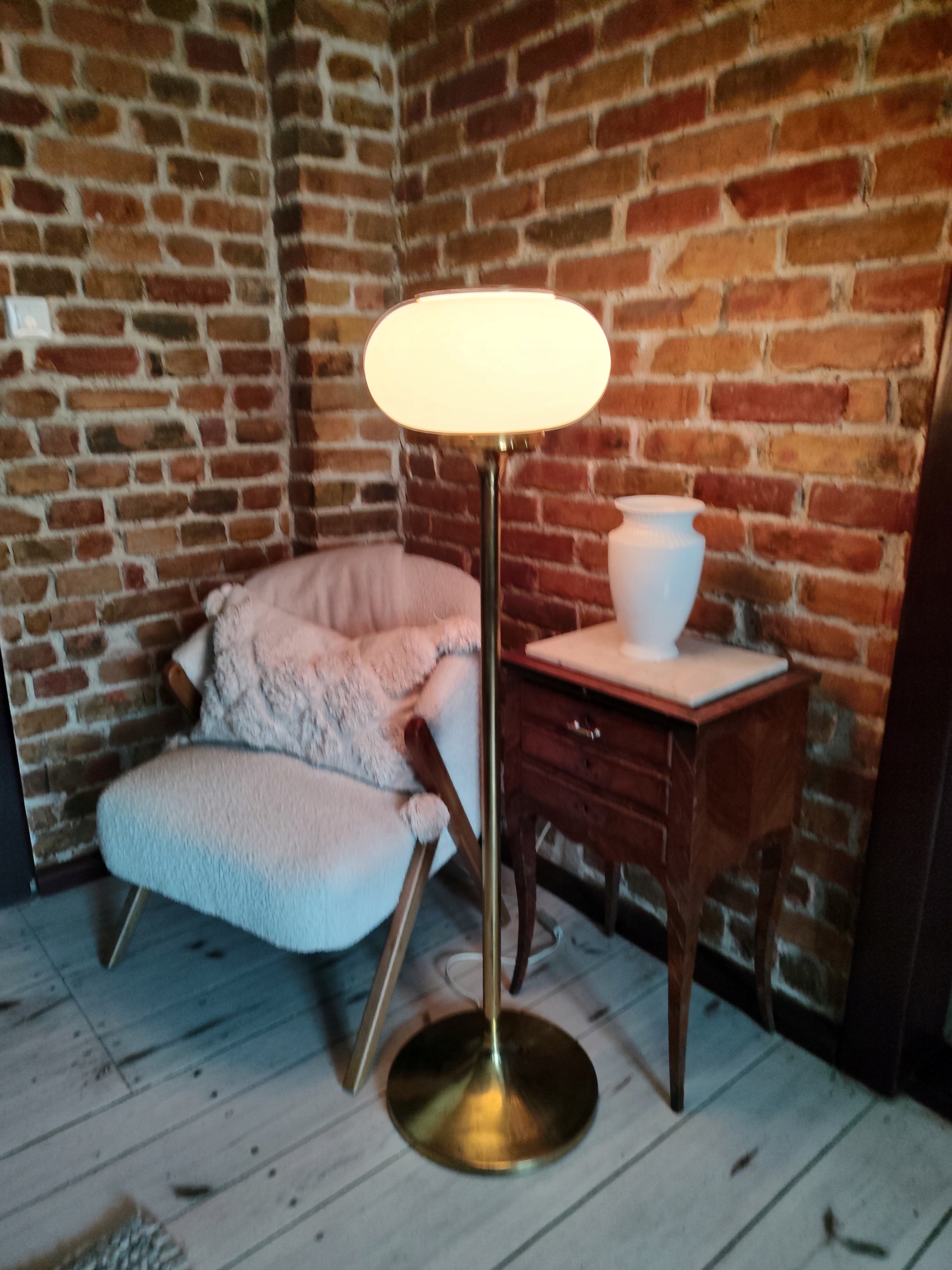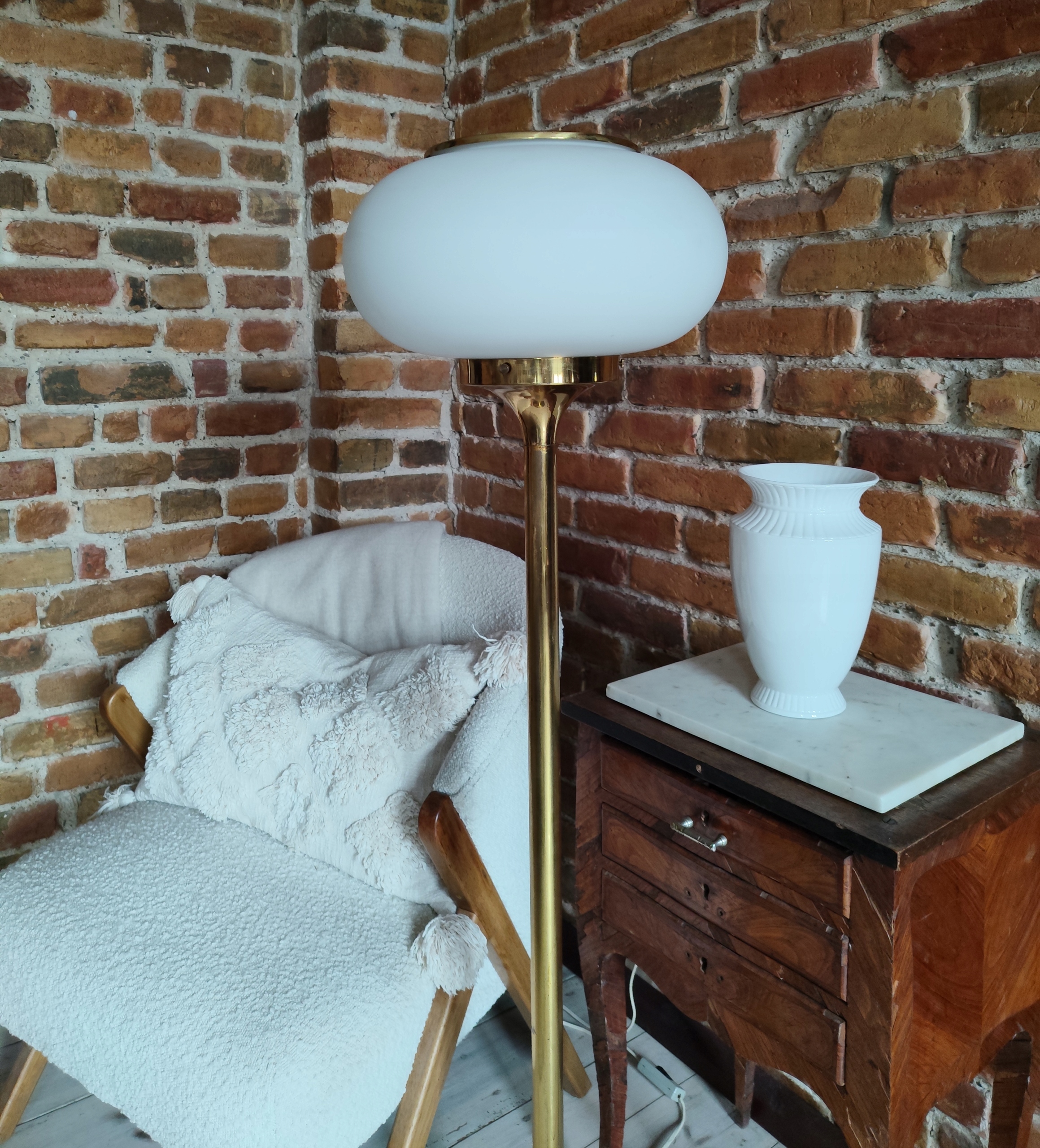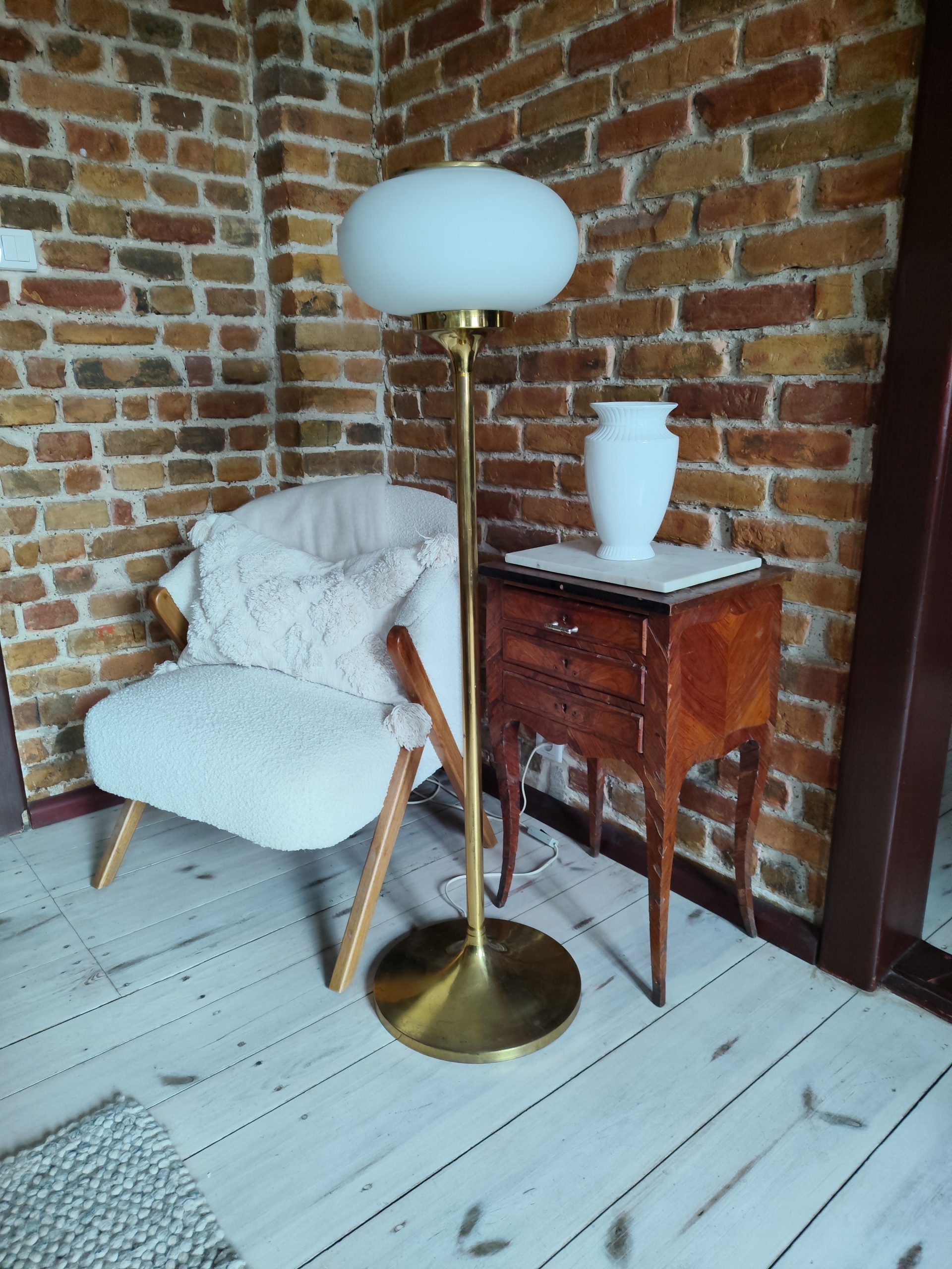 Elegancka lampa stojąca wykonana z wysokiej jakości mosiądzu w klasycznym designie mid-century (połowa XX wieku).