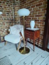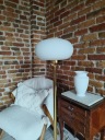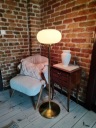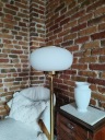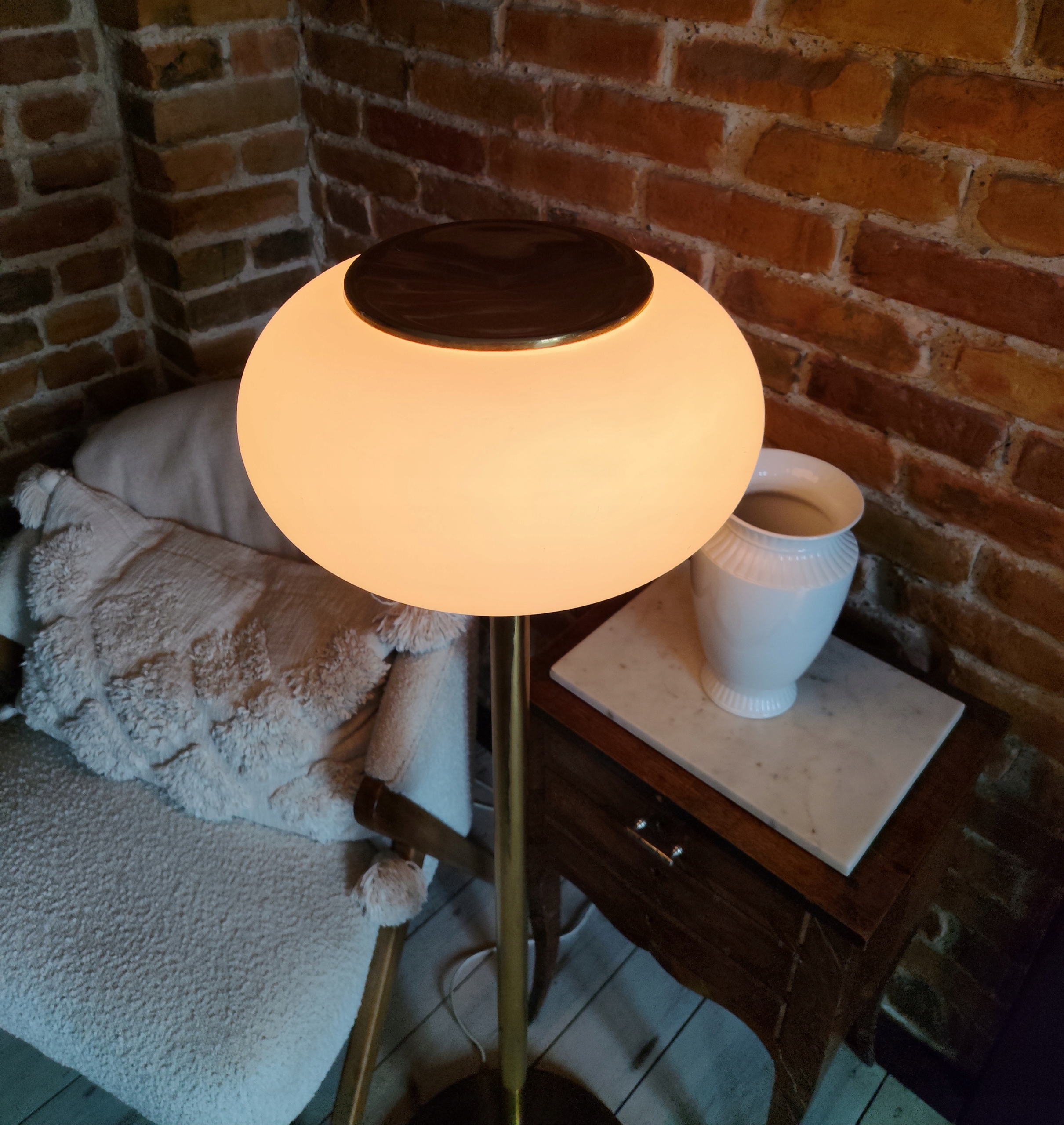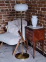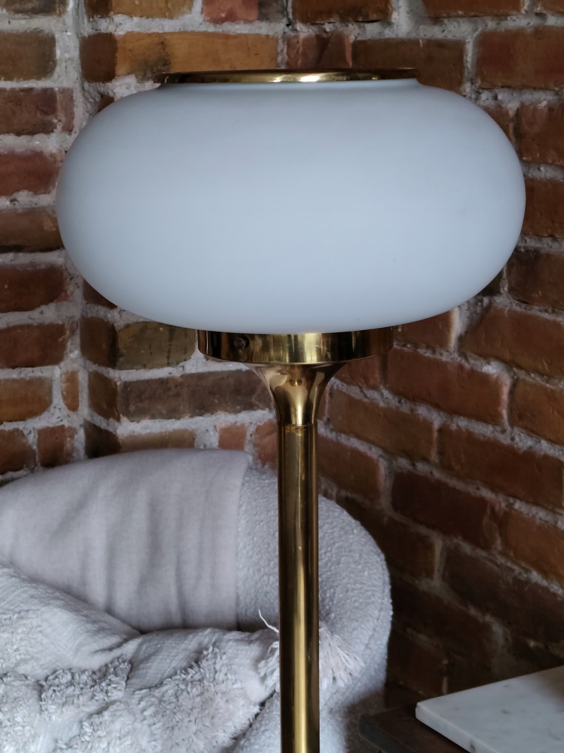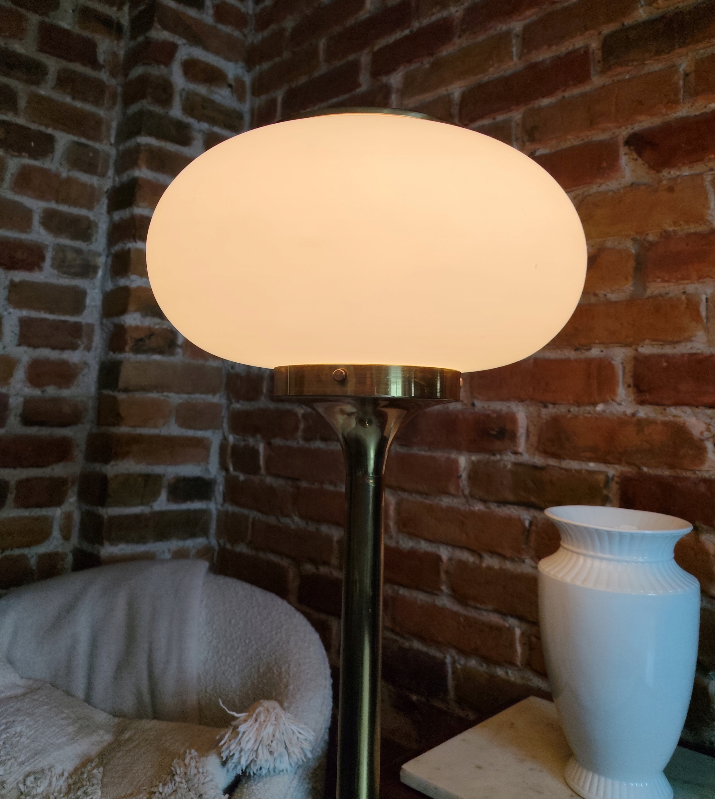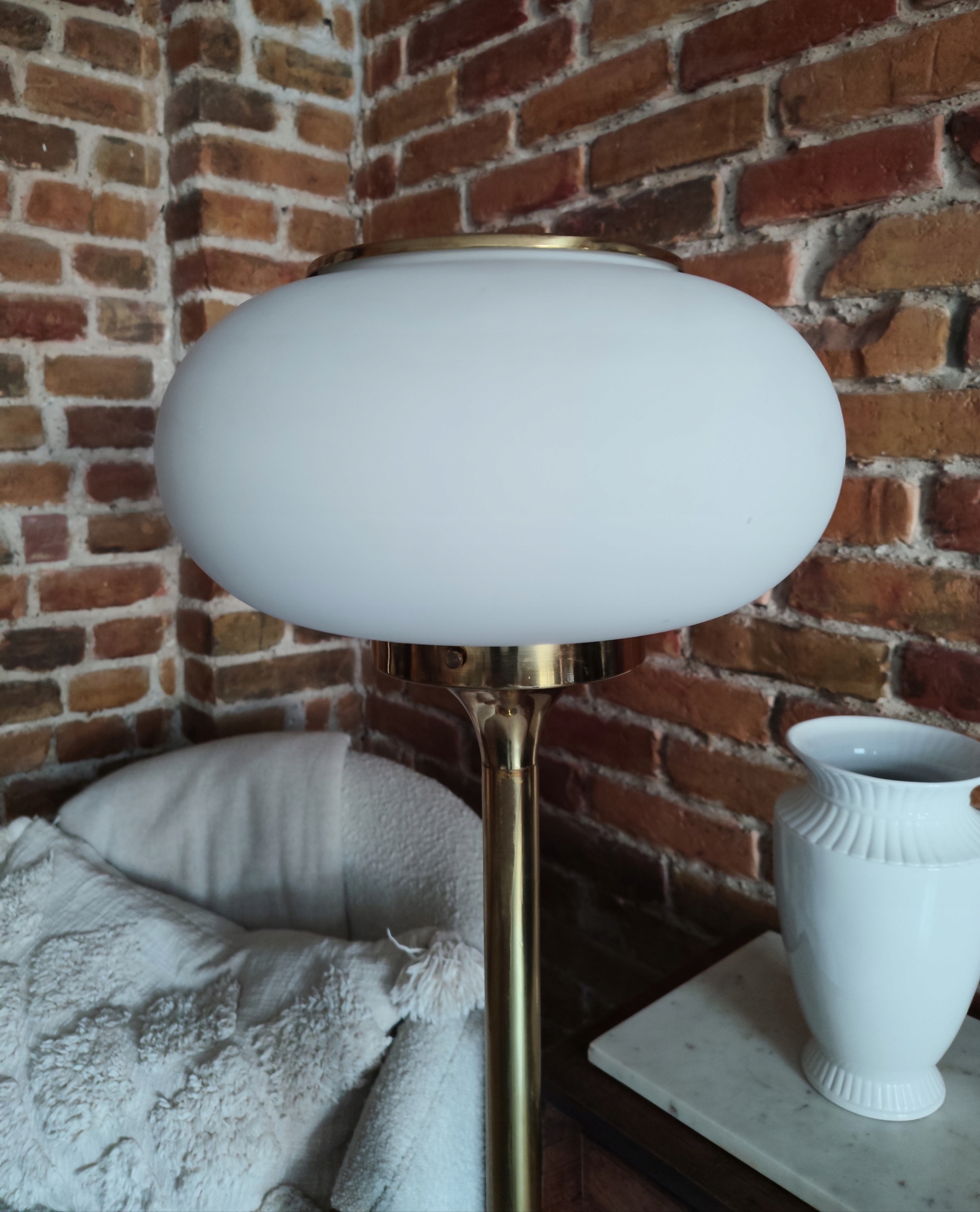 Lampa wyróżnia się smukłą, stabilną konstrukcją z okrągłą mosiężną podstawą i nowoczesnym kloszem w kolorze białym Idealnie pasuje do wnętrz vintage, loftowych oraz w stylu mid-century.