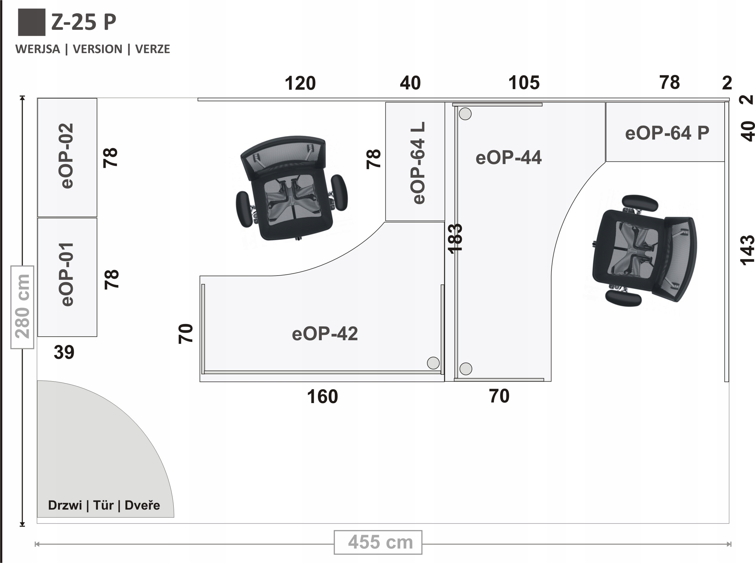 1 x eOP-40 | Biurko profilowane na prawo na korpusie z płyty | S160-40 G 105-70 W 75