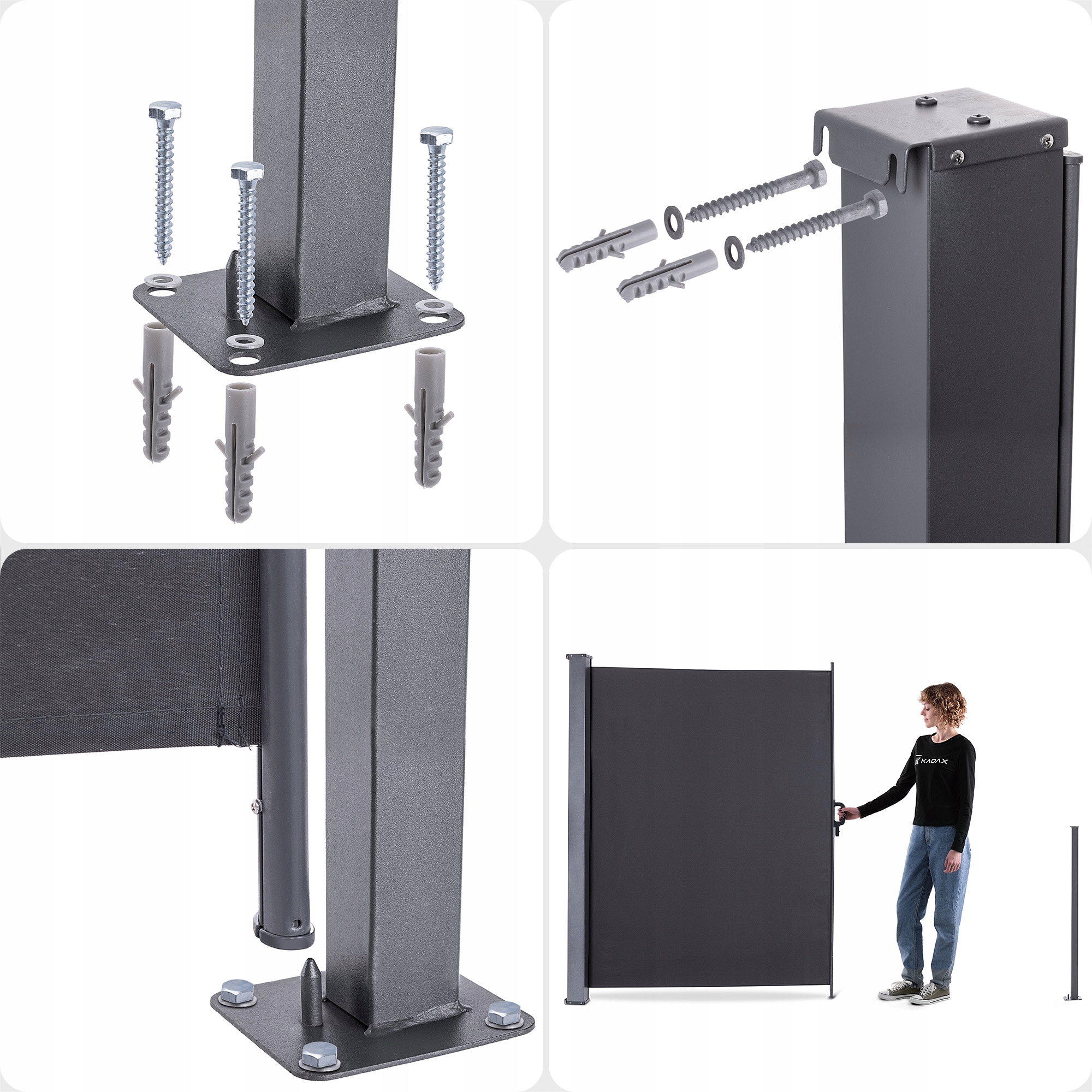➡️ Konstrukcja wyposażona jest w stabilne podstawy montowane do podłoża za pomocą śrub. Słupek końcowy posiada specjalny zaczep ułatwiający blokowanie rozciągniętej markizy.