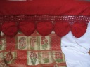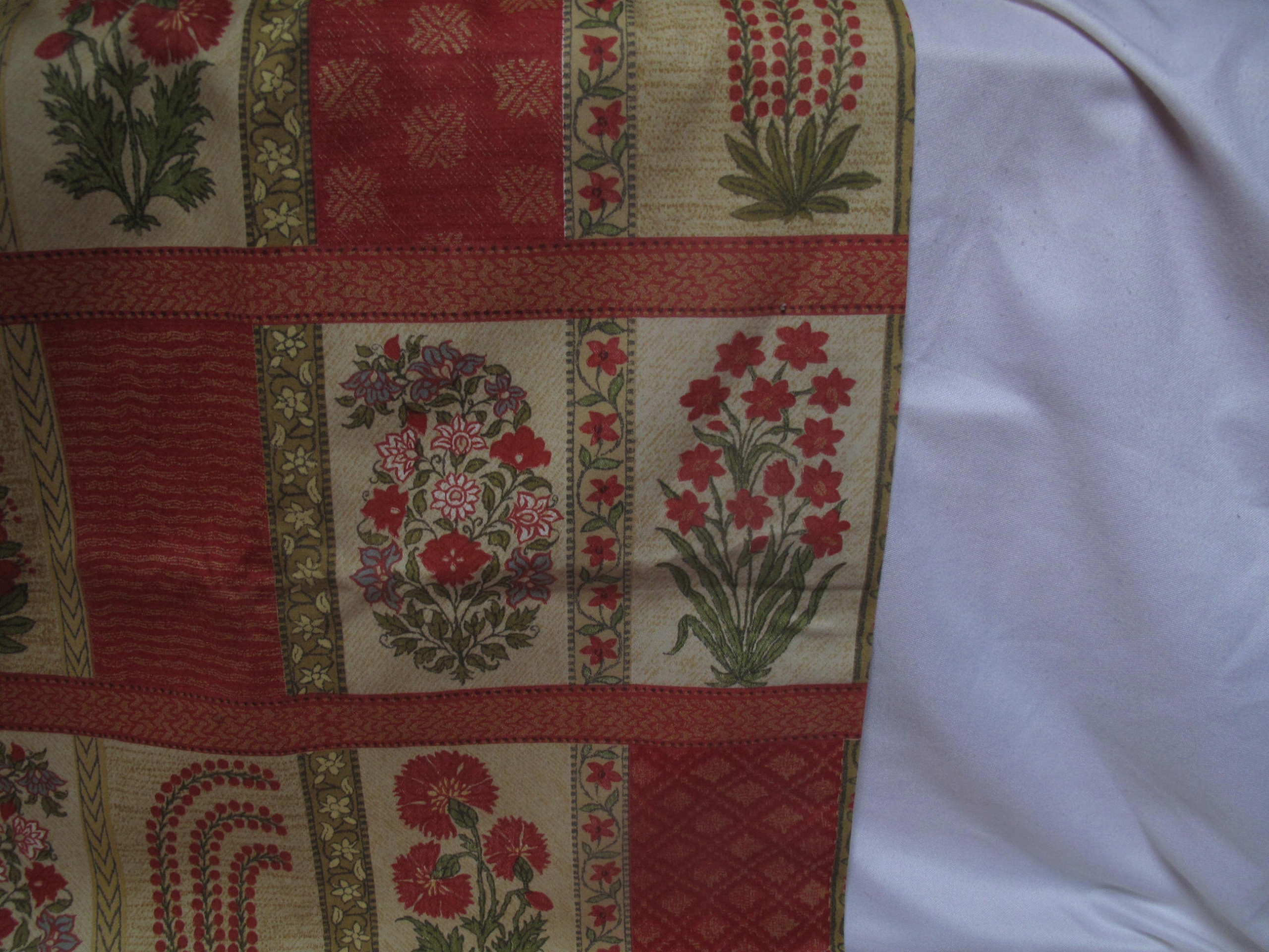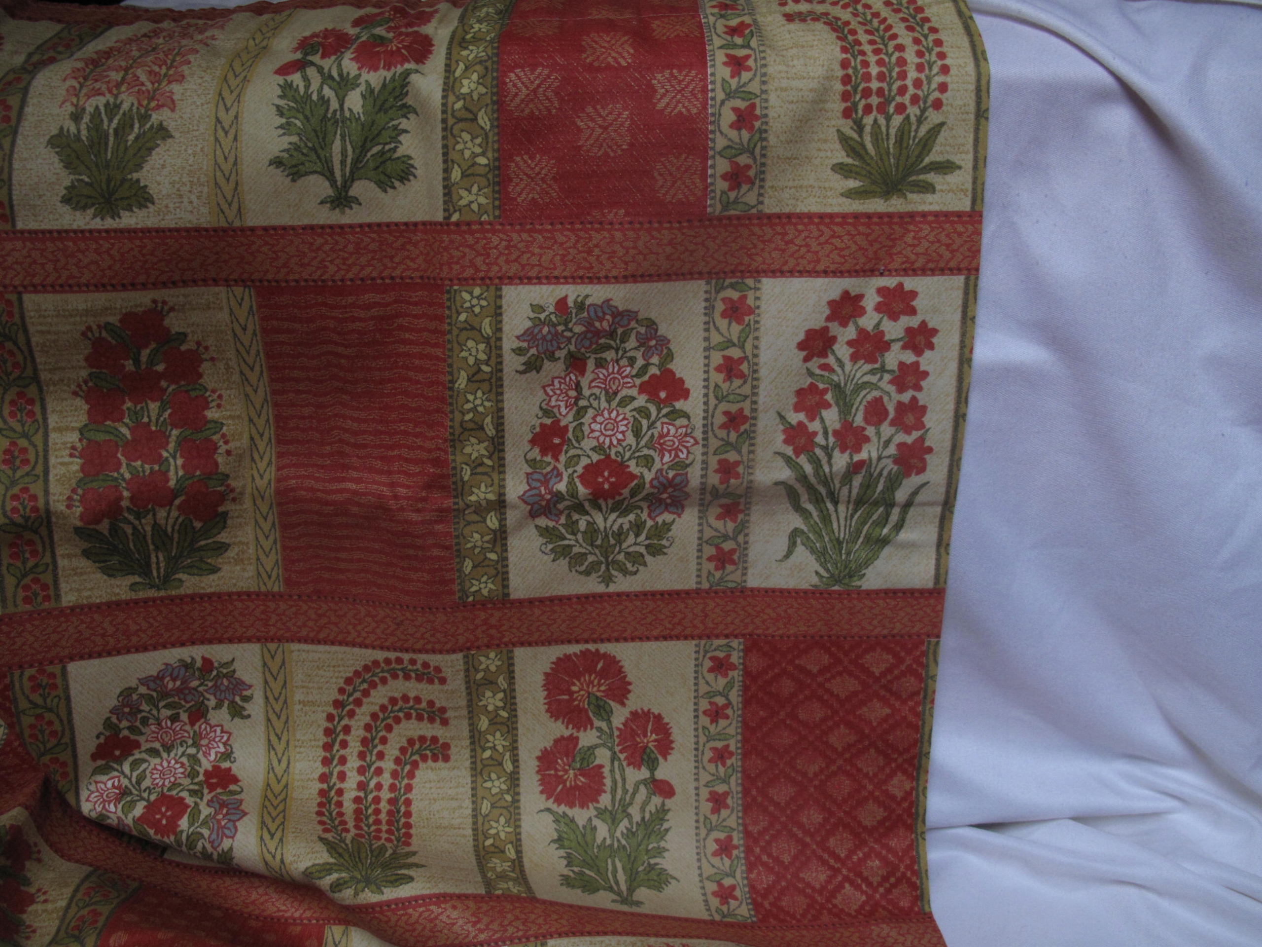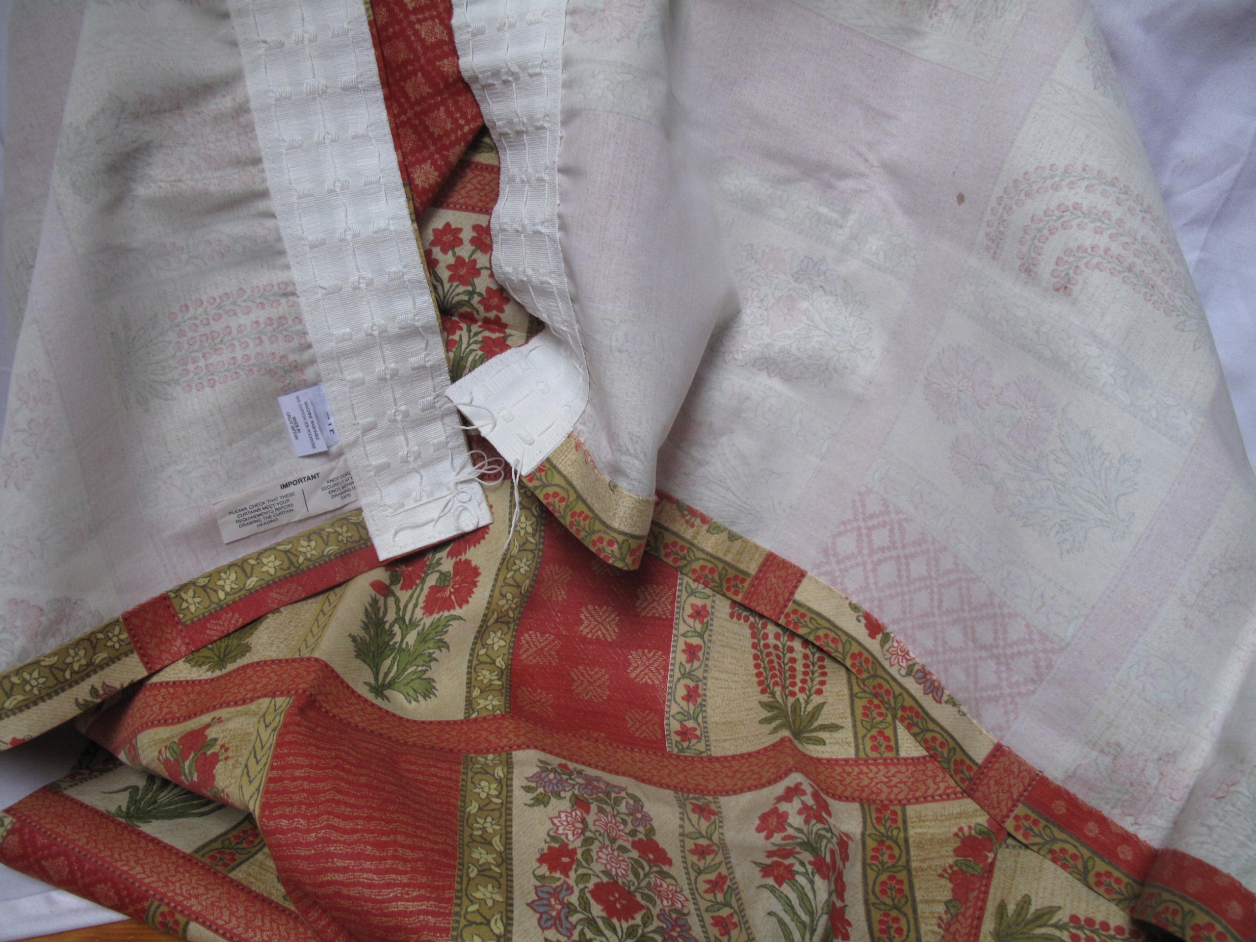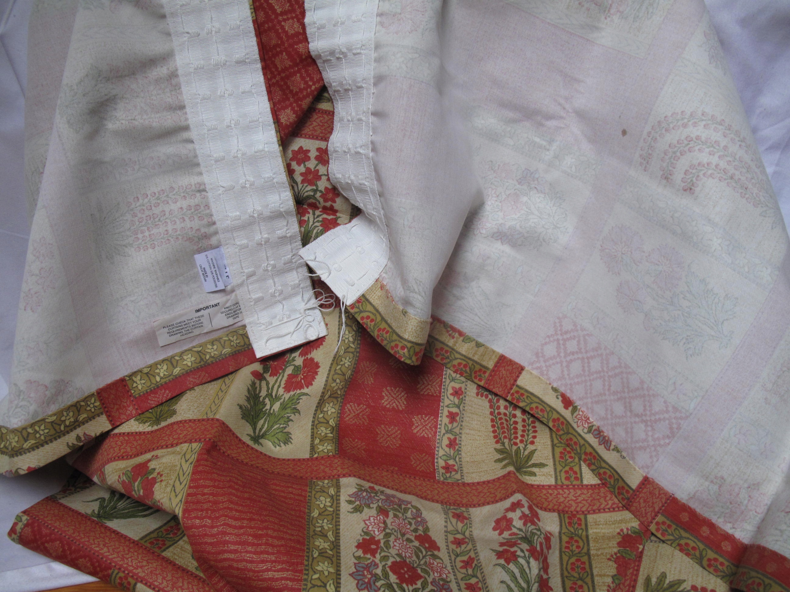 Tkaniny na moich aukcjach na ogół nie posiadają metek ani sygnatur / jeżeli mają zawsze je przedstawiam/, kieruję się wyłącznie własnym oglądem, mogę się mylić w ocenie materiału / prawdziwy czy sztuczny/ . Rzeczy jak nowe. Zasłona ma 135 cm wysokość x 219 cm szerokość. Z taśmą do zmarszczenia.Z grubszej, gładkiej bawełny.Kolory żywe. Oraz lambrekin -rękodzieło z dzierganymi wstawkami ma 40 x 128 cm.Z tkaniny z dodatkiem lnu.