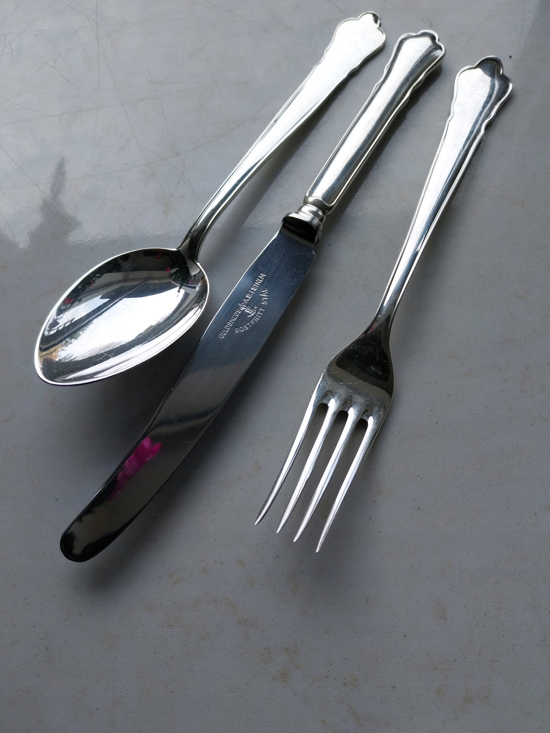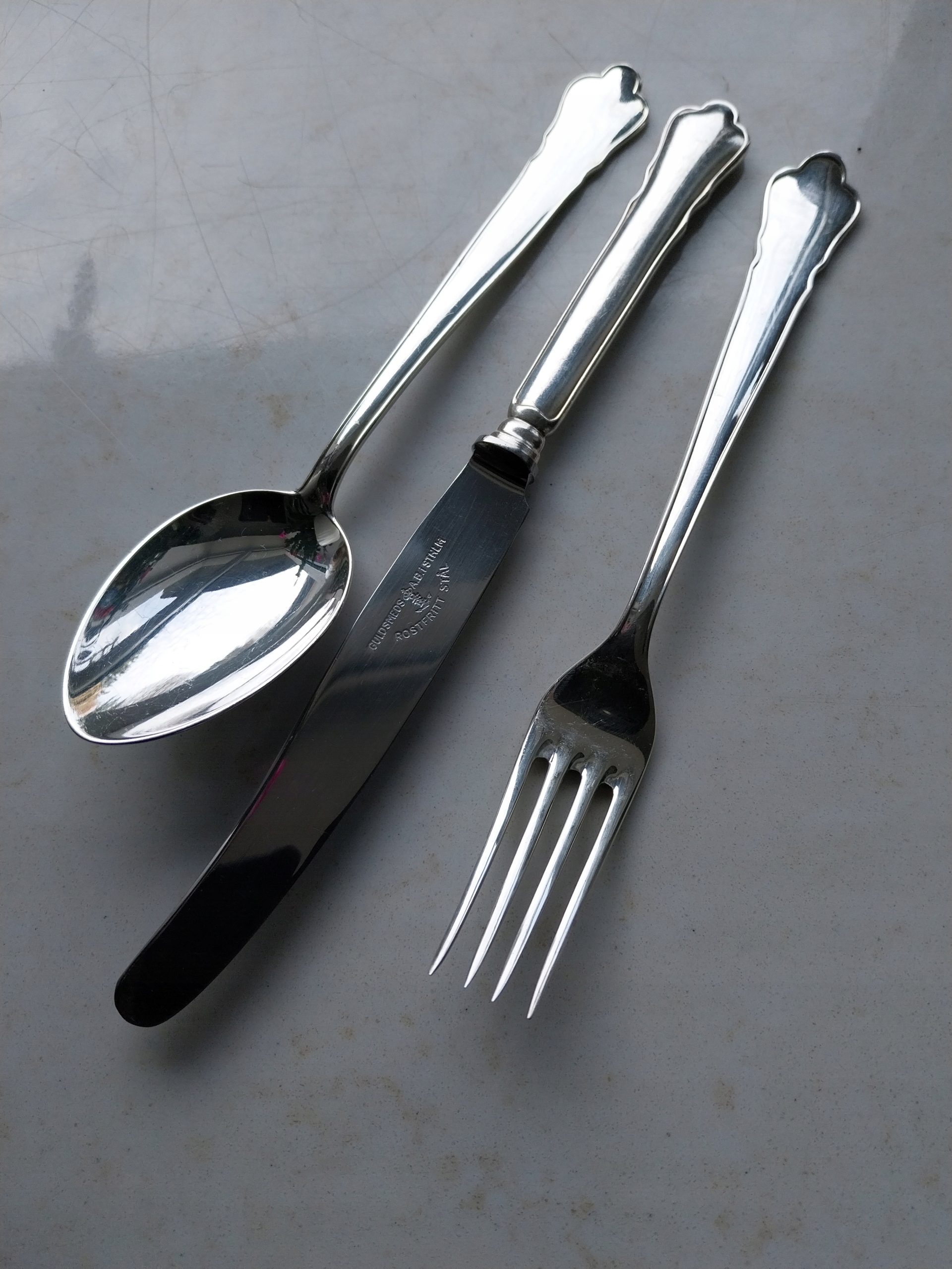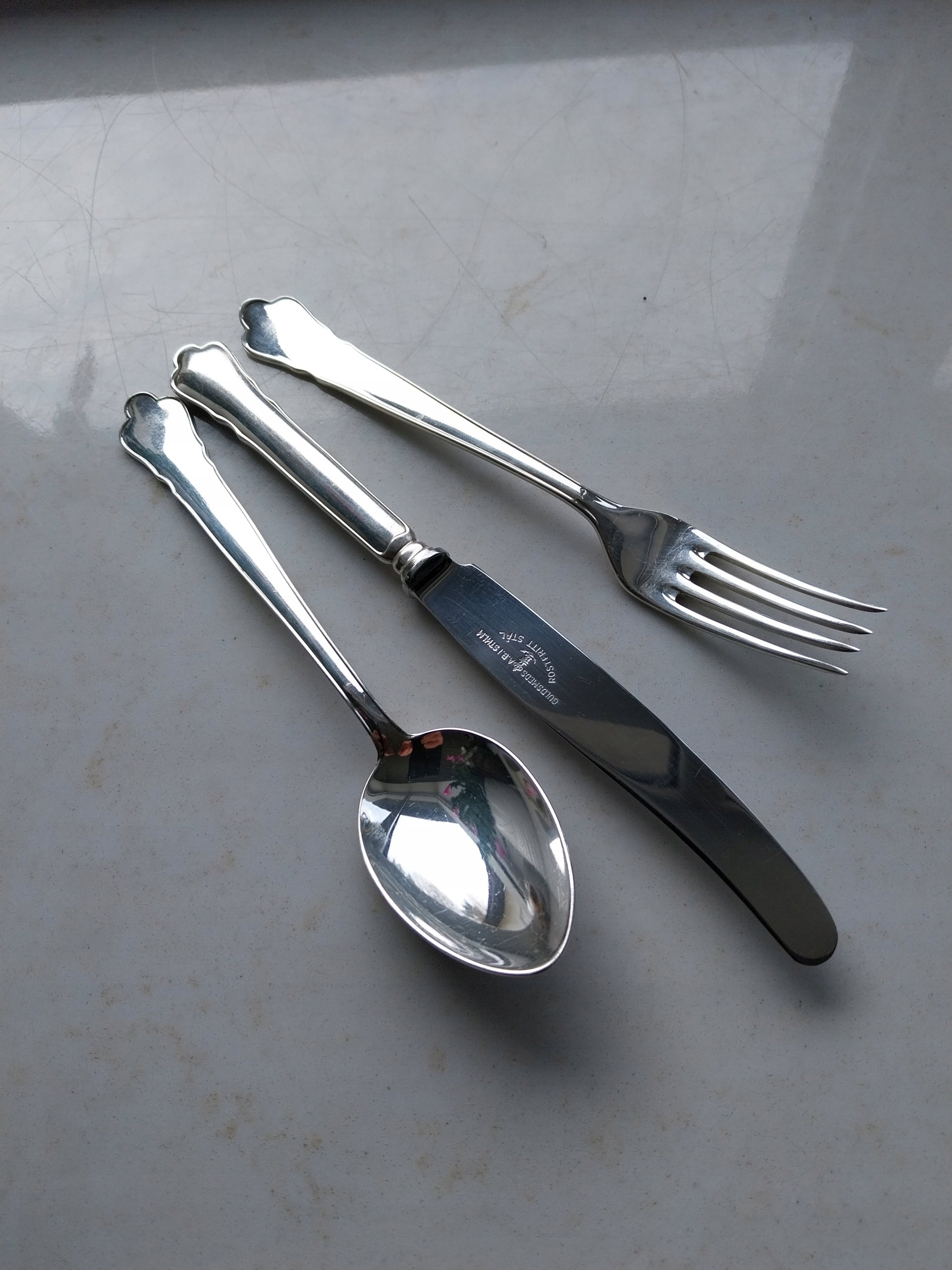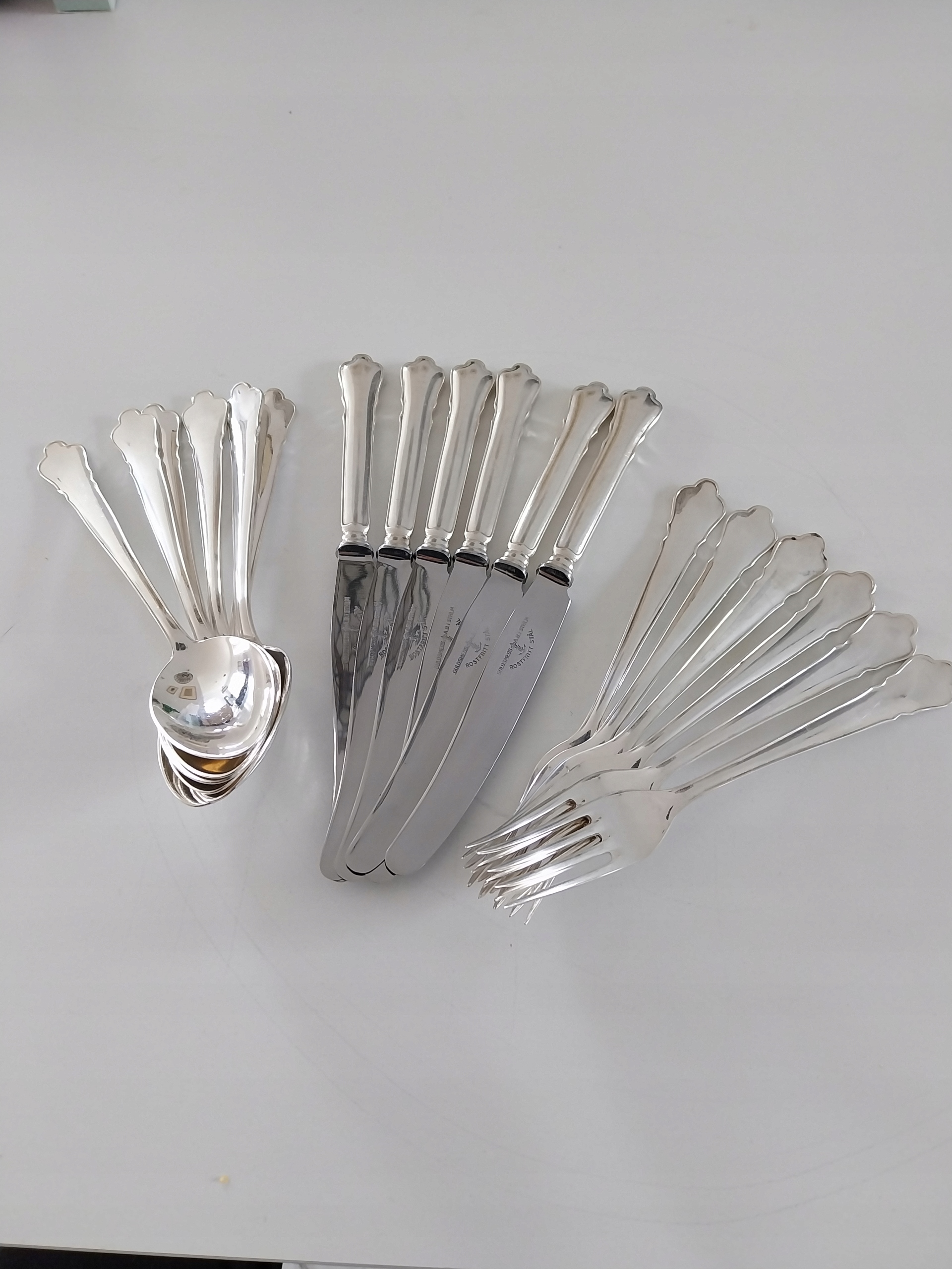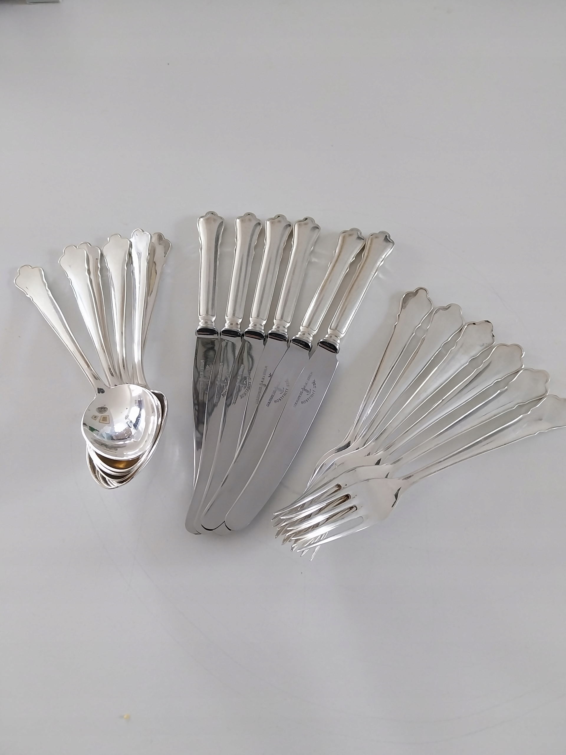 Ładne , stare sztućce wzór Chippendale , sygnowane , widelce długość 18 cm 6 sztuk , łyżki długość 18 cm 6 sztuk , noże ostra stal nierdzewna długość 21 cm 6 sztuk , stan jak na zdjęciu b.dobry