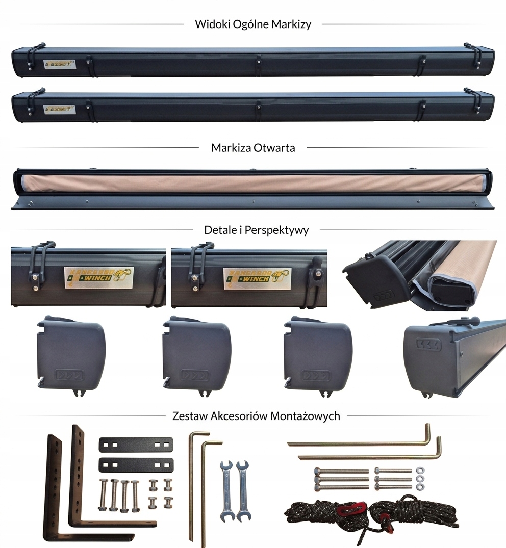 Wytrzymała markiza samochodowa 2,5 × 3 m z kasetą aluminiową – wodoodporny Oxford 600D PU 3000 mm, stabilne nóżki do 2,1 m, pełny zestaw montażowy w komplecie.