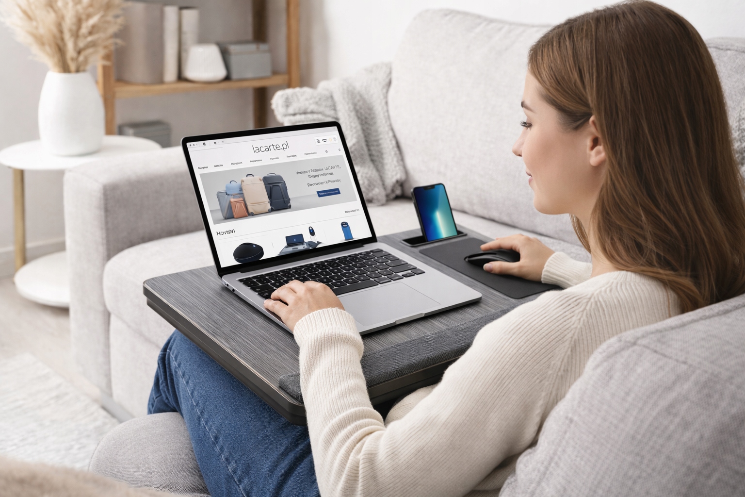 Dzięki osobnej przestrzeni na myszkę oraz dodatkowym slotom na urządzenia mobilne stolik pomaga lepiej zorganizować miejsce pracy. To wygodne rozwiązanie dla osób, które cenią funkcjonalność, porządek i komfort.