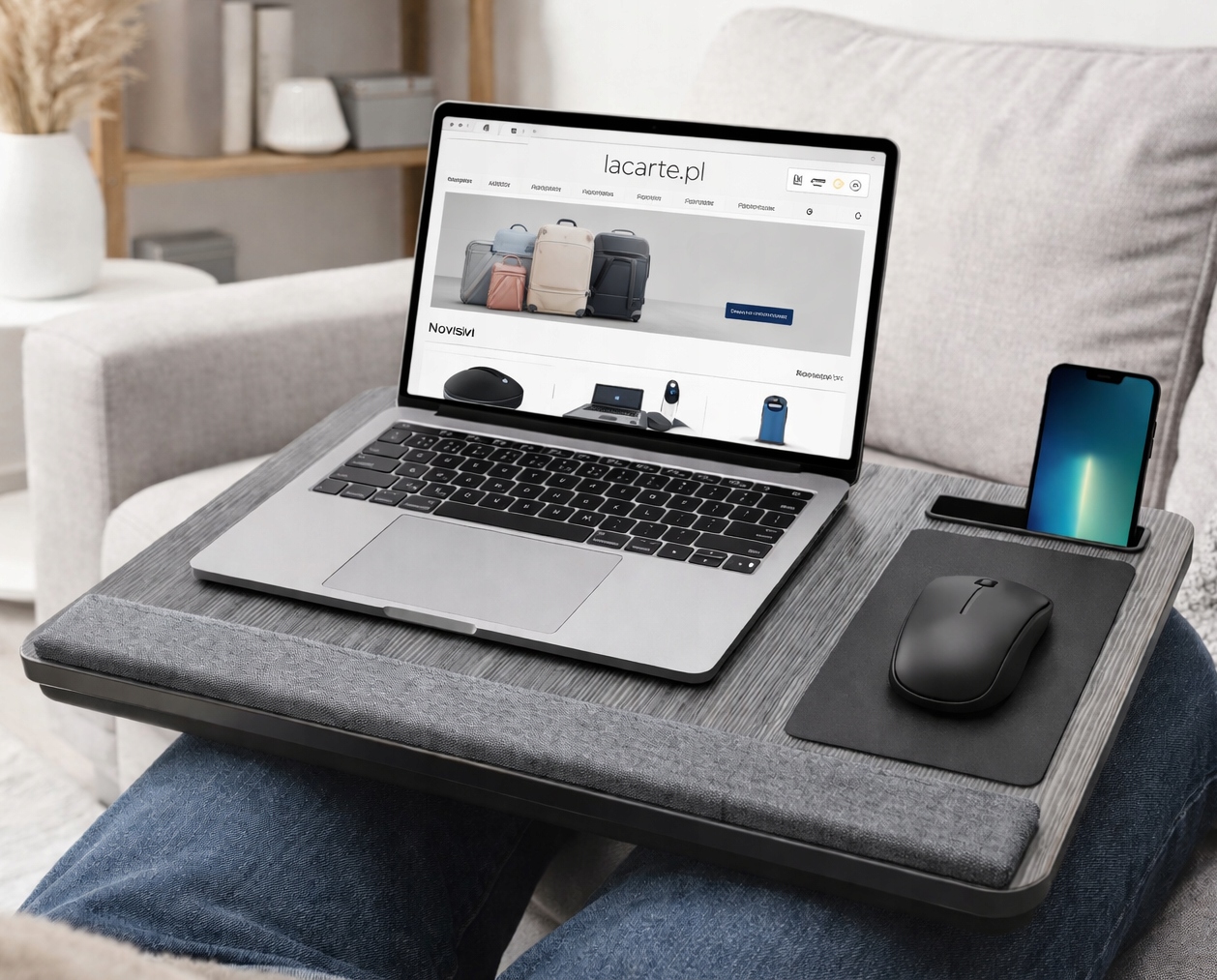 Wygodny i funkcjonalny stolik pod laptopa na kolana, który świetnie sprawdzi się podczas pracy, nauki, oglądania filmów i przeglądania internetu w łóżku, na kanapie lub w fotelu. To praktyczna podstawka pod laptopa do łóżka, która łączy komfort użytkowania z nowoczesnym wyglądem i przemyślanym układem blatu.