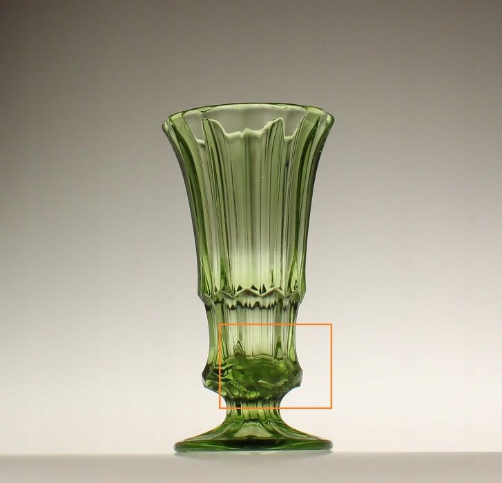 Wewnątrz ok. 3cm poniżej krawędzi wlewu blade smużki osadu. Pojedyncze wady włosowate i ryski użytkowe. Krawędź wlewu bez odprysków i chropowatości. Wewnątrz ukośne pęknięcie na długości ok. 5,5cm pokazane na zdjęciu. Mała nierówność/mikroubytek ok. 2mm na krawędzi podstawy w pobliżu jednego ze szwów formy ok. 2mm. Wazon nie przecieka.