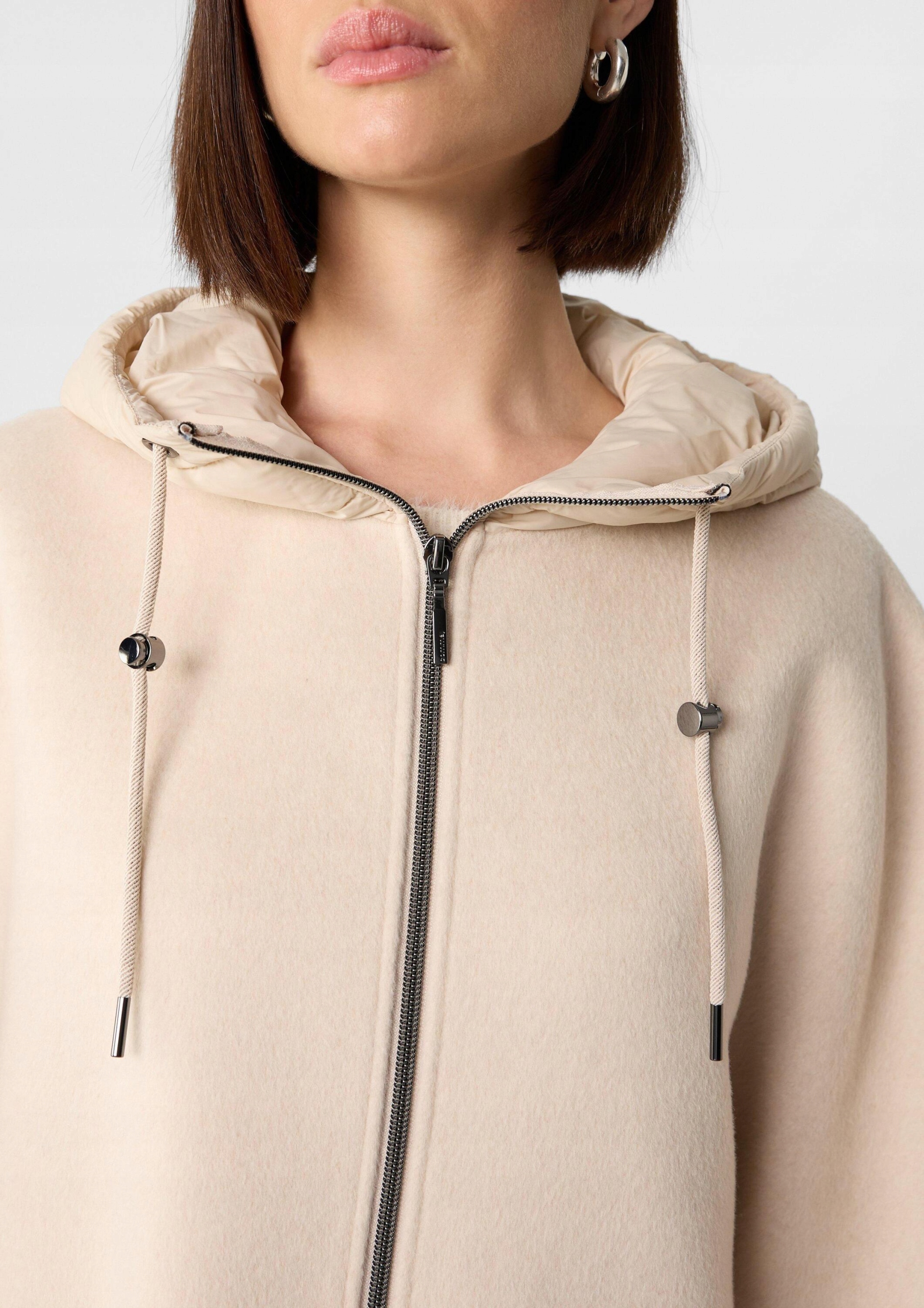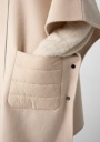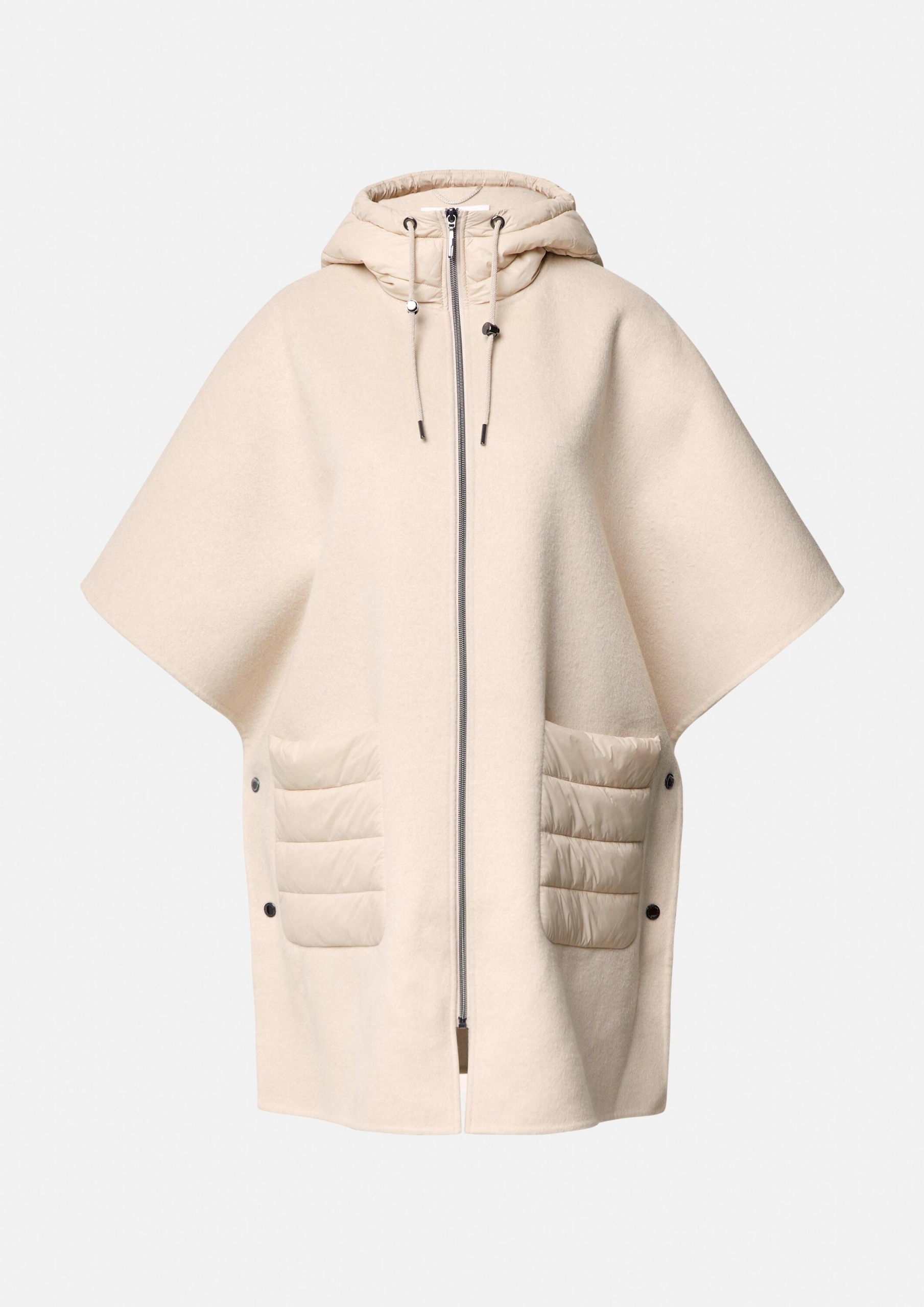 Będziesz emanować niewymuszonym szykiem w tej wełnianej pelerynie z wyściełanym kapturem i naszywanymi kieszeniami. Idealny na przygody na świeżym powietrzu, sport lub biznes, jego luźny krój i długość midi oferują wszechstronność. Stały kaptur ze sznurkiem dodaje praktyczności, a zapięcie na suwak zapewnia łatwość. Stylizuj ten dwulicowy element tkaniny, aby uzyskać swobodny, elegancki lub sportowy wygląd. Jej rękawy 3/4 i prosty brzeg dopełniają Twoją kobiecą sylwetkę.