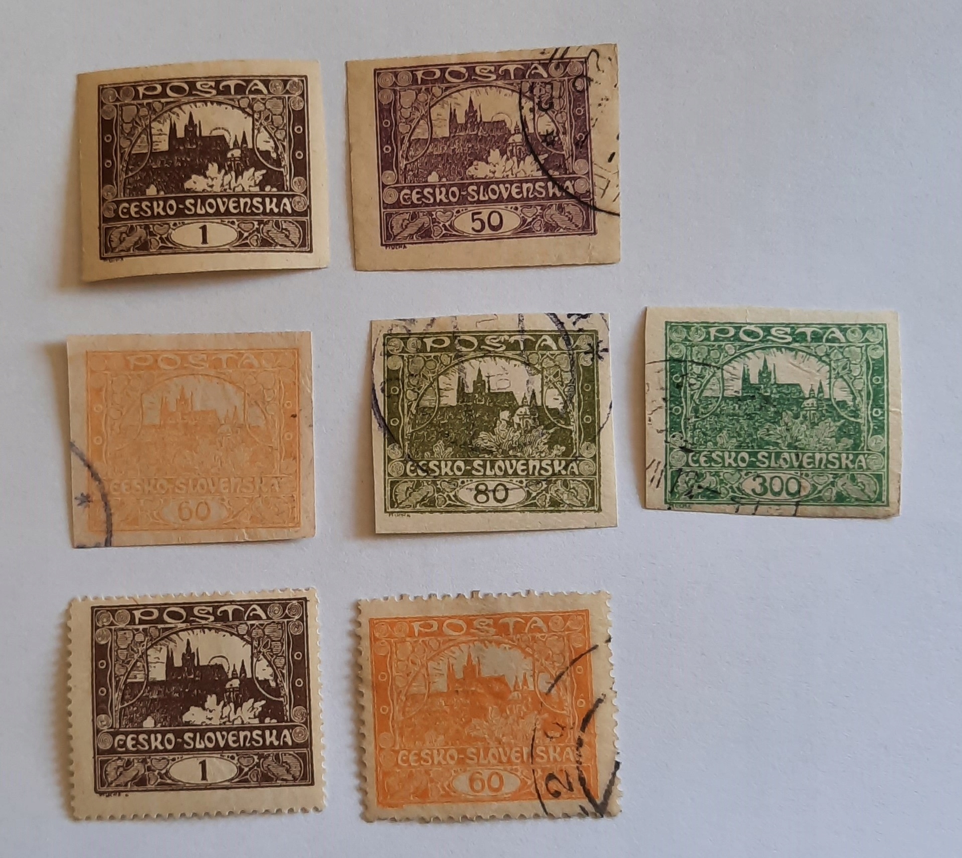 Siedem czechosłowackich znaczków z 1919 roku, z podlepkami, czyste i kasowane. Stan: zdjęcie.