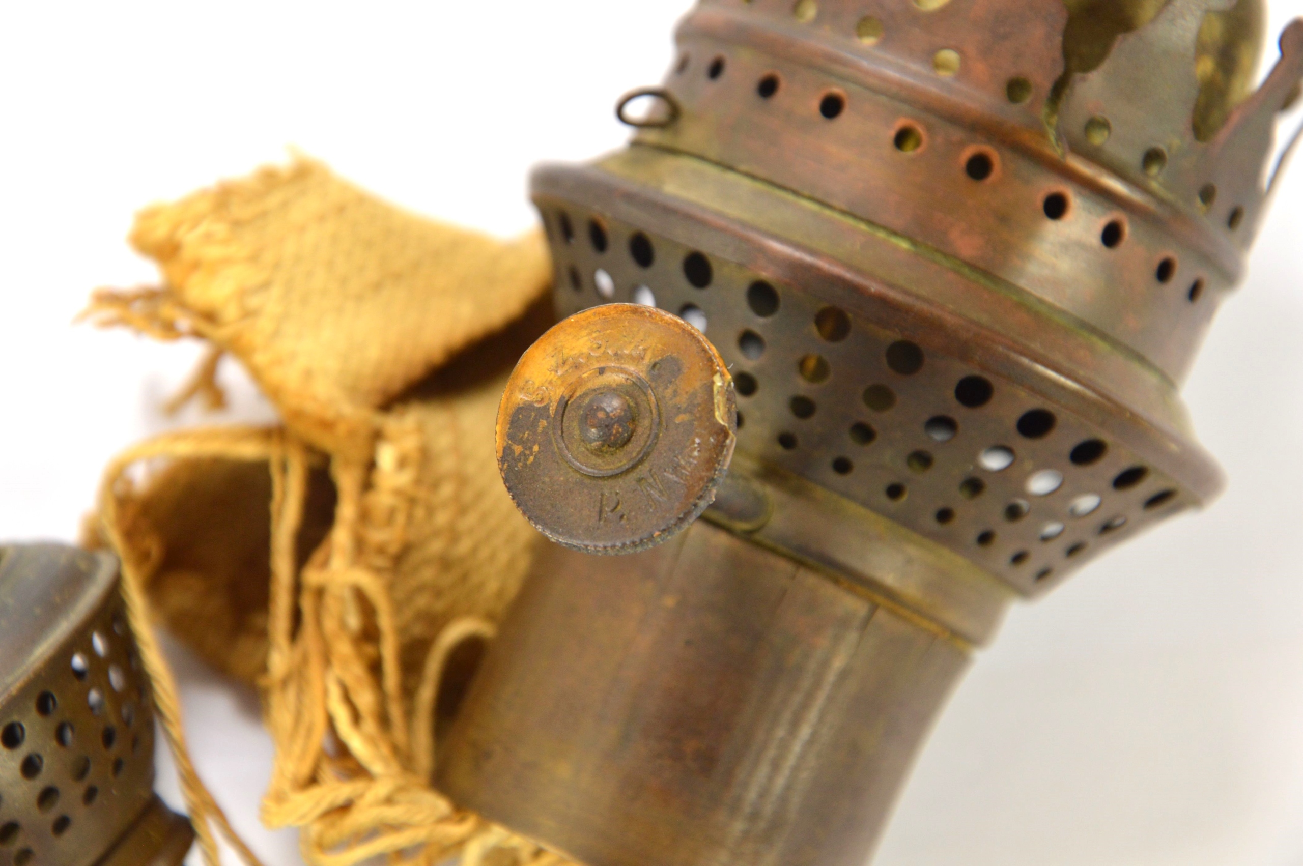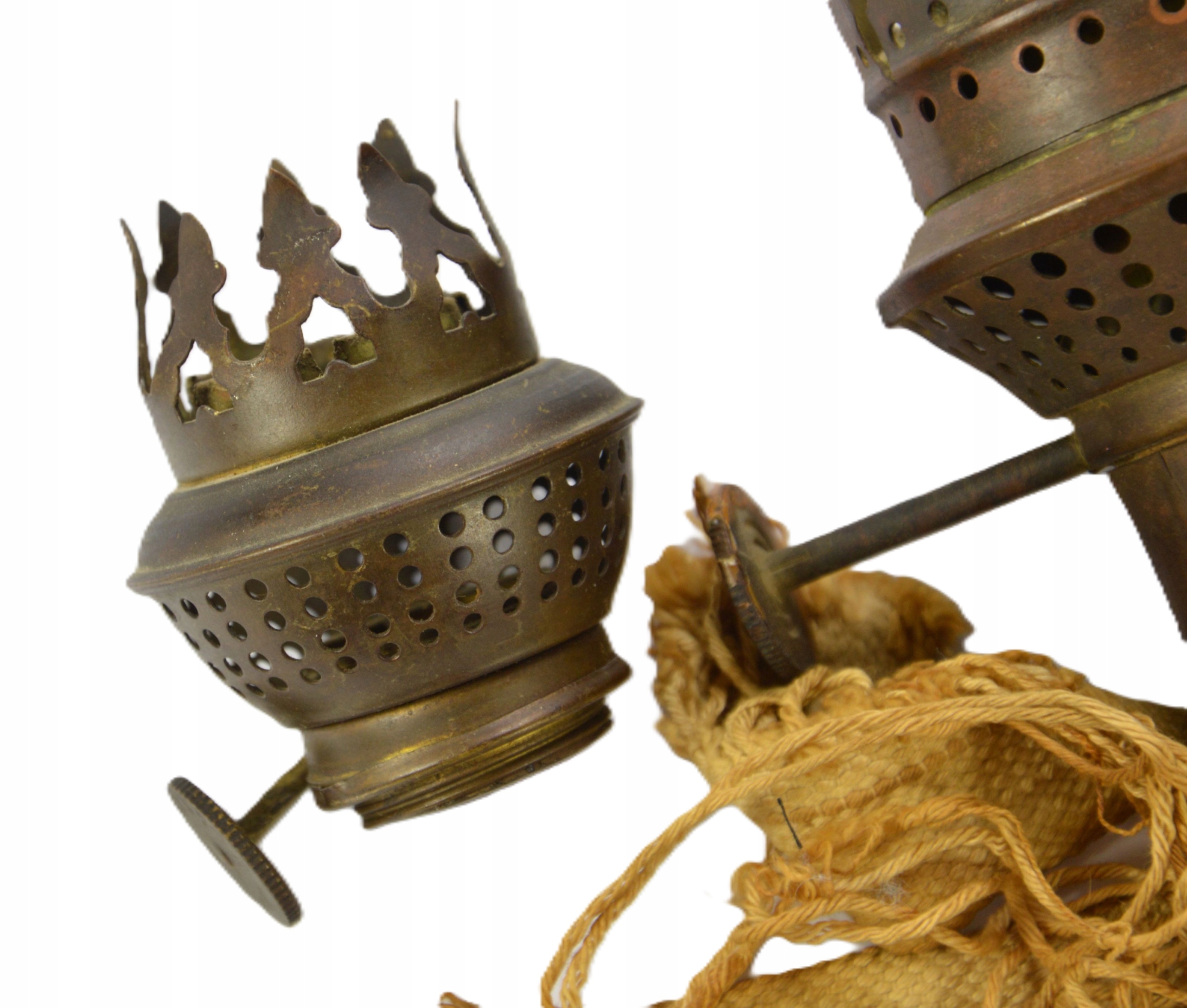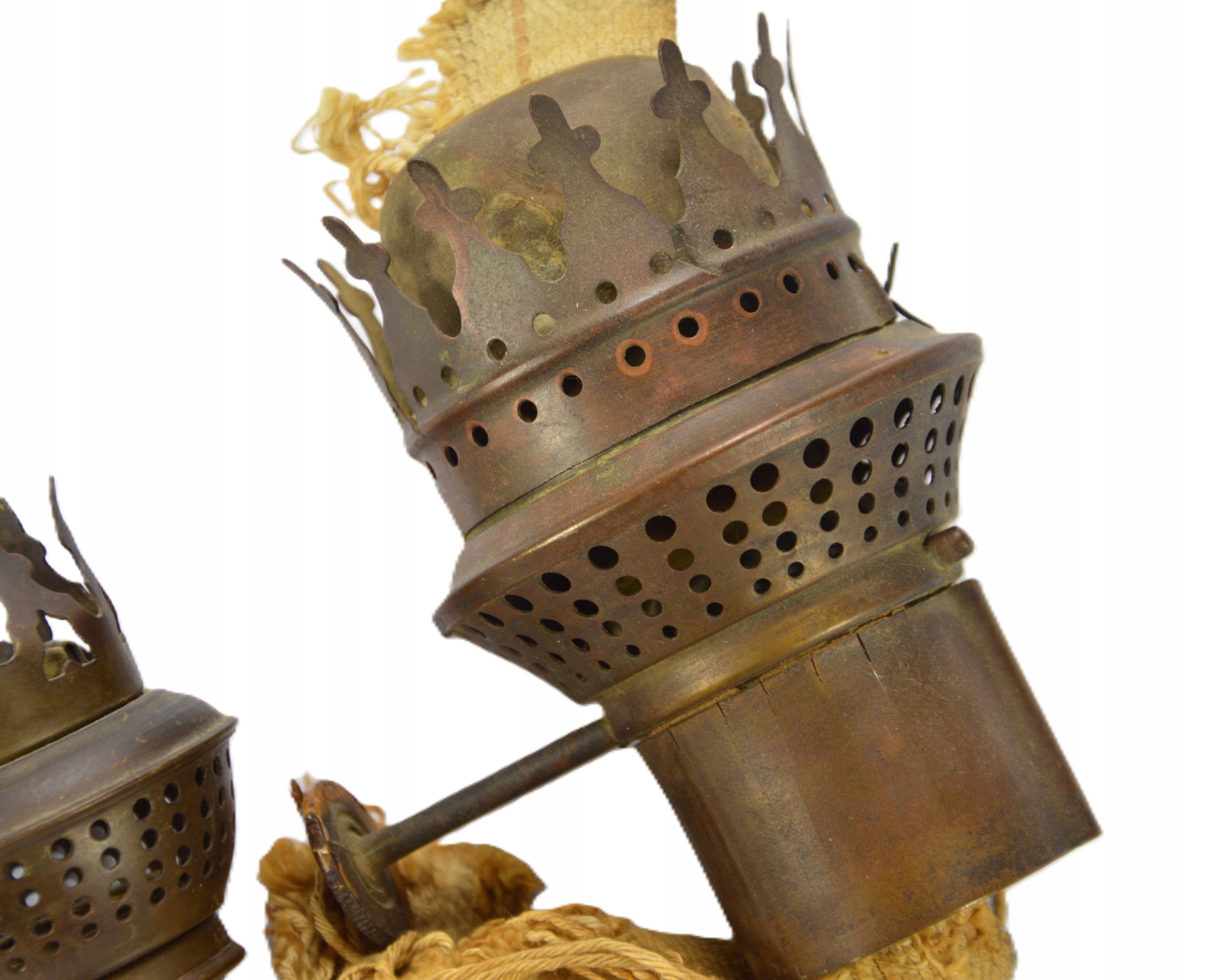 Stare brennery do lamp naftowych. W zestawie dwie szt., sygnowane PKP oraz S.Z.S.M. Brenner z knotem sprawny, mniejszy bez środka.