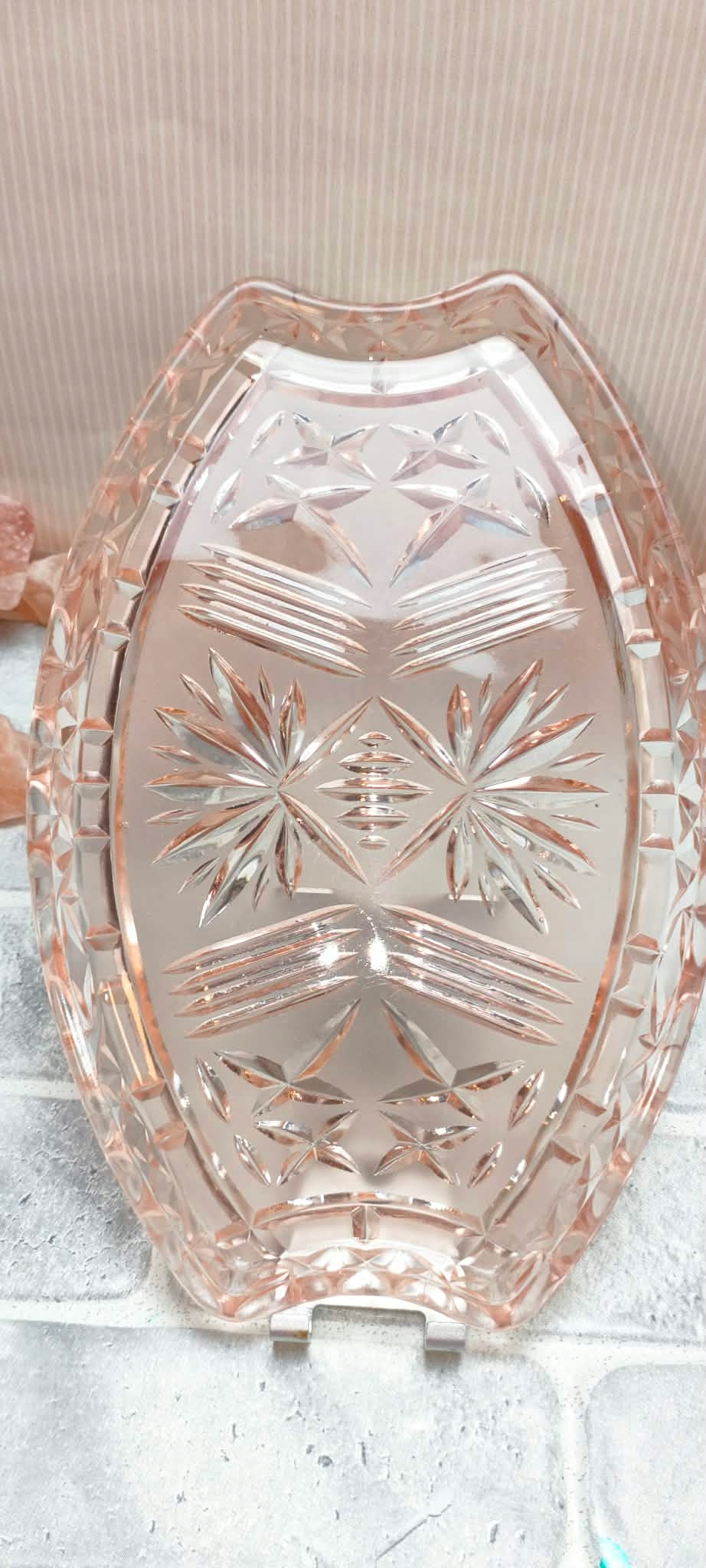 Przedmiotem sprzedaży jest przepiękna, owalna patera wykonana z grubego szkła prasowanego w poszukiwanym kolorze rozalinowym (subtelny róż/łososiowy). To autentyczny wyrób z okresu PRL, który dzięki swojej unikalnej barwie i geometrycznym tłoczeniom stał się ikoną polskiego wzornictwa użytkowego.