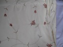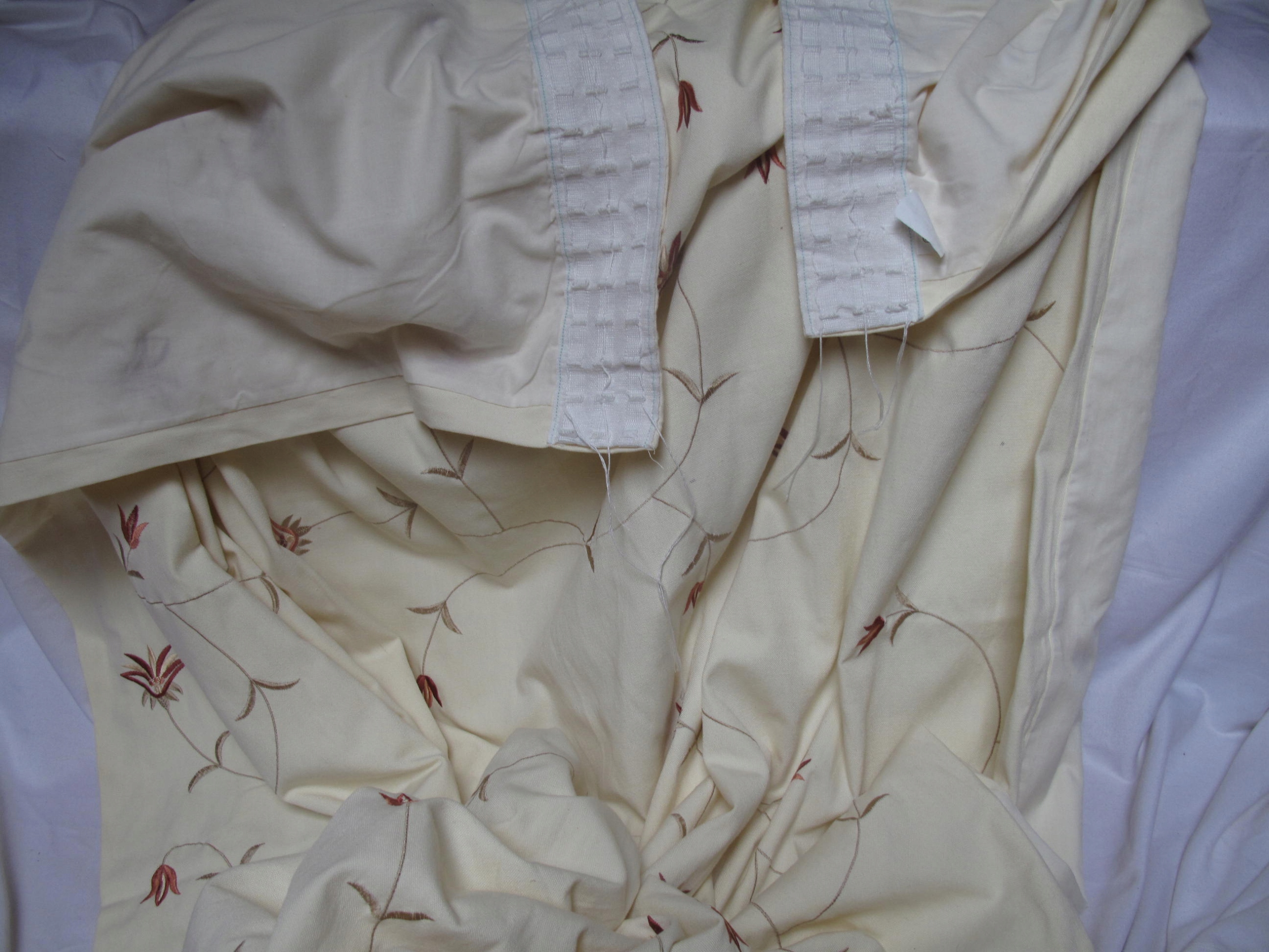 Tkaniny na moich aukcjach na ogół nie posiadają metek ani sygnatur / jeżeli mają zawsze je przedstawiam/, kieruję się wyłącznie własnym oglądem, mogę się mylić w ocenie materiału / prawdziwy czy sztuczny/ . Zasłony są dwie, każda ma 166 cm szerokość x 183 cm wysokość, z taśmami do zmarszczenia i podszewkami . Z 30% bawełny, średniej grubości, gładka, haftowana, tło kremowe. Rzecz używana,minimalne skazy na tkaninie, prawie niewidoczne. Ciężkie.