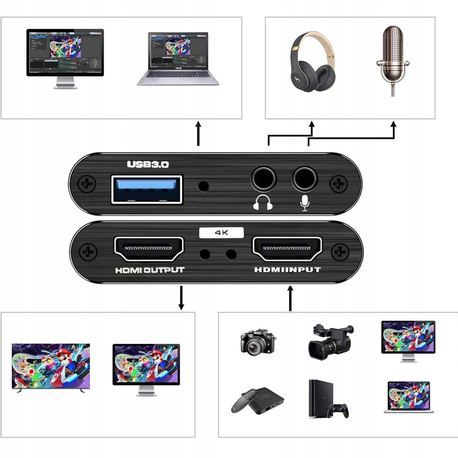 Rejestruje źródło wideo o rozdzielczości do 1080p, kompatybilne ze wszystkimi urządzeniami HDMI, takimi jak PS4, PS3, Xbox One, Xbox 360, Wii U, Nintendo Switch, DVD, lustrzanki cyfrowe, aparaty, kamery bezpieczeństwa i dekodery.