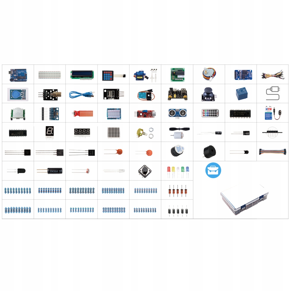 Nasz zestaw startowy Arduino jest dostępny w 6 językach: niemieckim, polskim, angielskim, francuskim, włoskim, hiszpańskim i rumuńskim. Kompletny zestaw Arduino zawiera 248 elementów elektronicznych: płytkę kontrolera UNO, płytkę stykową, wyświetlacz LCD, zasilacz, miniaturową płytkę rozszerzeń, moduł przyspieszenia trójosiowego, czujnik temperatury i wilgotności, zestaw rezystorów, diody LED, zasilacz, zestaw kondensatorów i inne elementy elektroniczne.