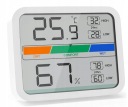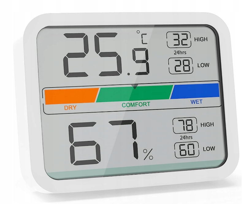 Dokładny cyfrowy termometr z higrometrem pokazuje najwyższą i najniższą wilgotność powietrza oraz temperaturę, dzięki czemu zawsze można dostosować się do zmian otoczenia. Z tyłu znajduje się przycisk umożliwiający ustawienie stopni Celsjusza lub barencji.