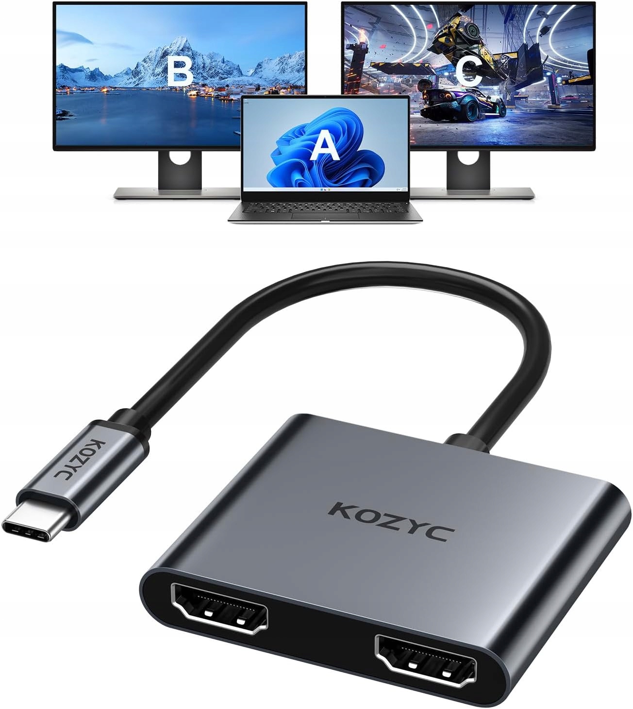 KOZYC Dual HDMI Adapter to wysokiej klasy rozdzielacz sygnału USB-C, który pozwala na podłączenie dwóch niezależnych monitorów do jednego portu w laptopie lub komputerze. Urządzenie wspiera zaawansowane tryby wyświetlania, w tym MST dla systemu Windows, co znacząco podnosi komfort pracy wielozadaniowej.