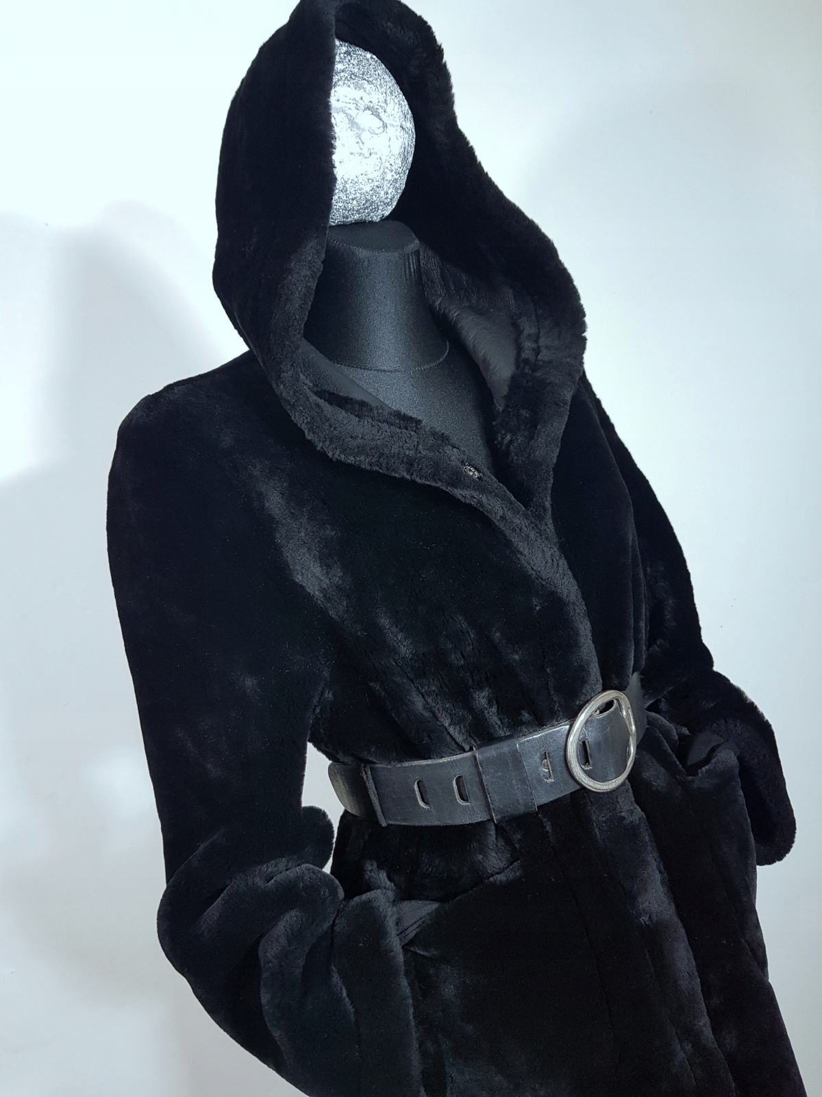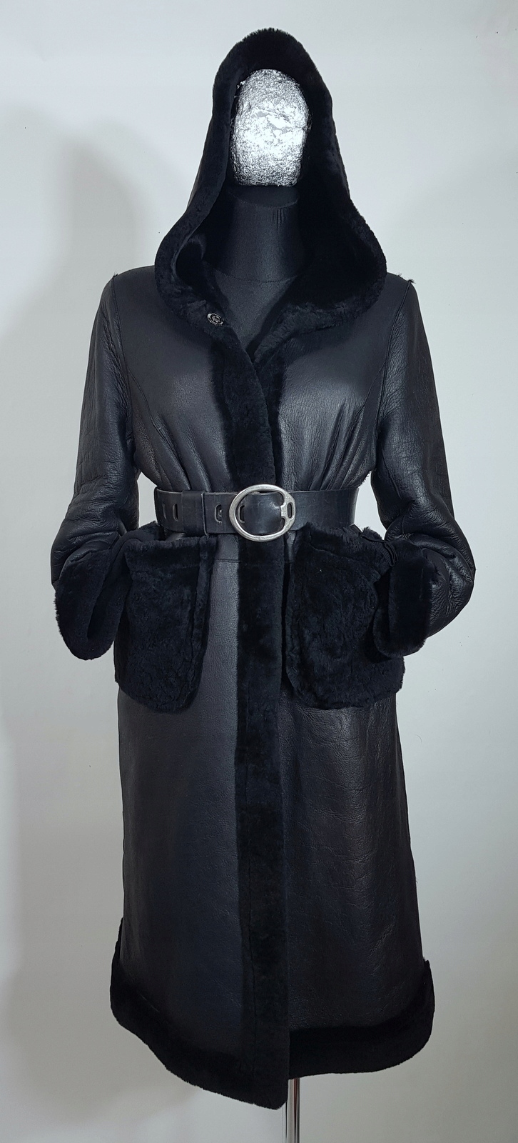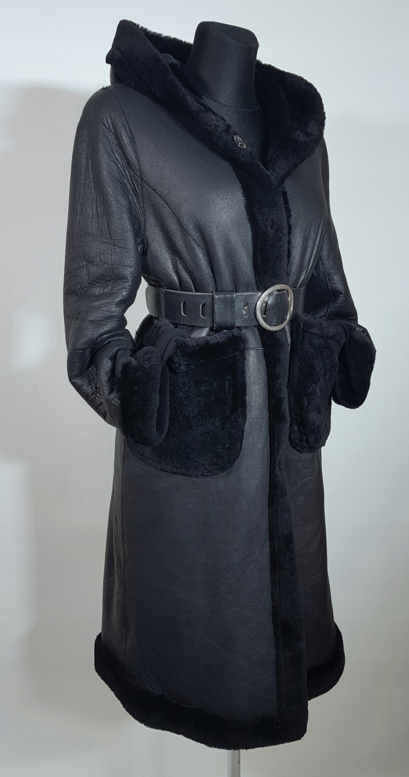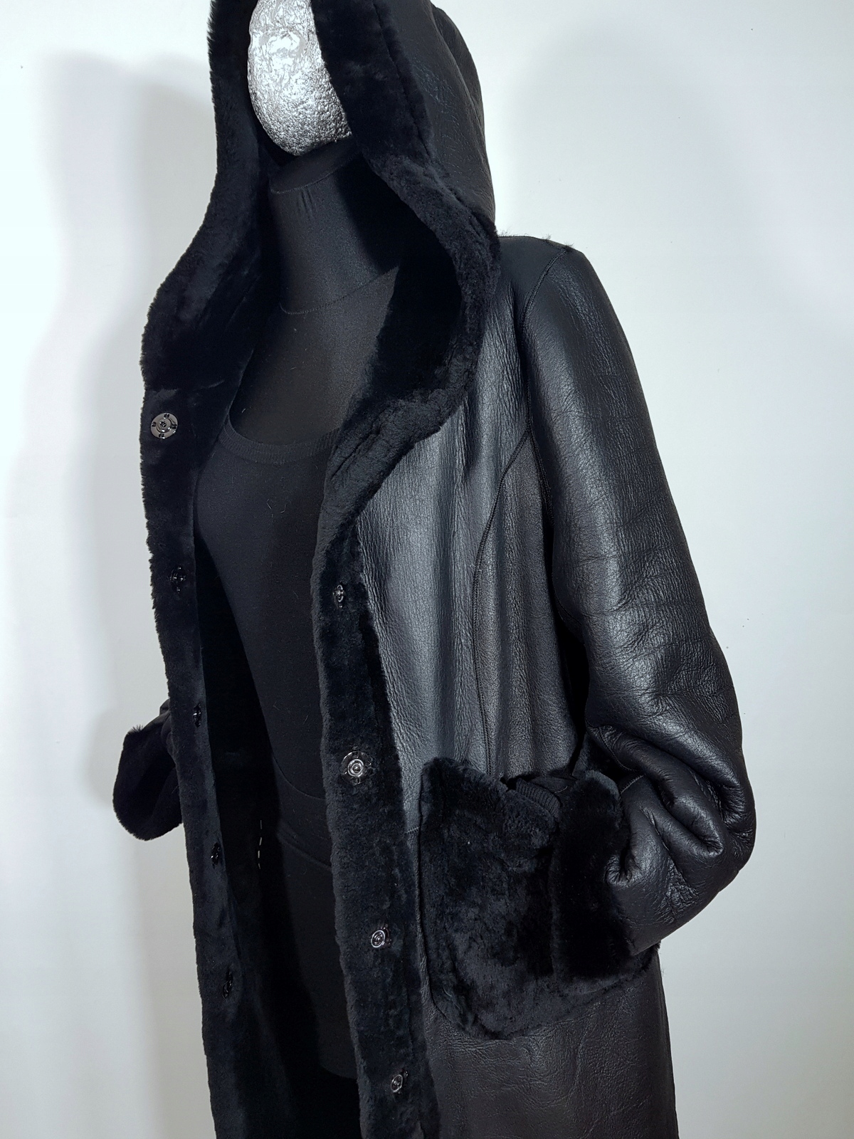 Oferuję do sprzedania dwustronny minimalistyczny oversizowy leciutki kożuszek/futerko wykonany z cieniutkiej i miękkiej naturalnej skóry jagnięcej  ,przy szyi obszerny kaptur, z jednej strony skóra z powłoką zabezpieczającą przed przemoczeniem ,z drugiej strony wełna ,kolor czarny, można nosić swobodnie lub spiąć dodatkowo paskiem.Zapinany na zatrzaski,dwie kieszenie ,fason prosty,minimalistyczny,można nosić swobodnie lub dodatkowo spiąć w talii paskiem.