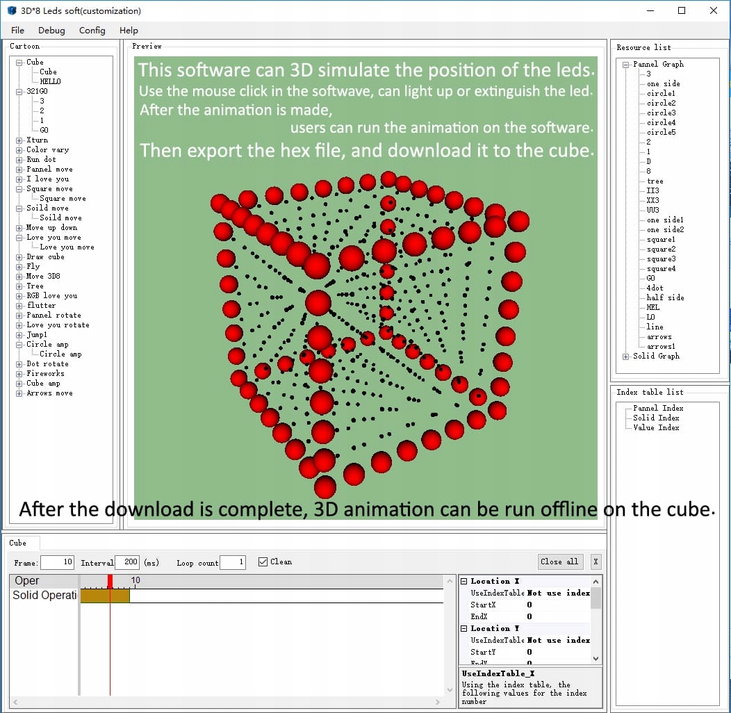 Wbudowane, sterowane animacje: Ponad 20 rodzajów pięknych efektów świetlnych na płycie głównej kostki świetlnej wyświetla się po przylutowaniu i podłączeniu do zasilania USB. Animację kostki świetlnej można edytować za pomocą dostarczonego przez nas oprogramowania 3D. Nasze oprogramowanie 3D tworzy plik HEX. Po pobraniu do kostki świetlnej, animację 3D można uruchomić i edytować w trybie offline. Nie są wymagane żadne umiejętności programowania w języku C.