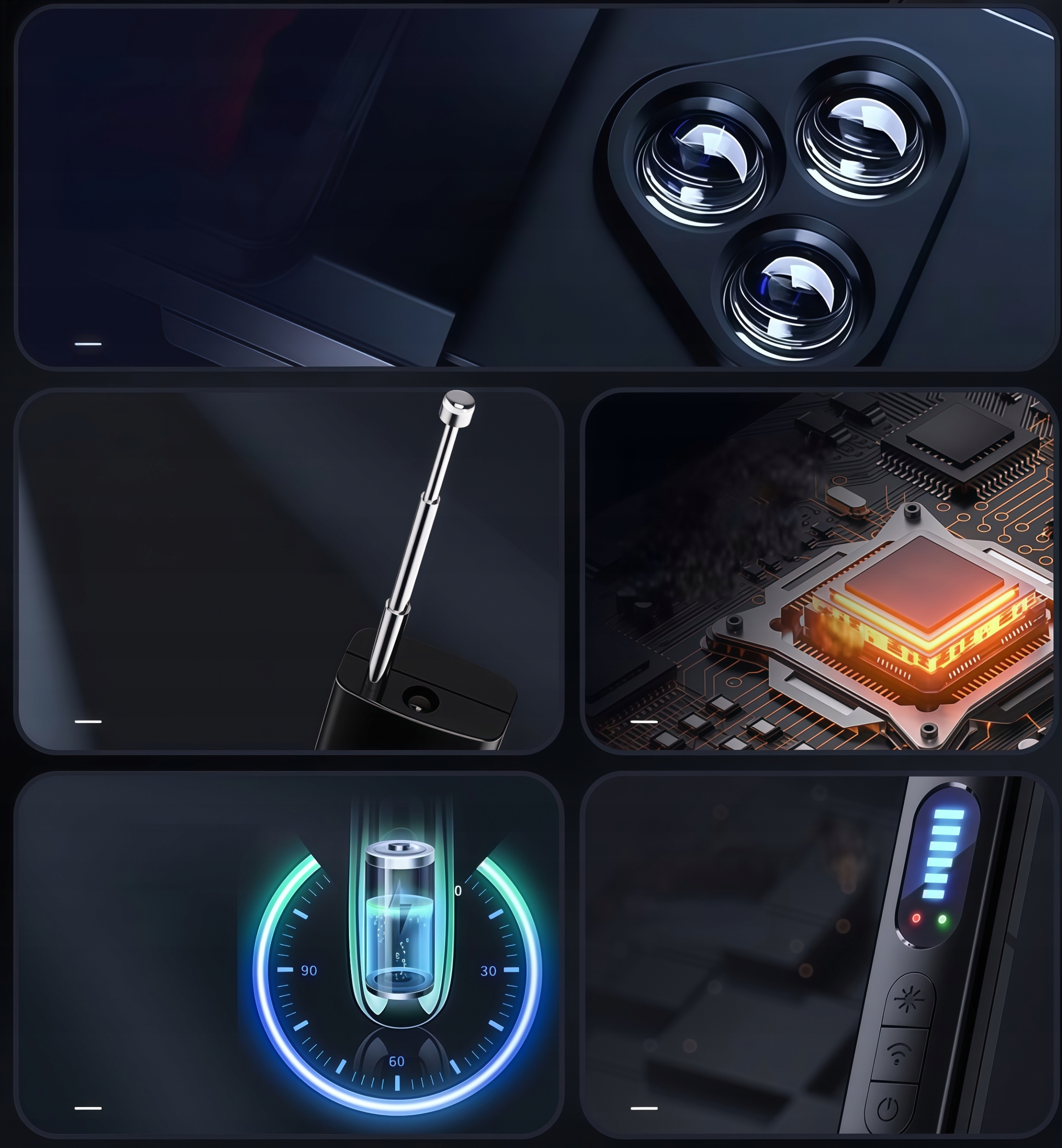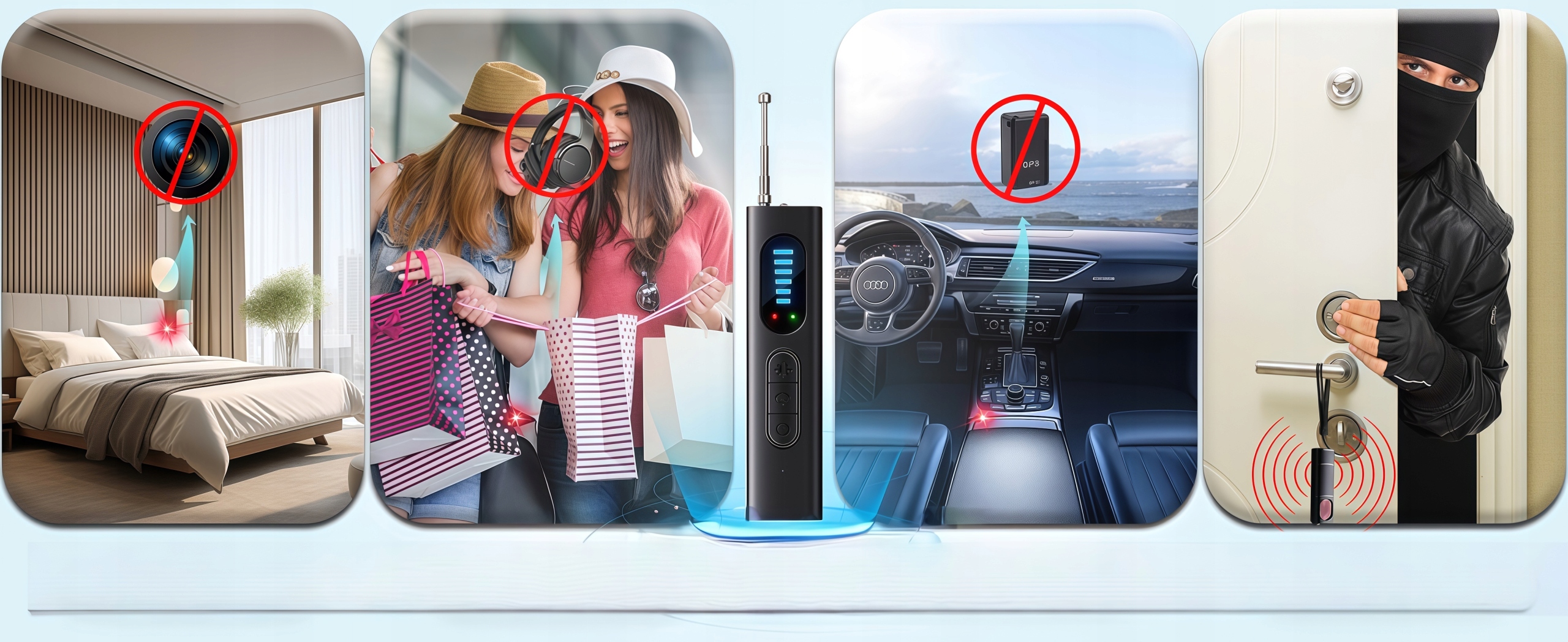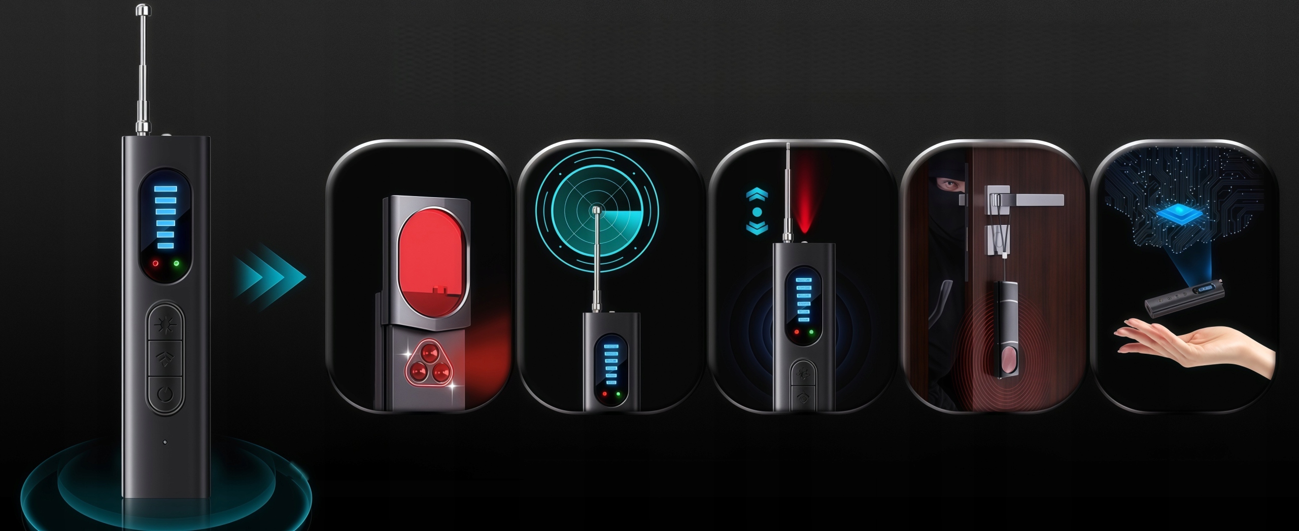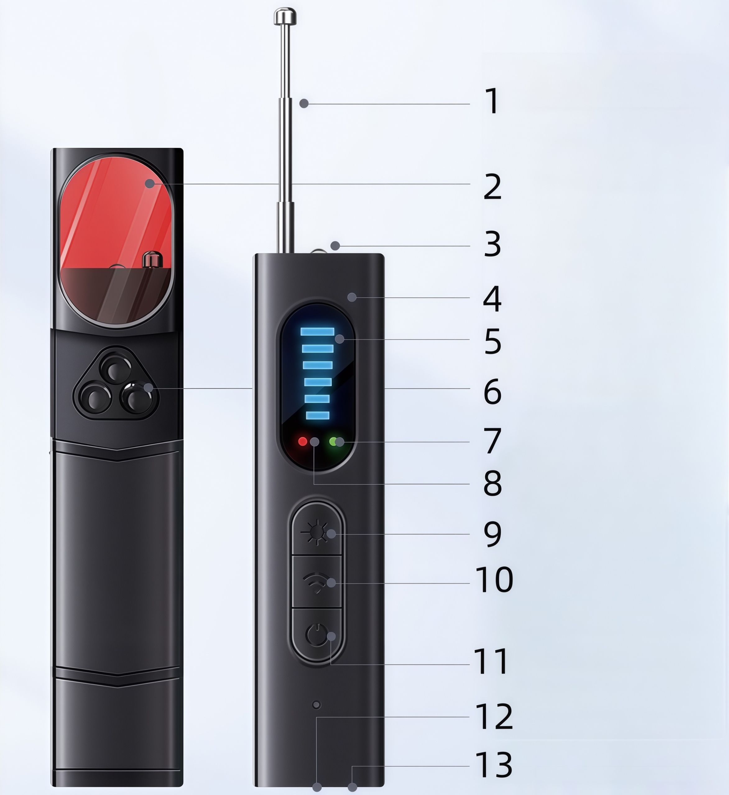 Wbudowany silny detektor fal elektromagnetycznych precyzyjnie wychwytuje sygnały przesyłane przez różnego rodzaju urządzenia podsłuchowe i automatycznie uruchamia alarm