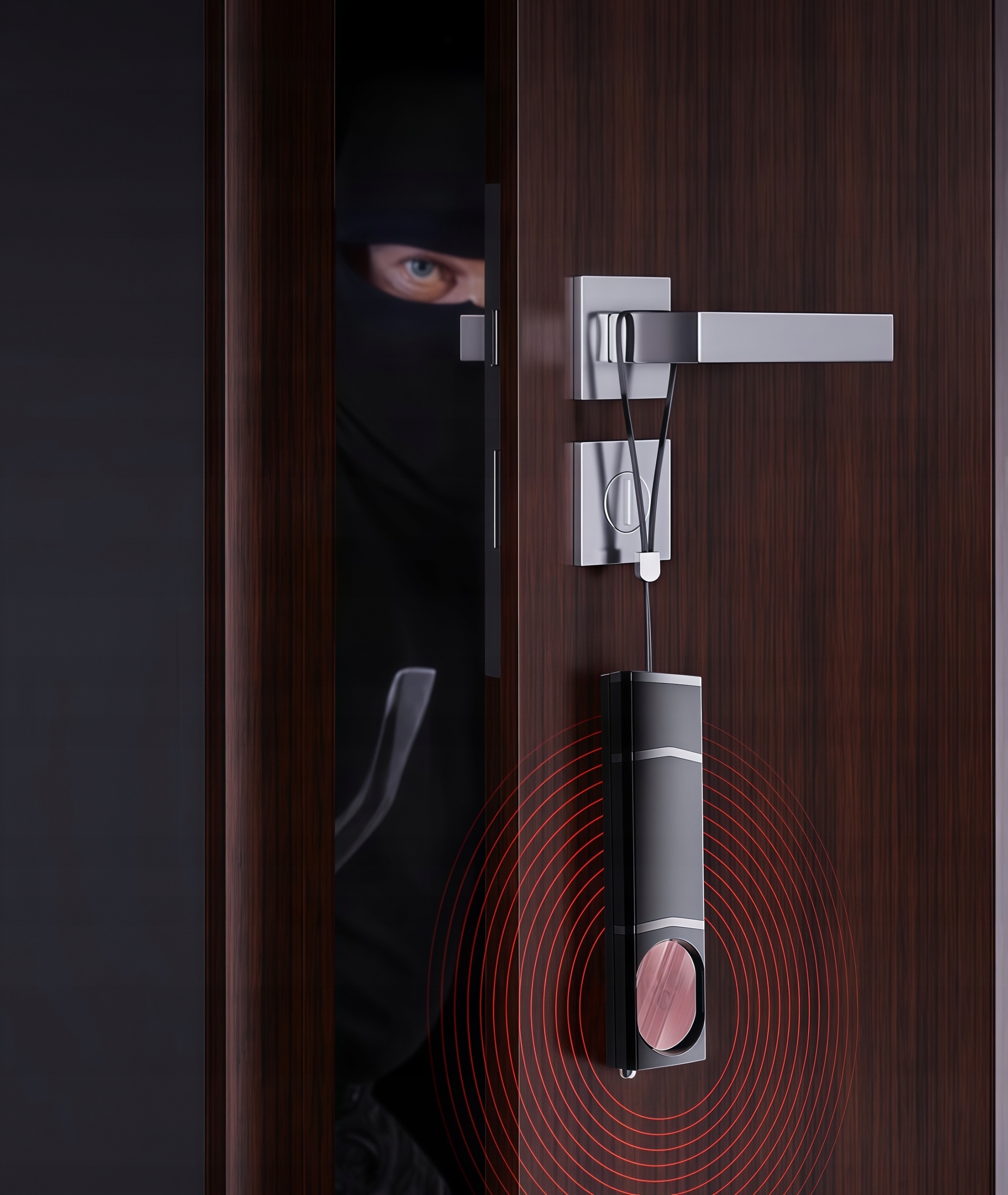 Po włączeniu trybu antywłamaniowego należy zawiesić czujnik na klamce drzwi. W przypadku wykrycia zewnętrznego nacisku czujnik uruchomi głośny alarm, odstraszając intruzów.