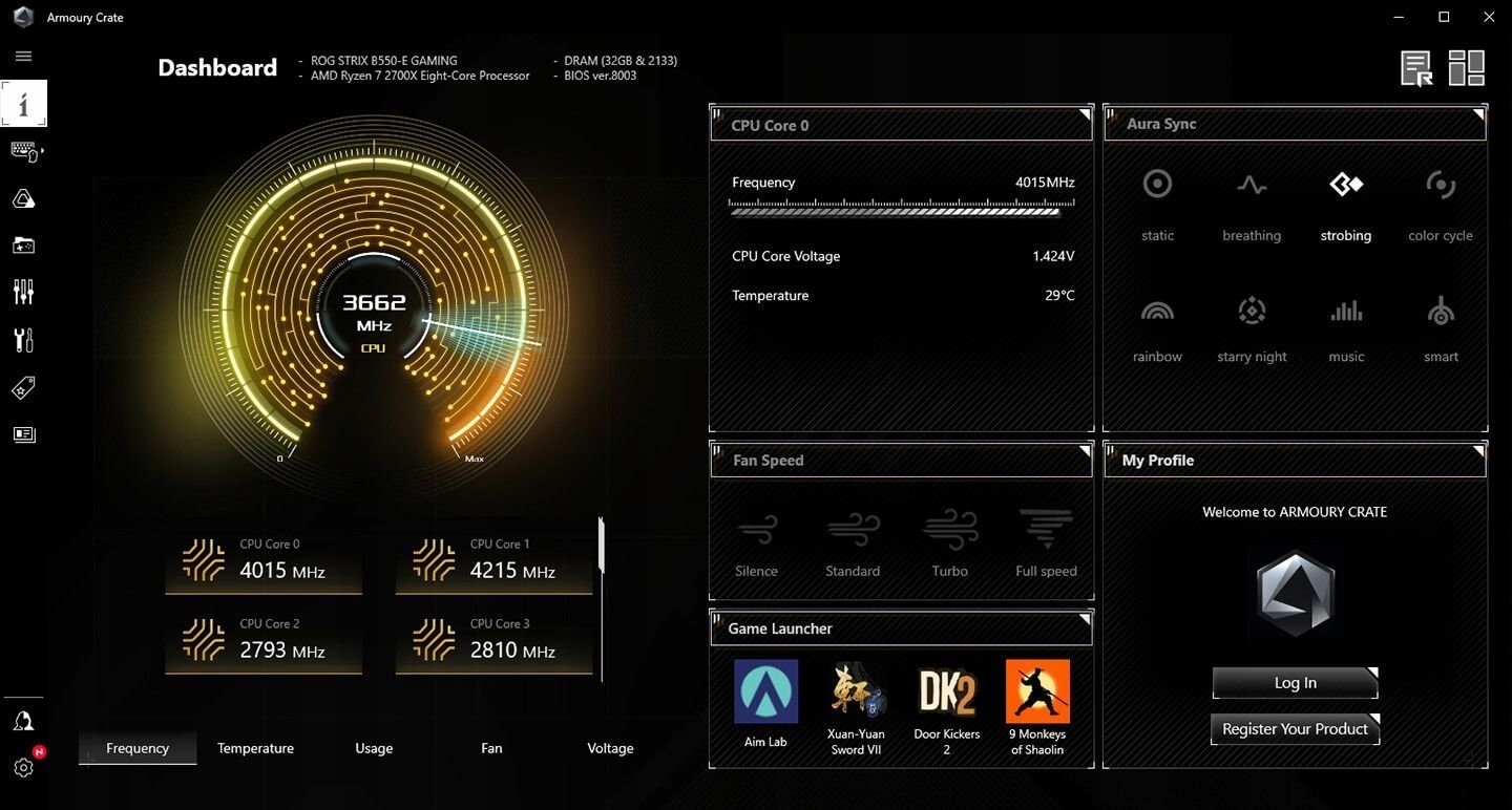 Ekskluzywne oprogramowanie ASUS Armoury Crate centralizuje kontrolę nad wszystkimi obsługiwanymi produktami do gier. Pojedynczy intuicyjny interfejs pozwala dostosować oświetlenie RGB dla wszystkich kompatybilnych urządzeń i połączyć je z Aura Sync w celu uzyskania jednolitego oświetlenia. Wyświetla także informacje i umożliwia kontrolę nad nim. Armoury Crate umożliwia również łatwą rejestrację produktu i zawiera sekcję aktualności, dzięki której możesz pozostać w kontakcie ze społecznością graczy.