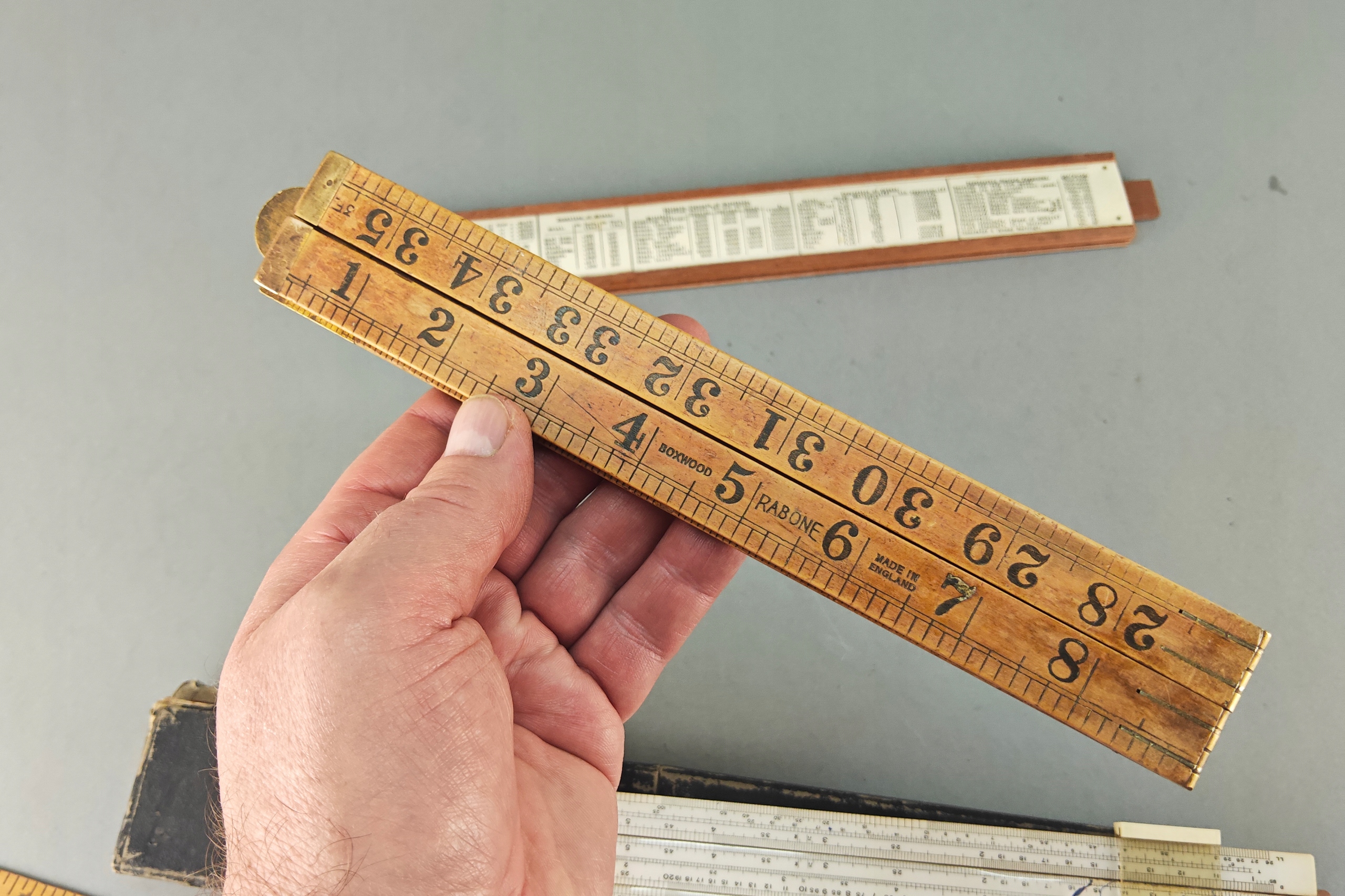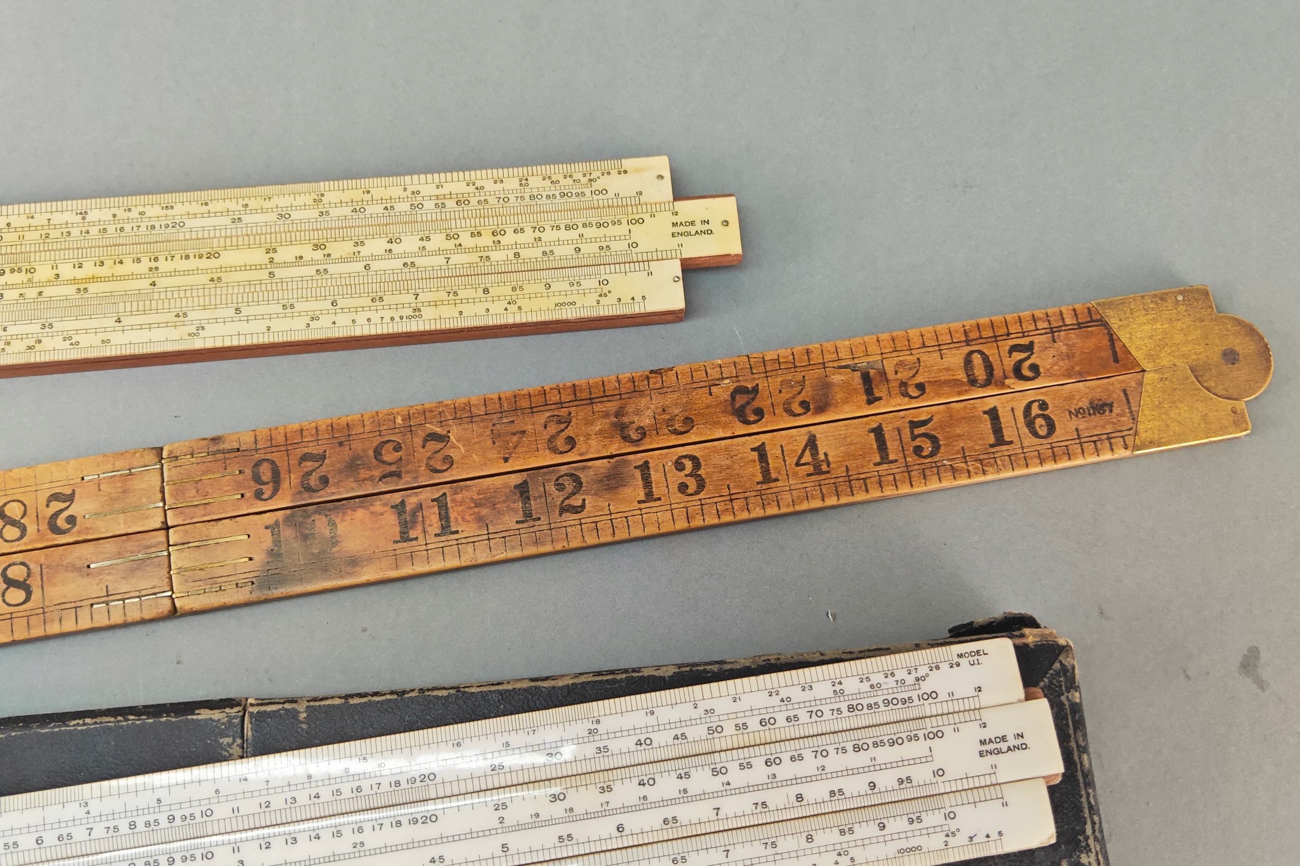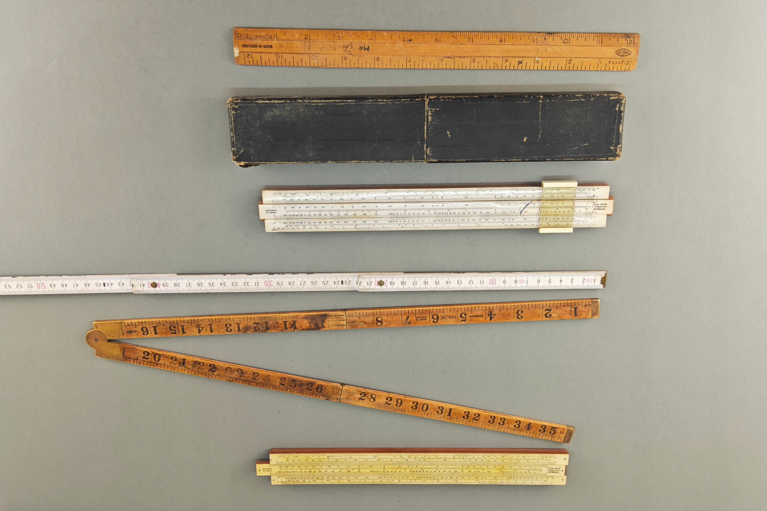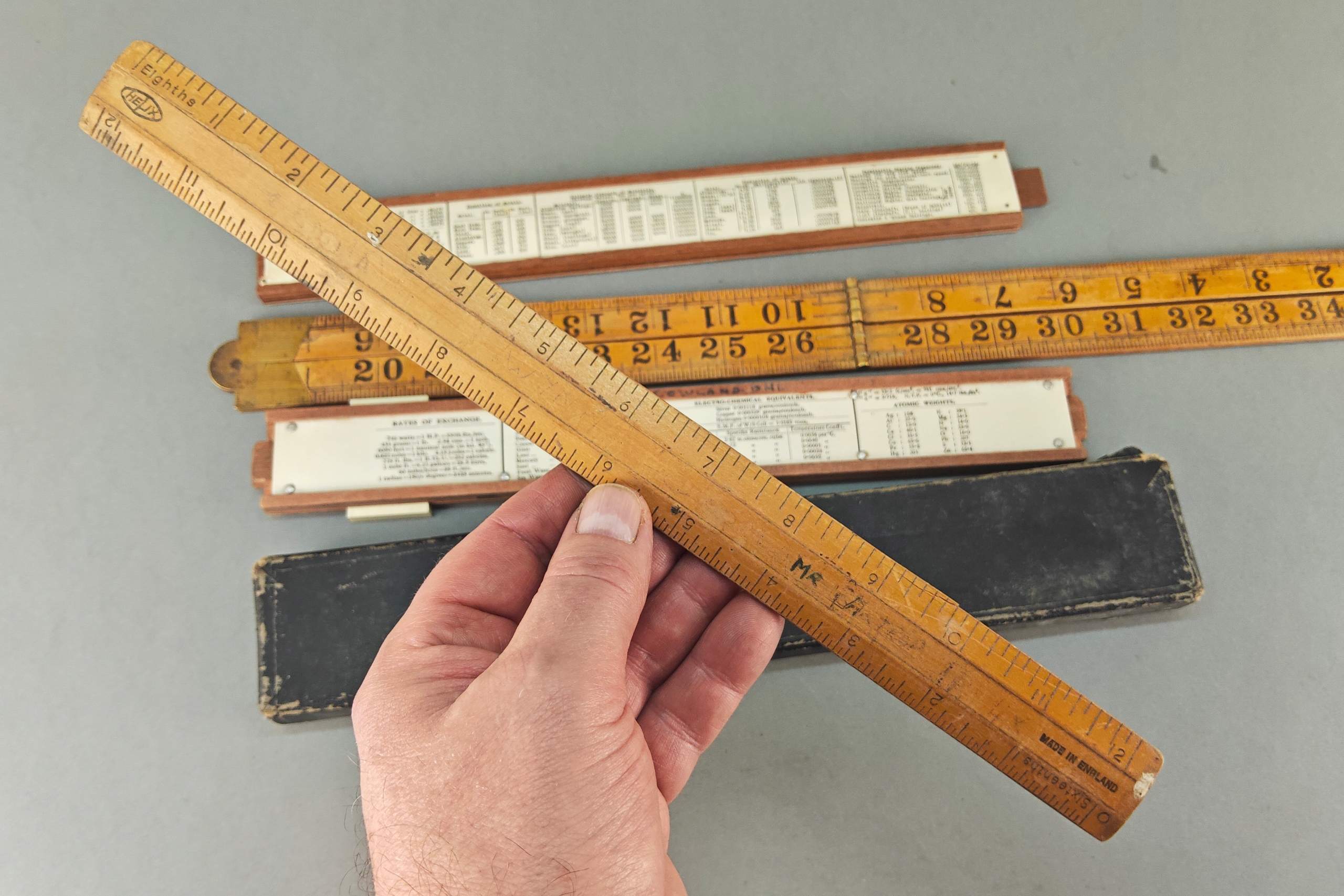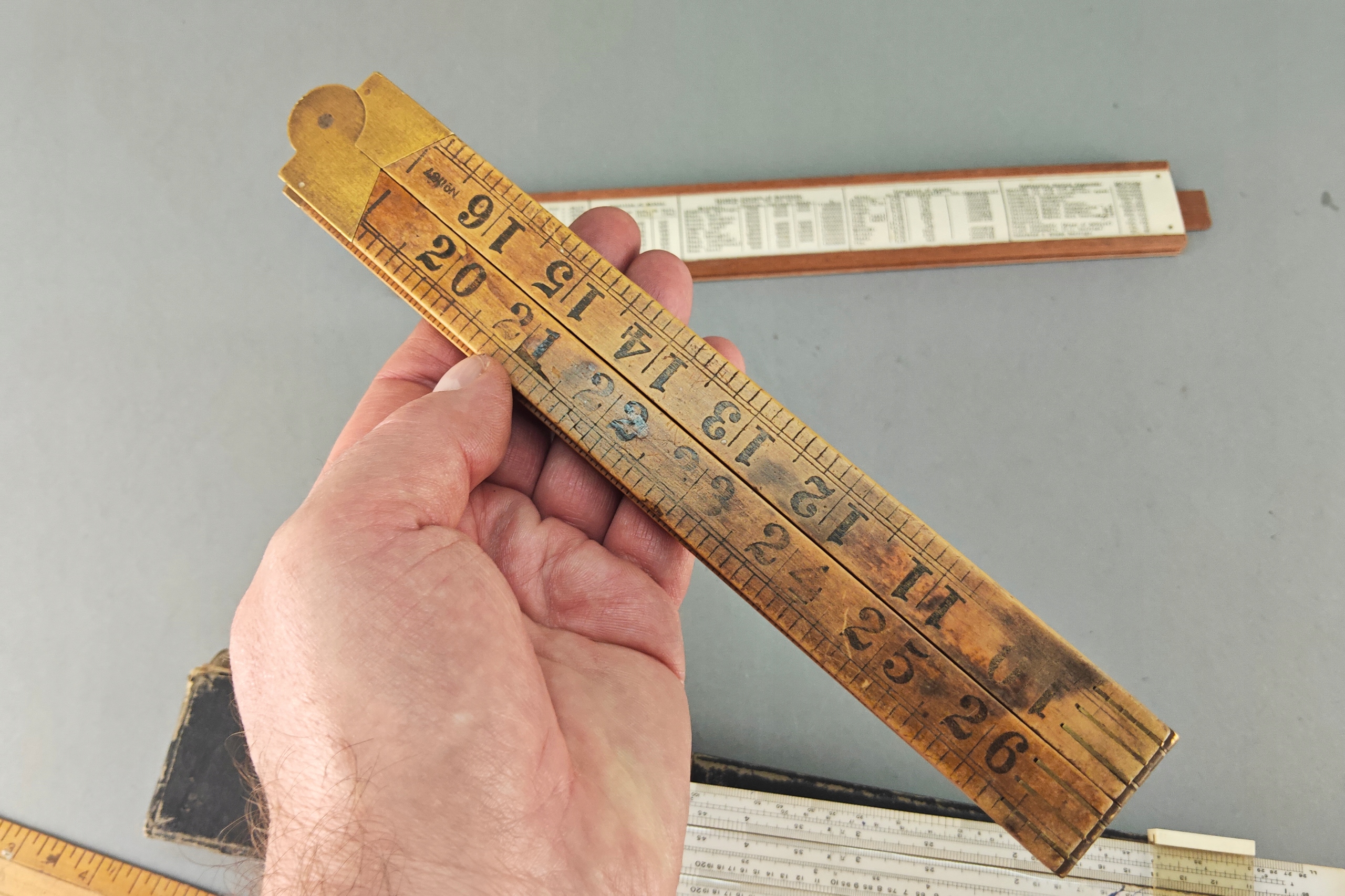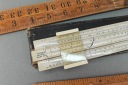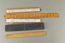 Zestaw starych angielskich linijek pomiarowych, niektóre drewno egzotyczne, jedna w orginalnym pokrowcu.. Stare orginalne narzędzia.