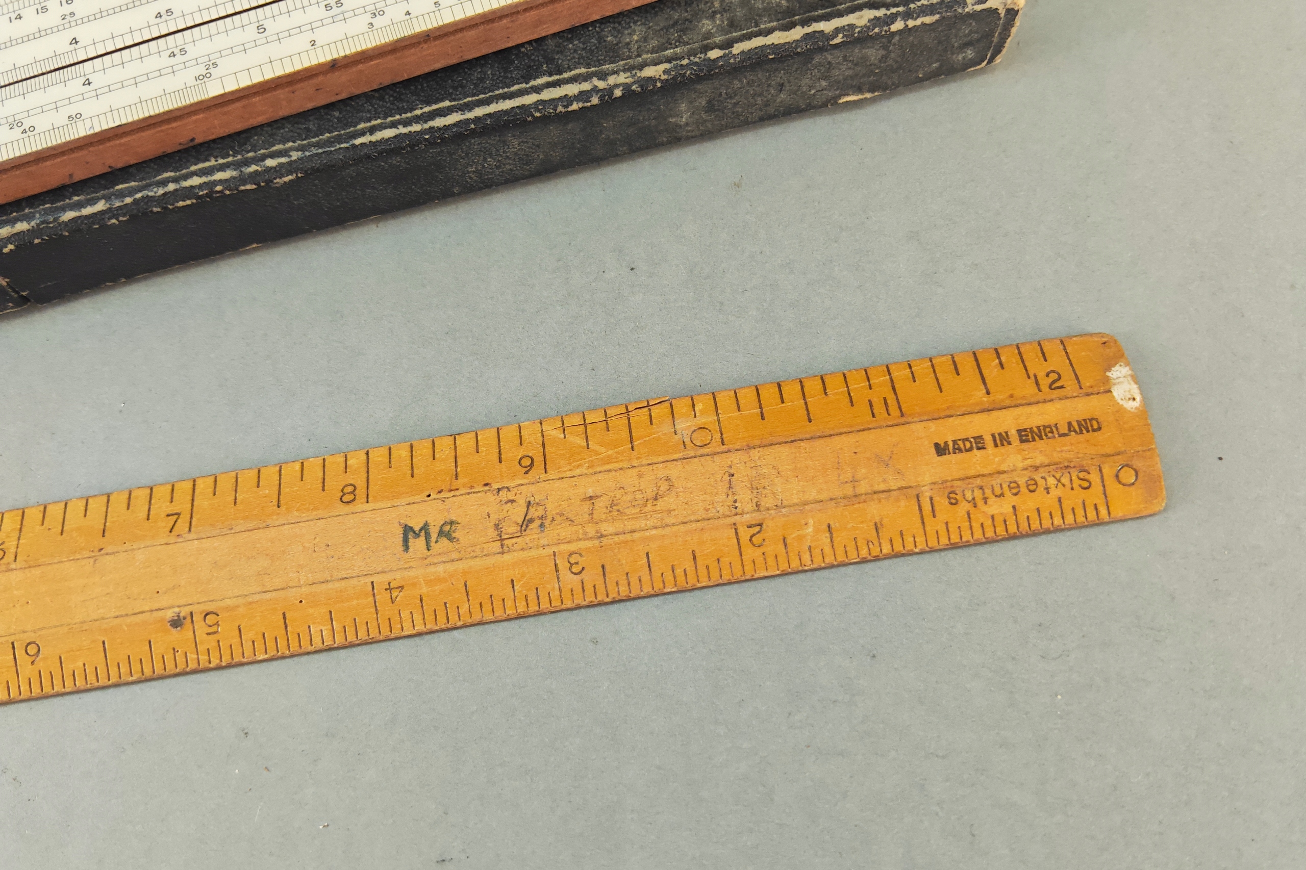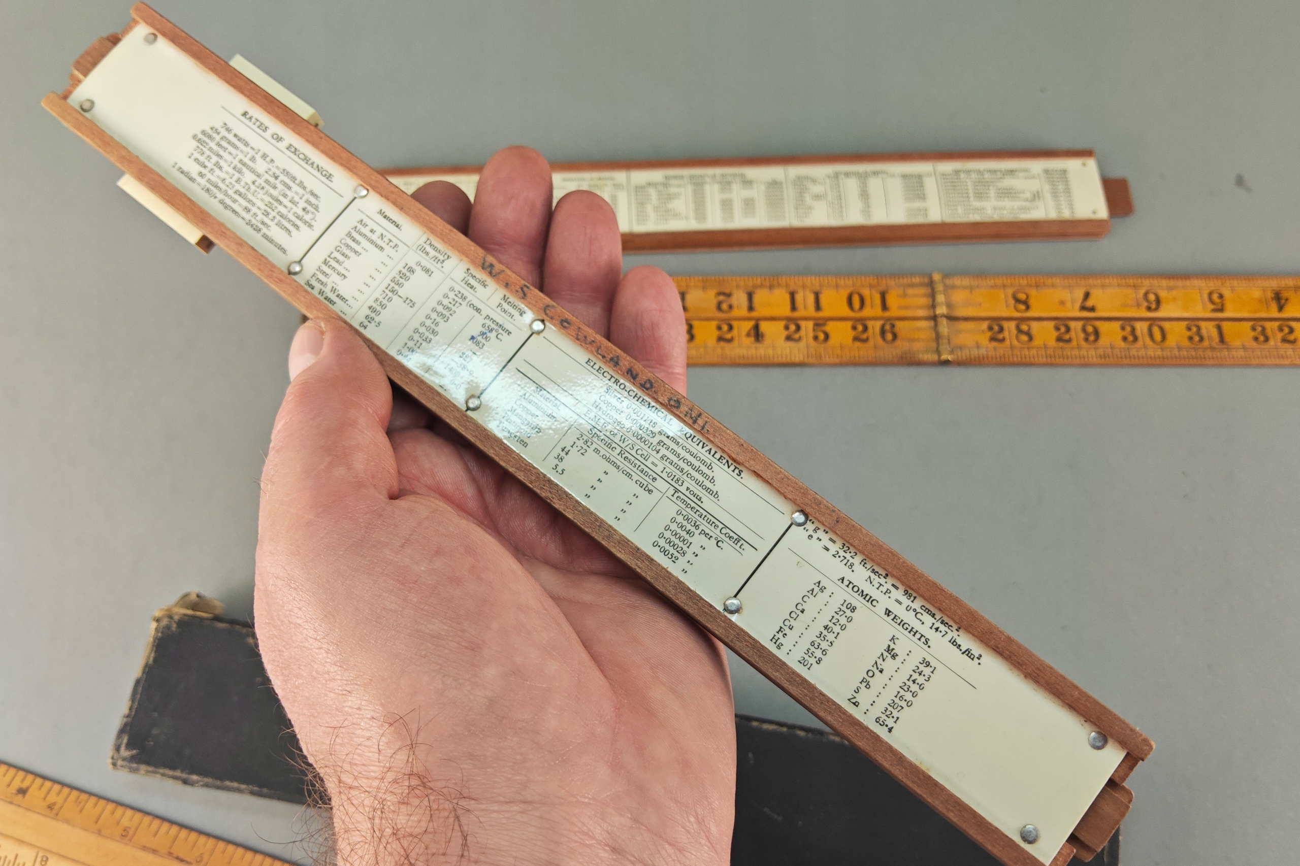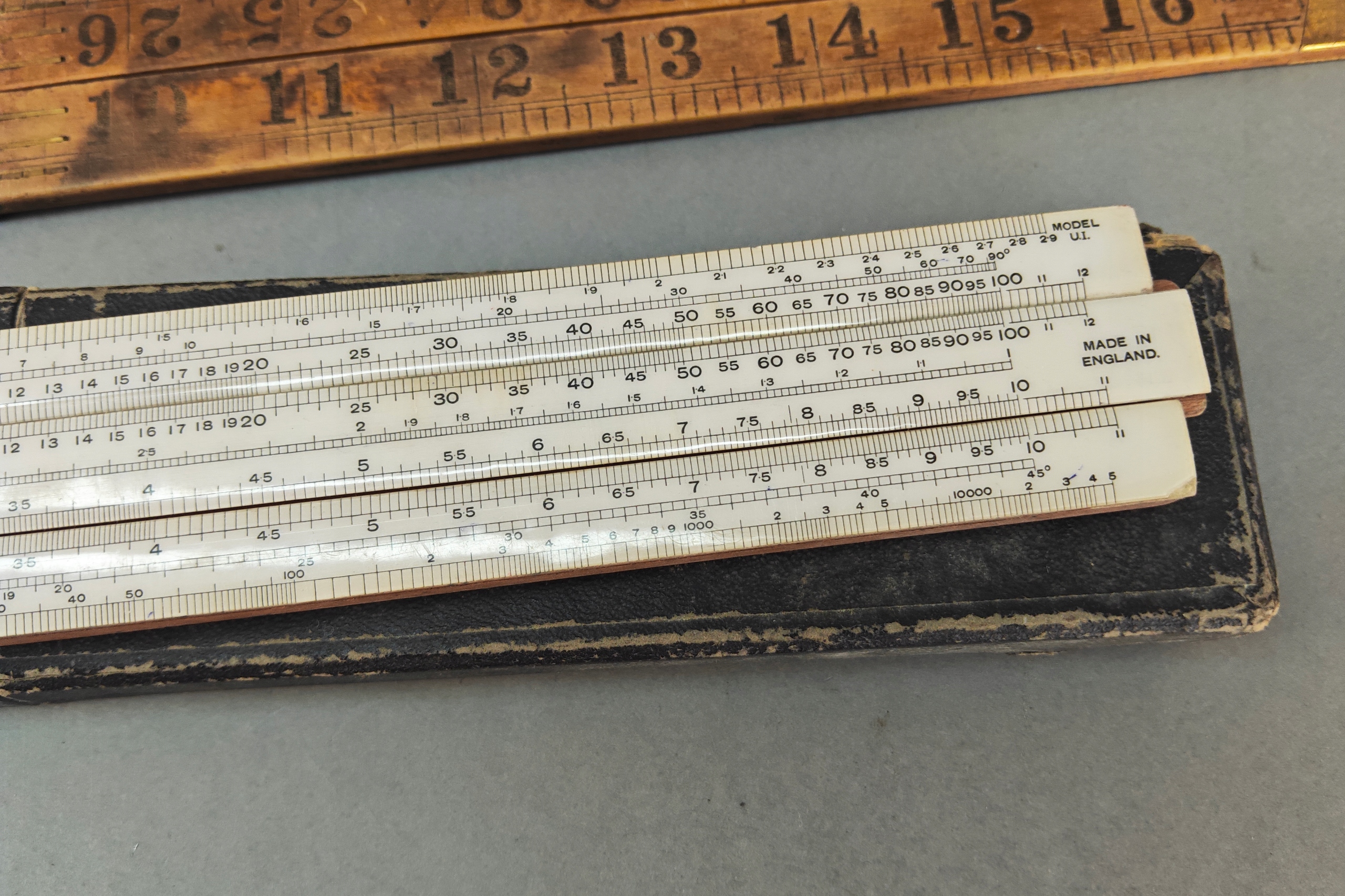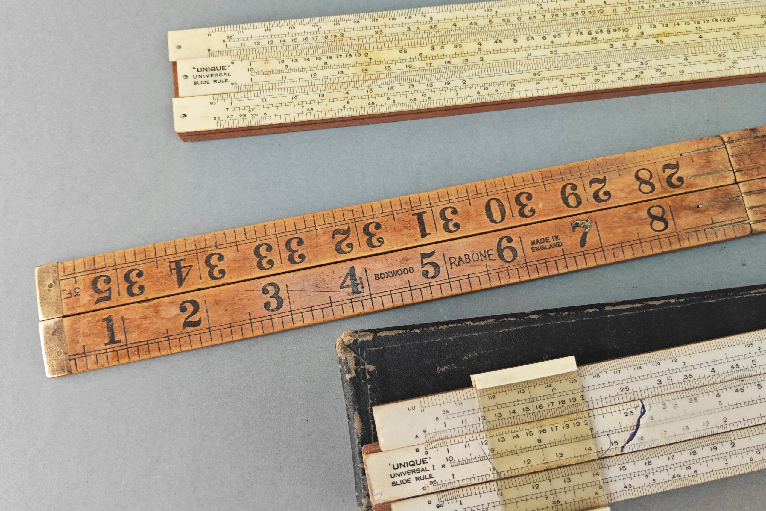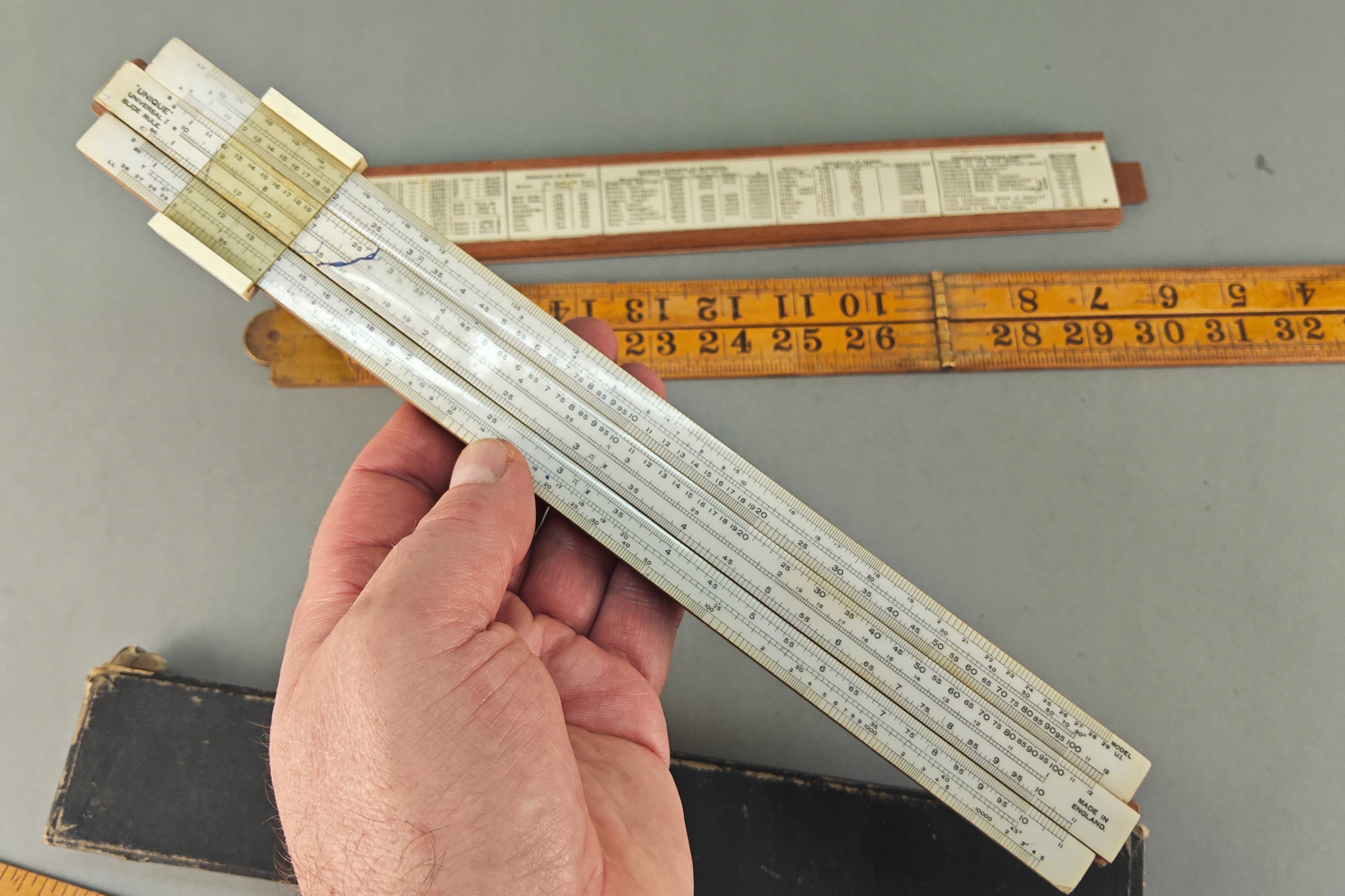 Zestaw starych angielskich linijek pomiarowych, niektóre drewno egzotyczne, jedna w orginalnym pokrowcu.. Stare orginalne narzędzia.
