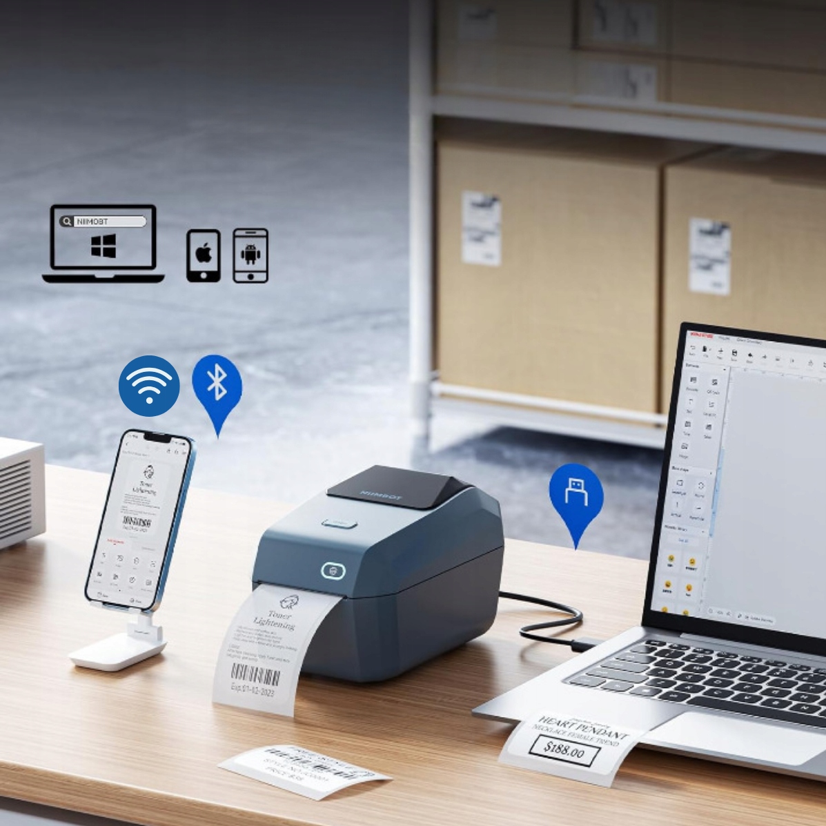 Drukarka etykiet łączy się z Twoim telefonem za pomocą Bluetooth lub WiFi. Wystarczy pobrać darmową aplikację Niimbot z AppStore lub Google Play, włączyć Bluetooth w telefonie lub połączyć się z siecią WiFi, a następnie połączyć się za pomocą jednego przycisku z urządzeniem K3W.