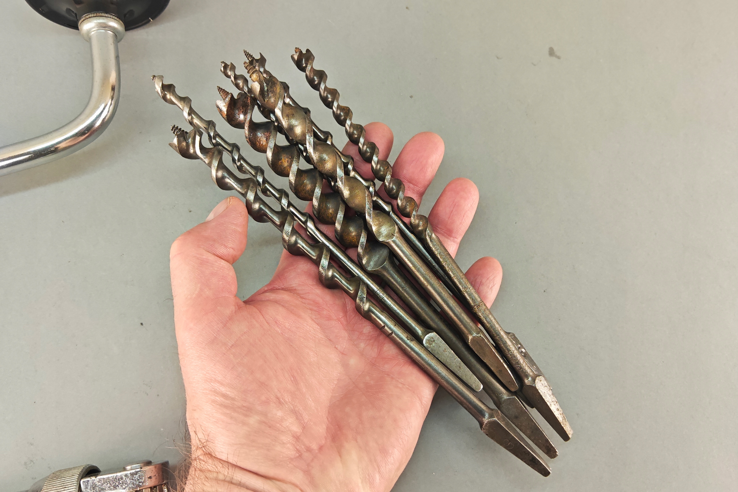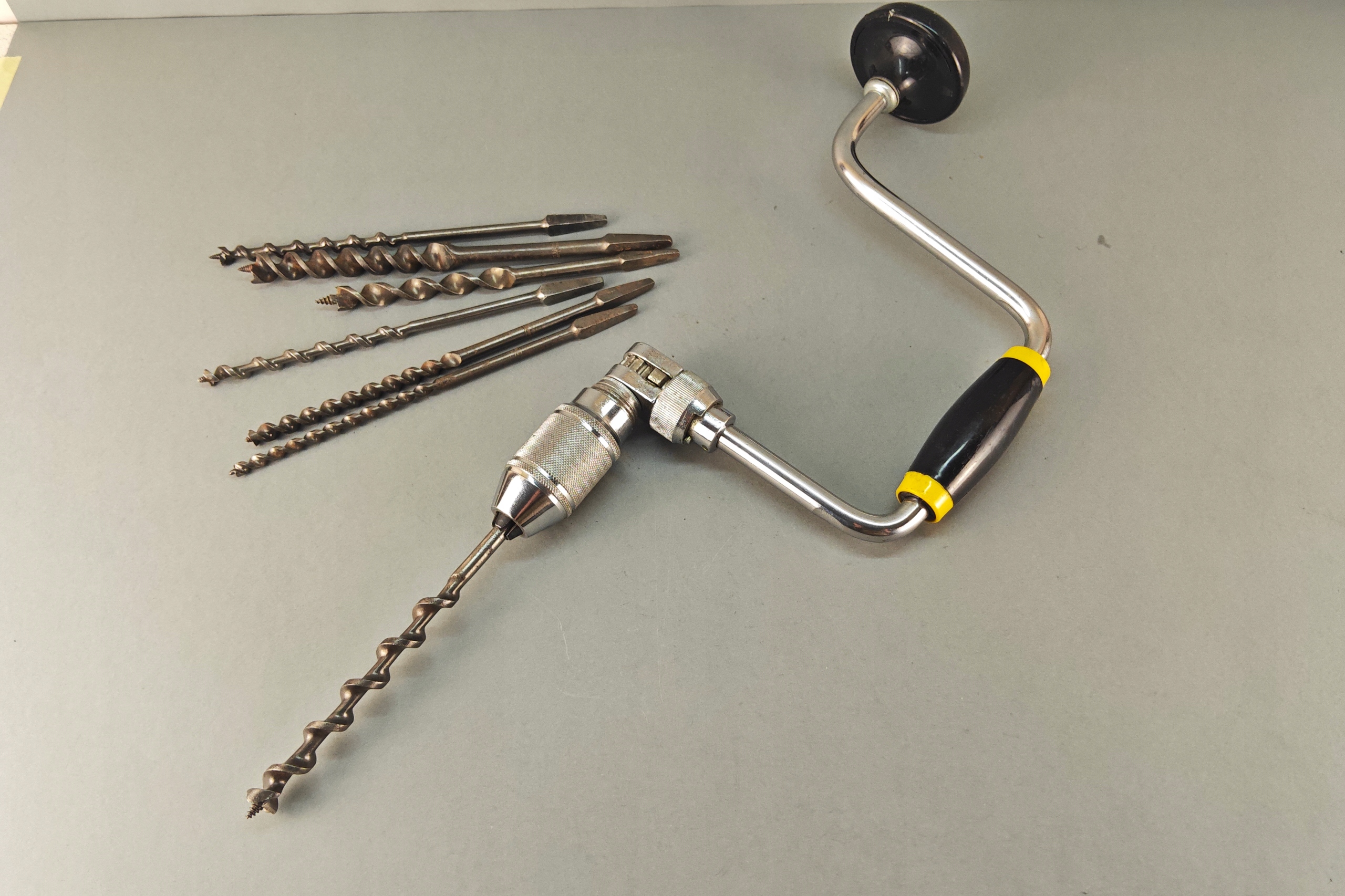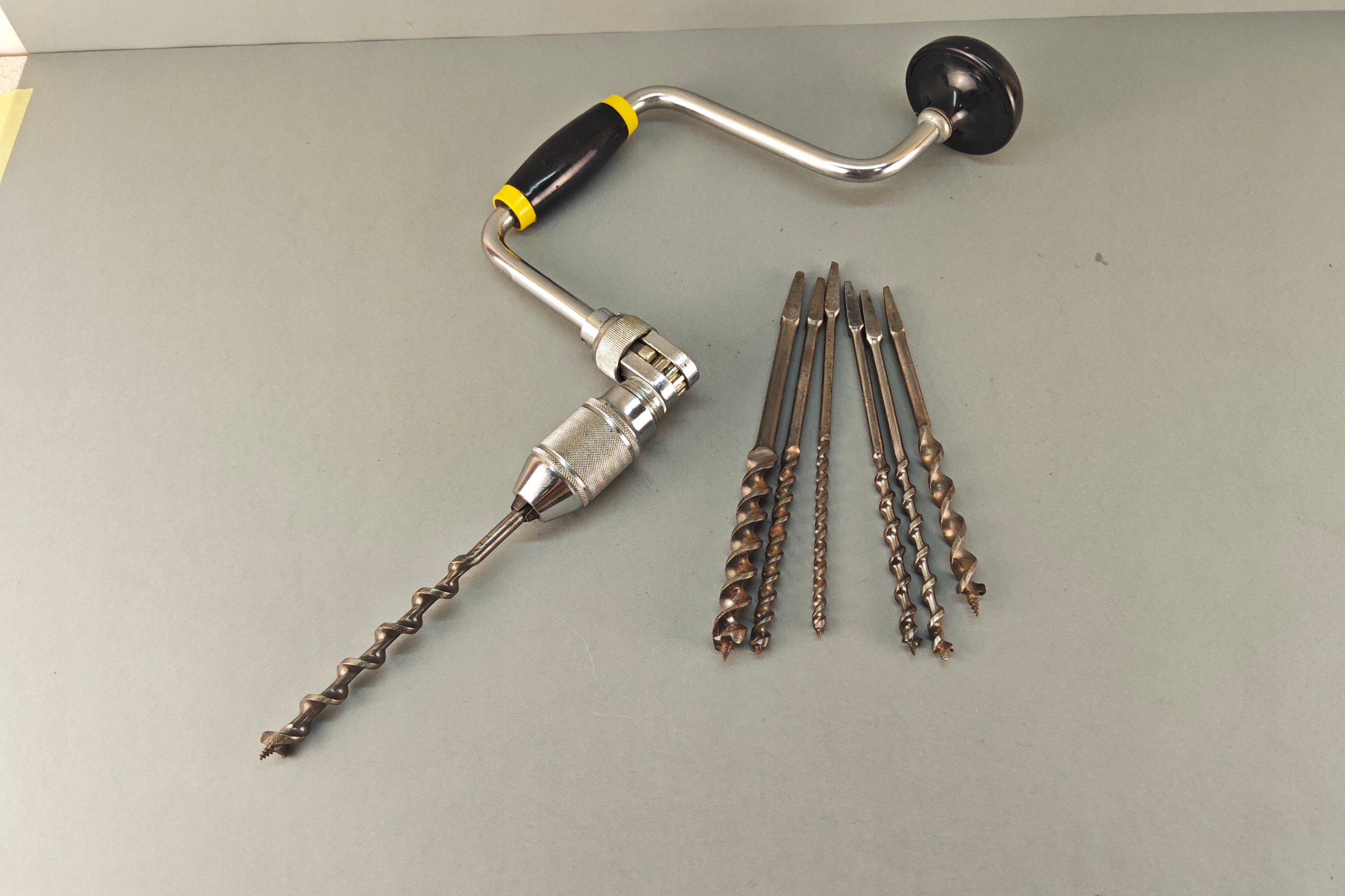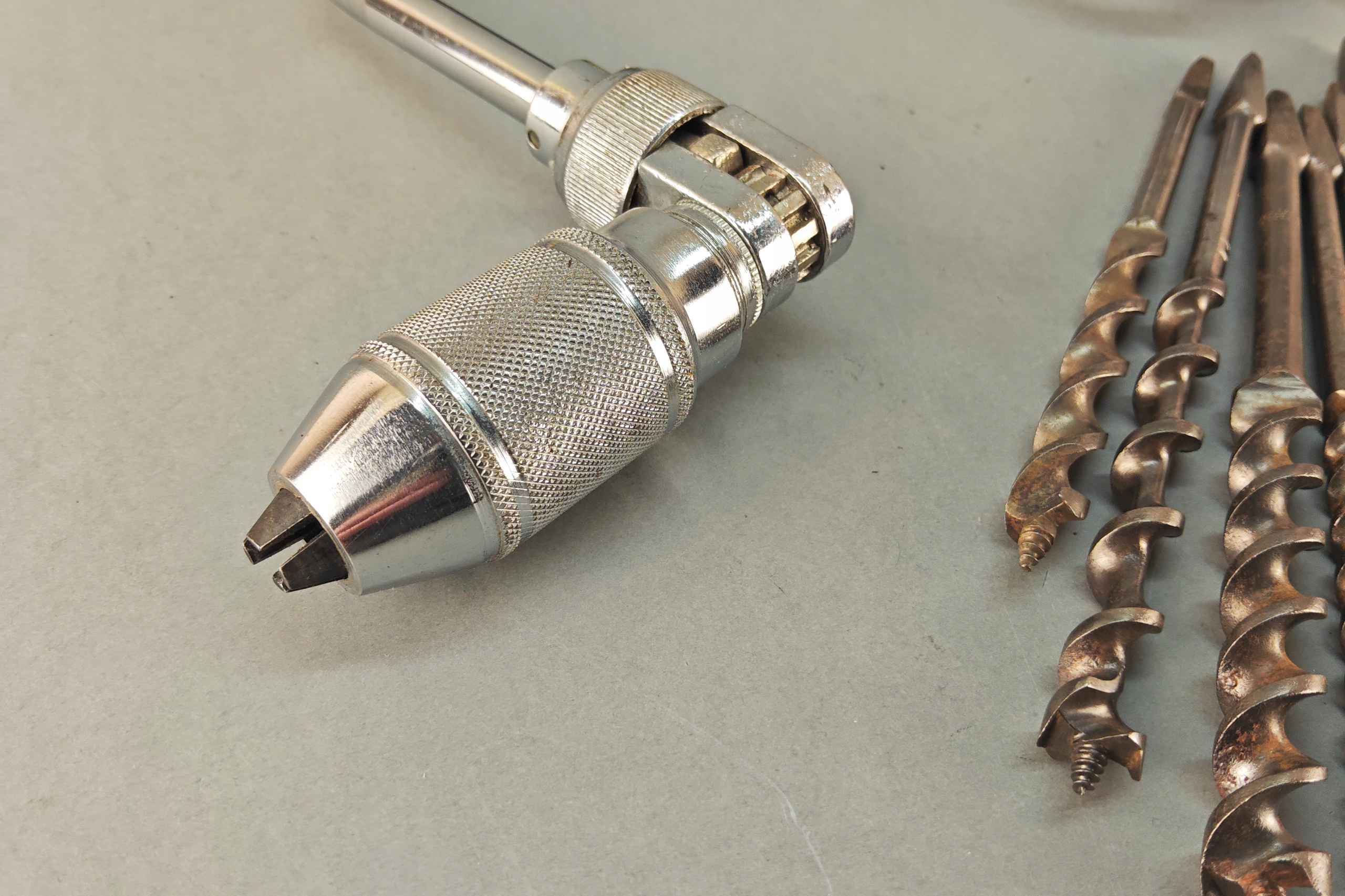 Stan bardzo dobry, wszystko działa poprawnie, ręczna wirtarka, ciekawa 4 szczęki, kręci lekko , wszystko sprawne, + 7 wierteł, świdrów. Pochodzenie Anglia.