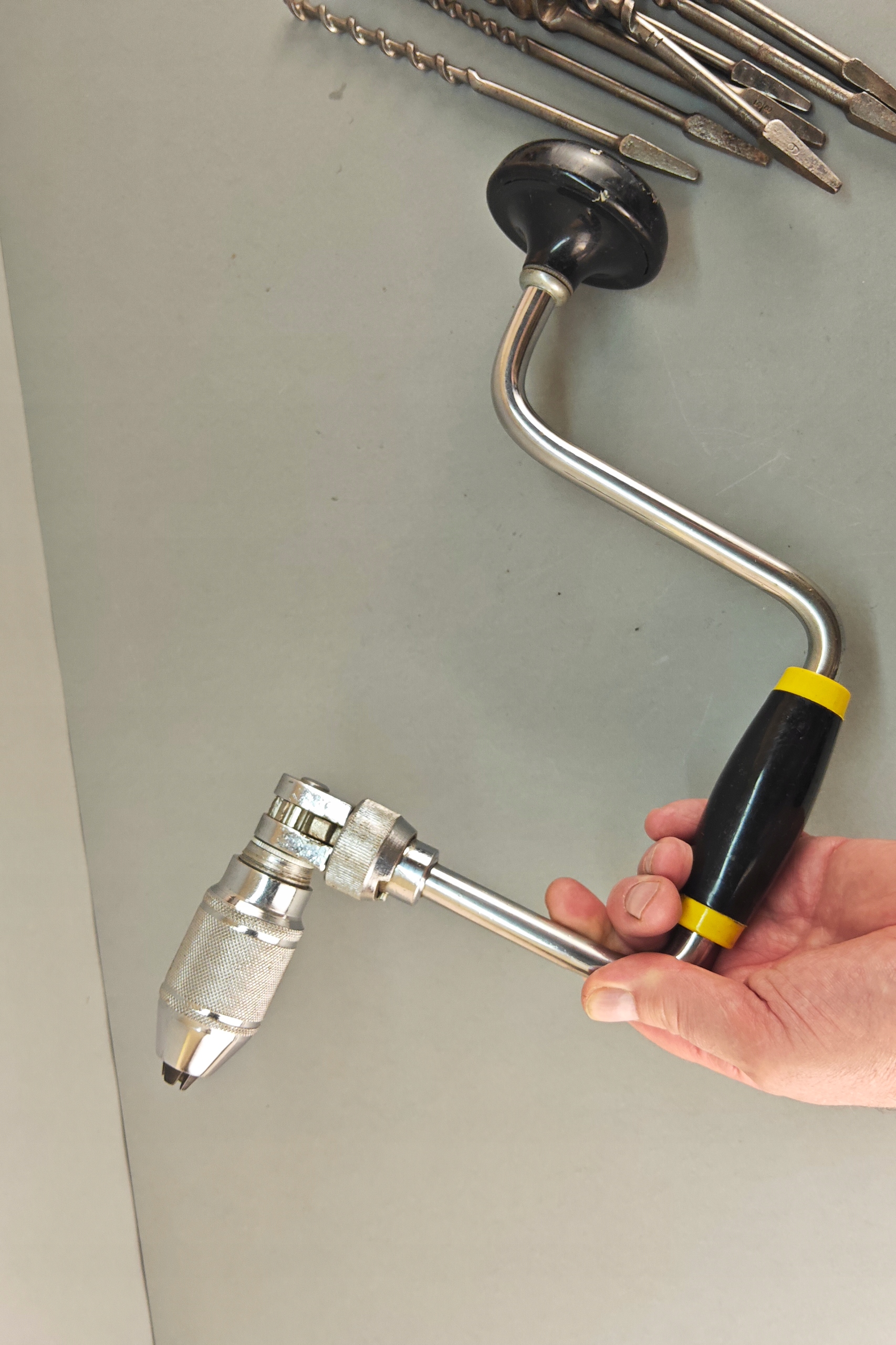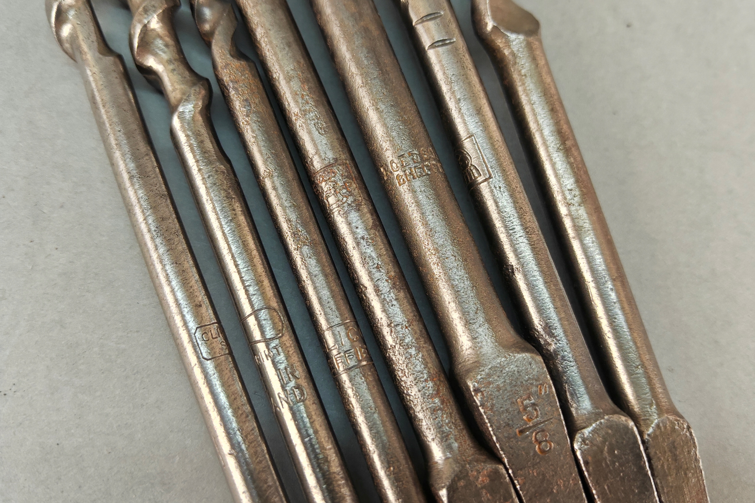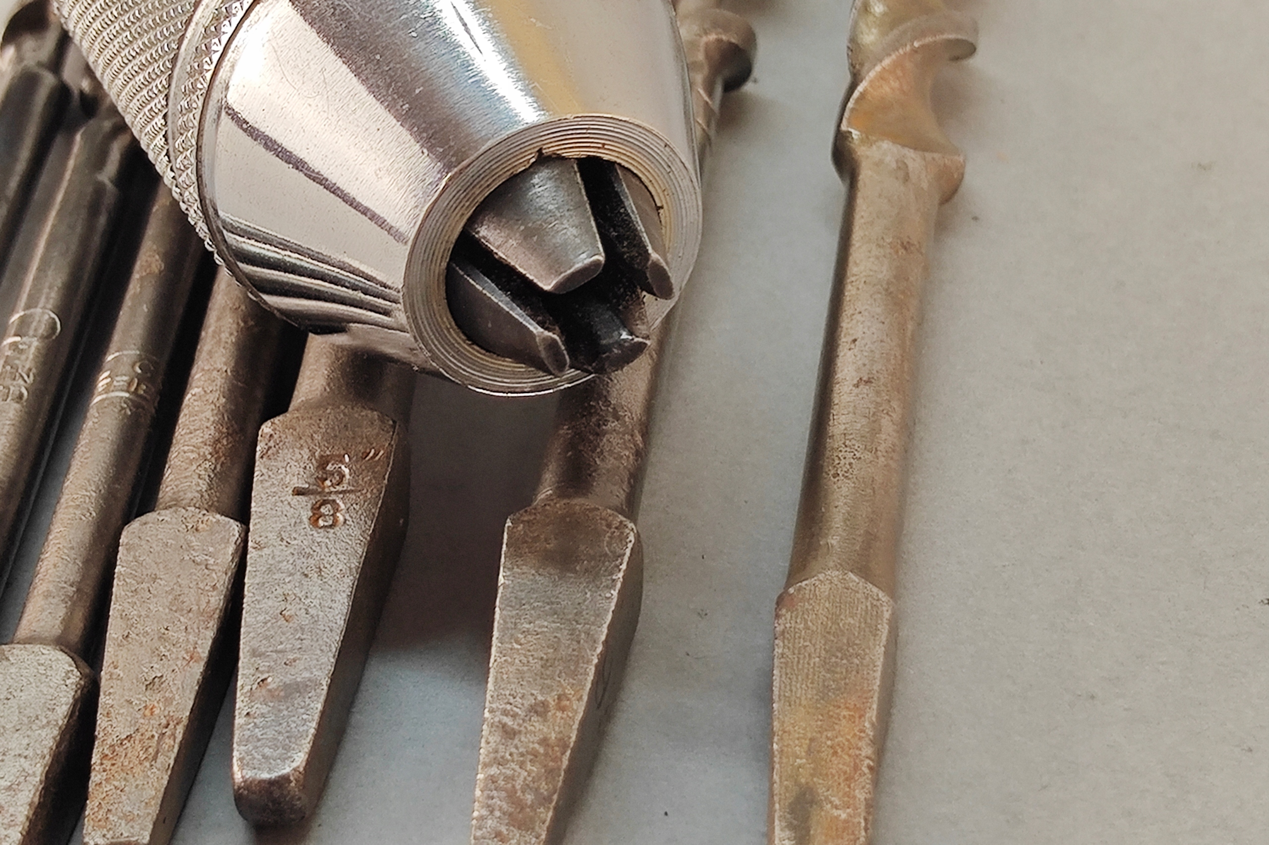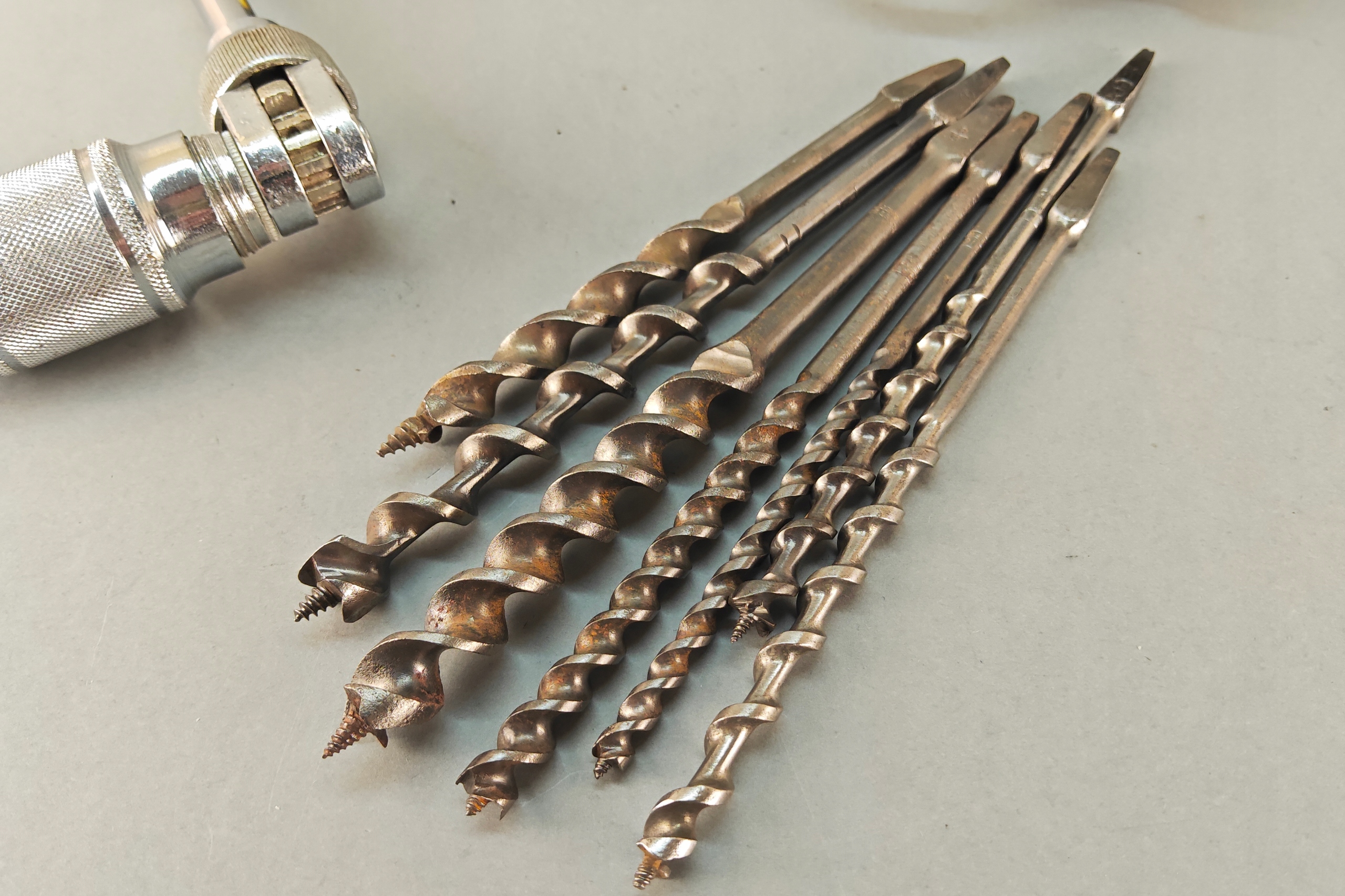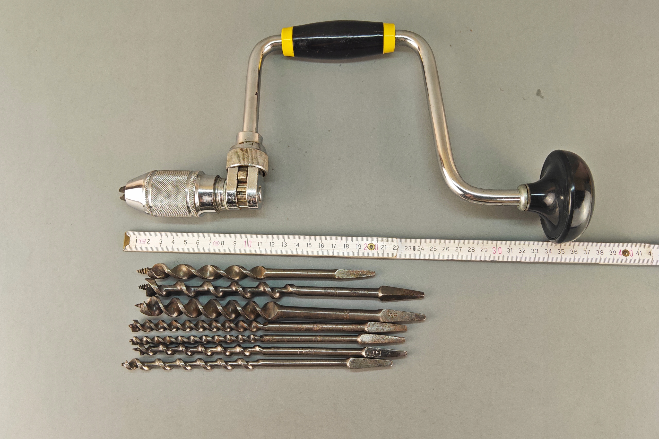 Stan bardzo dobry, wszystko działa poprawnie, ręczna wirtarka, ciekawa 4 szczęki, kręci lekko , wszystko sprawne, + 7 wierteł, świdrów. Pochodzenie Anglia.
