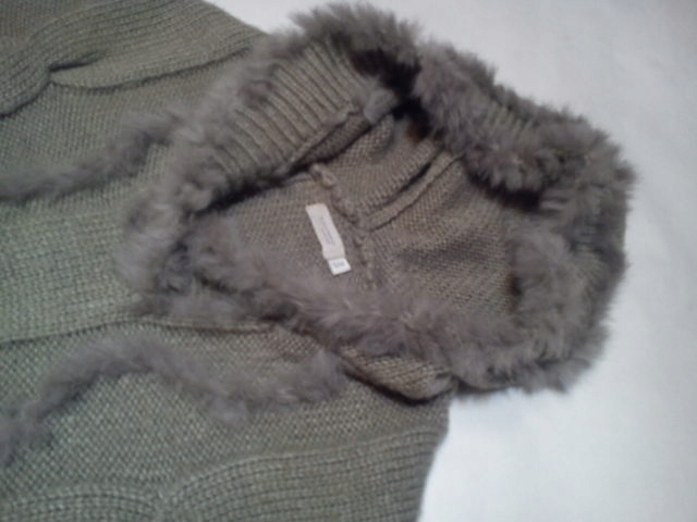 W KOLORZE SZARYM DZIANINA , WZÓR JAK NA ZDJĘCIU , PRZETYKANA CIENIUTKIM PASECZKIEM SKÓRY Z FUTERKIEM . ZDJĘCIE WIERNIE ODDAJE KOLOR. WKŁADANE PRZEZ GŁOWĘ . Z KAPTUREM PRZYSZYTYM NA STAŁE .