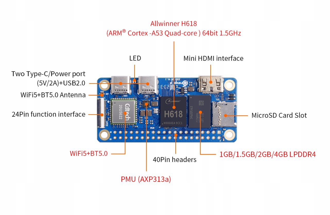 Orange Pi Zero 2W Quad-Core 1GB -płyta główna SBC SoC - OrangePi Zero 2W. Najnowsze wydanie Orange Pi Zero, w bardzo popularnym formacie (kmpatybilnym z Raspberry Pi Zero). Zbudowany na bardzo wydajnym i energooszczędnym SoC ARM Quad-Core Cortex-A53 Allwinner H618