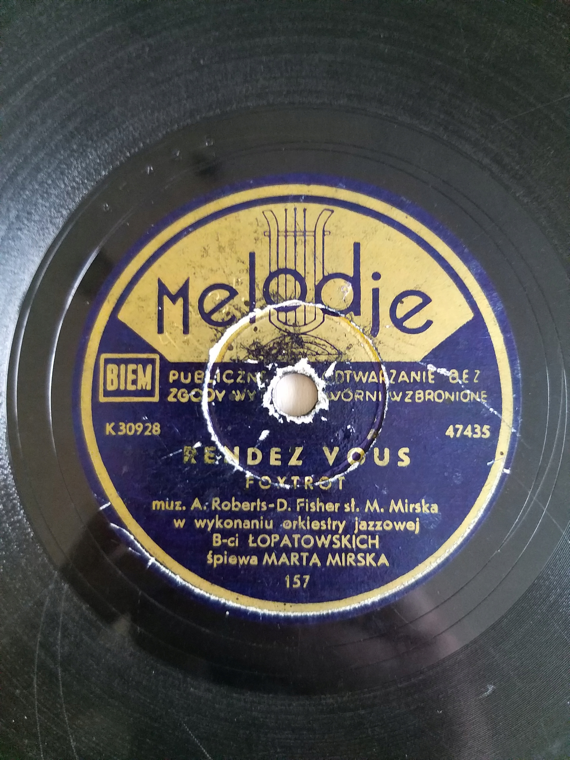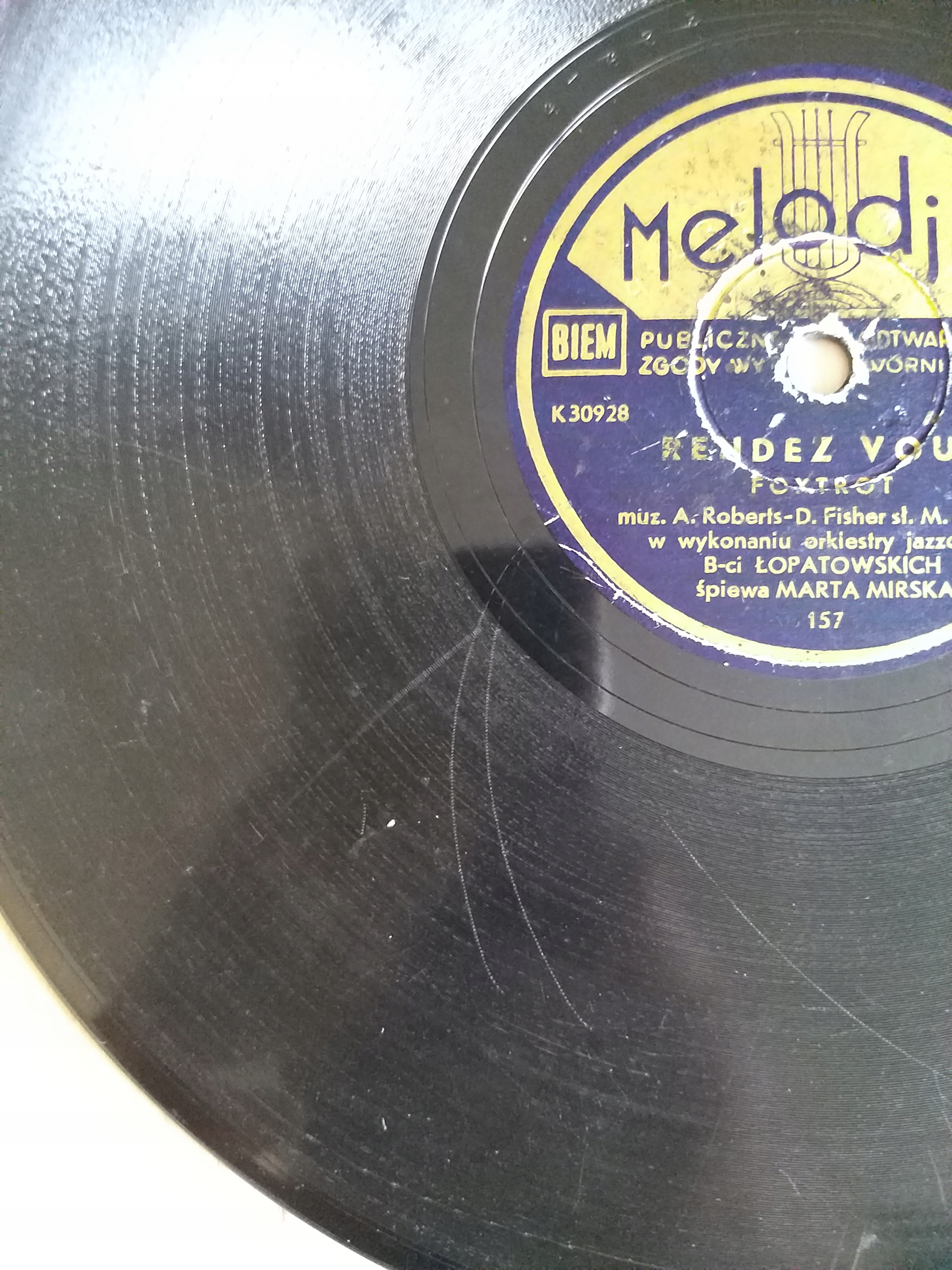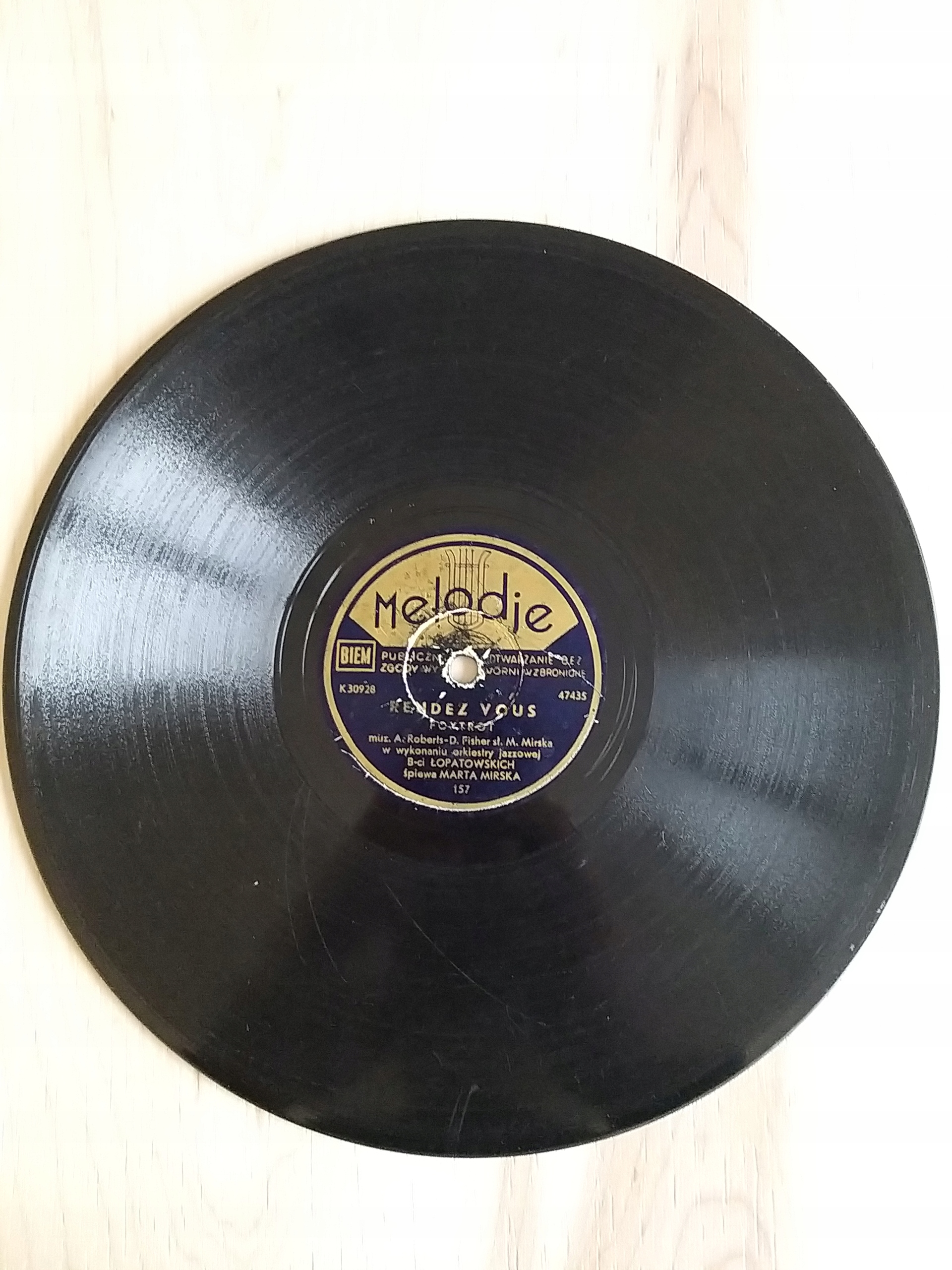 Oferta dotyczy płyty szelakowej wytwórni Melodje z nagraniami Marty Mirskiej. Płyta nosi ślady użytkowania. Była wielokrotnie odtwarzana. Bez pęknięć. Stan widoczny na foto.