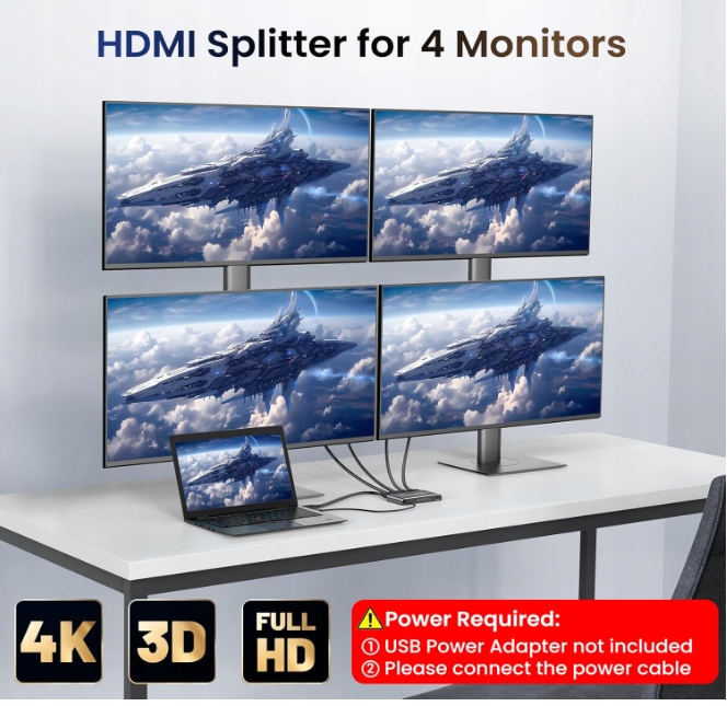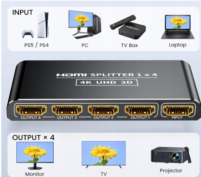 Rozdzielacz HDMI 1 wejście 4 wyjścia: Podłącz jedno źródło HDMI do czterech ekranów HDMI jednocześnie. Idealny do dublowania sygnału z telewizora, laptopa, konsoli PS5, PS4, komputera gamingowego, monitora lub projektora. Idealne rozwiązanie do kina domowego, zestawów gamingowych i prezentacji biurowych. Obsługuje dystrybucję sygnału HDMI na duże odległości bez opóźnień.