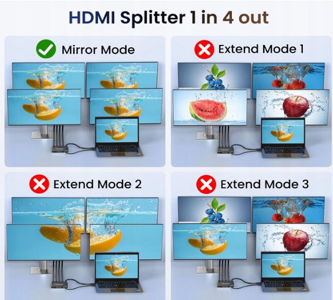 Stabilność i synchronizacja: Ten rozdzielacz HDMI 1 na 4 dostarcza identyczne sygnały w czasie rzeczywistym do wszystkich 4 wyświetlaczy bez migotania i degradacji. Wbudowany wzmacniacz sygnału zapewnia wysoką przepustowość i integralność sygnału. Idealny duplikator HDMI do środowisk z wieloma wyświetlaczami. Zawartość opakowania: 1 rozdzielacz HDMI 1 wejście 4 wyjścia, 1 kabel zasilający micro USB, 1 instrukcja obsługi (J.angielski). Uwaga: kabel HDMI i zasilacz sprzedawane oddzielnie.