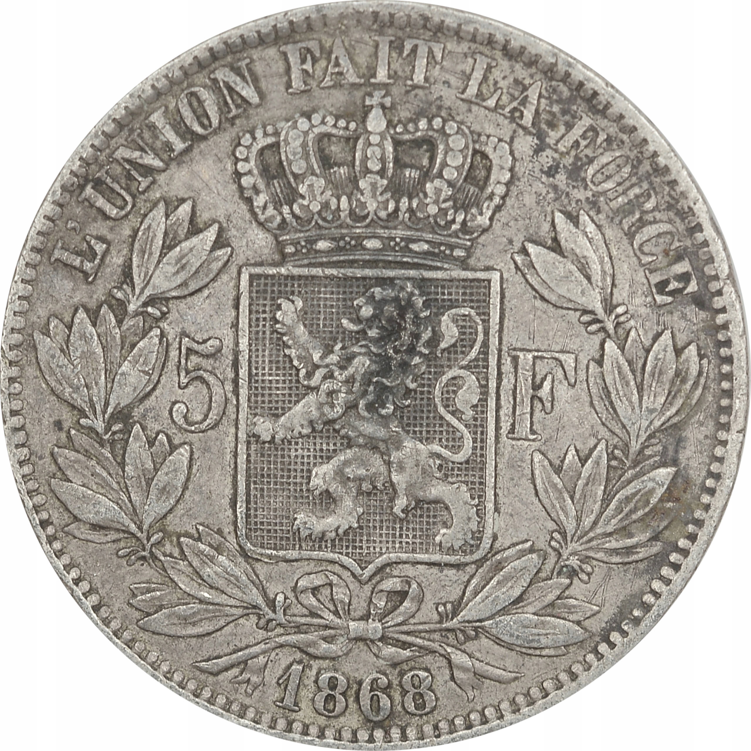 17.BELGIA, LEOPOLD II, 5 FRANKÓW 1868