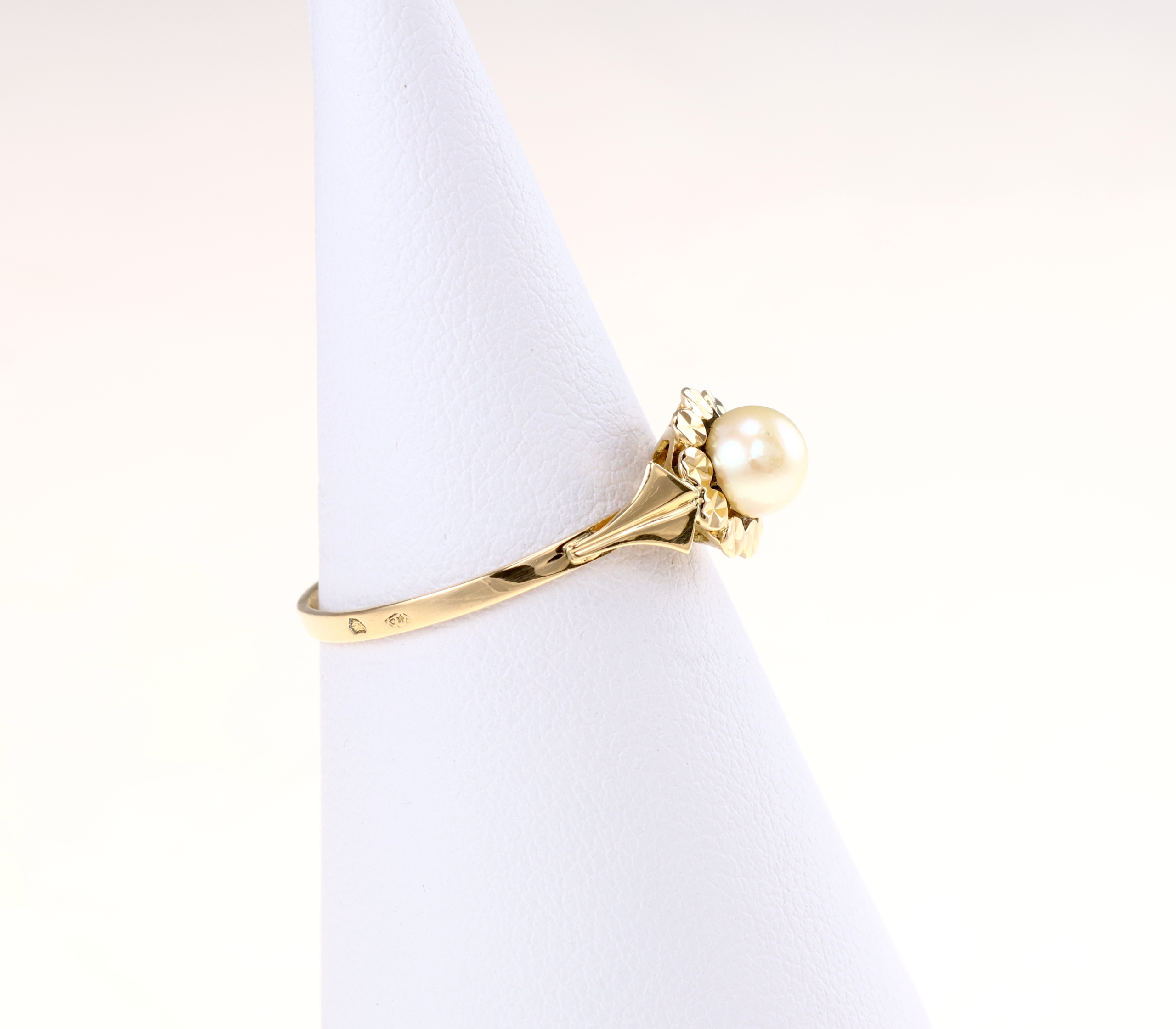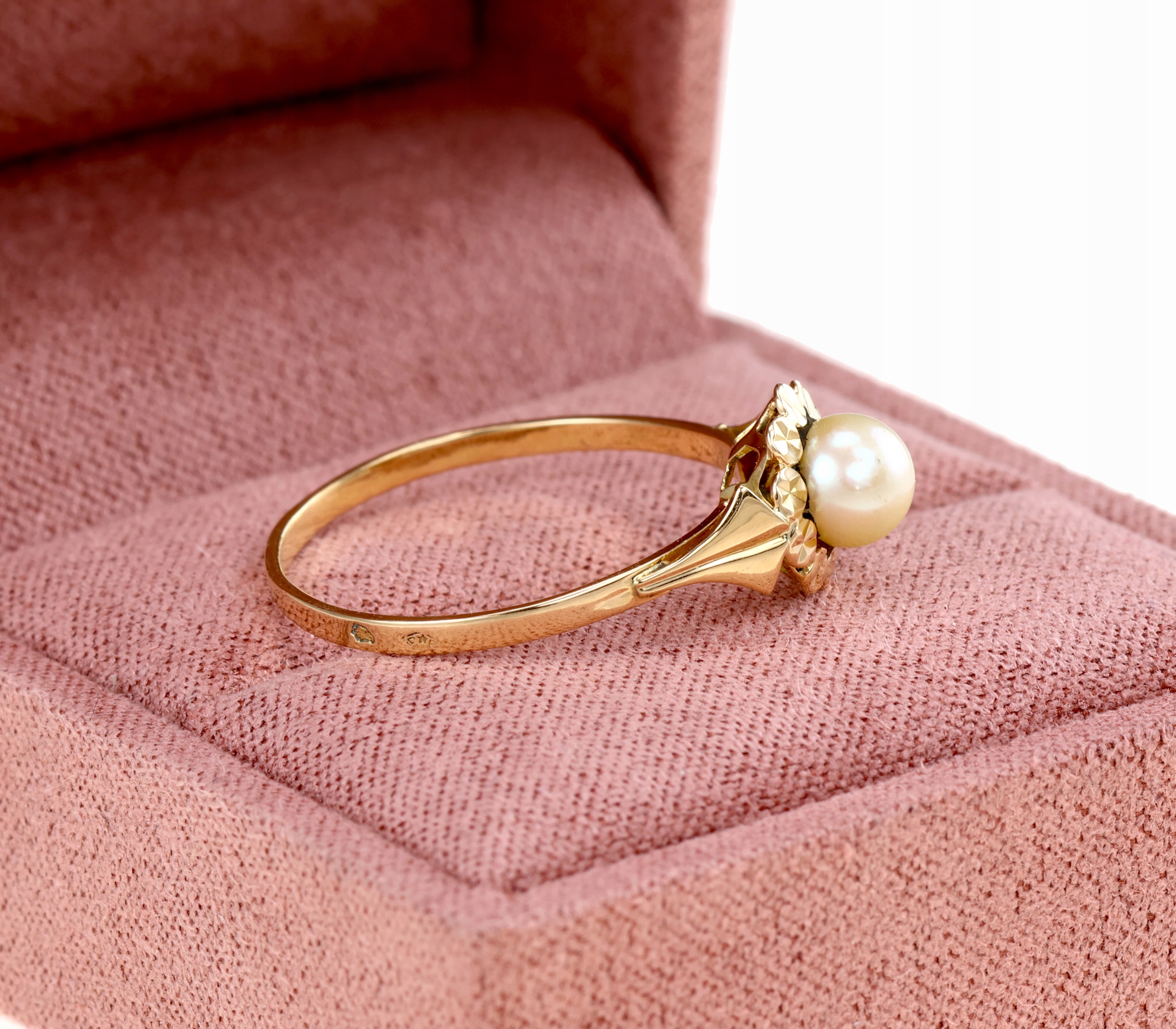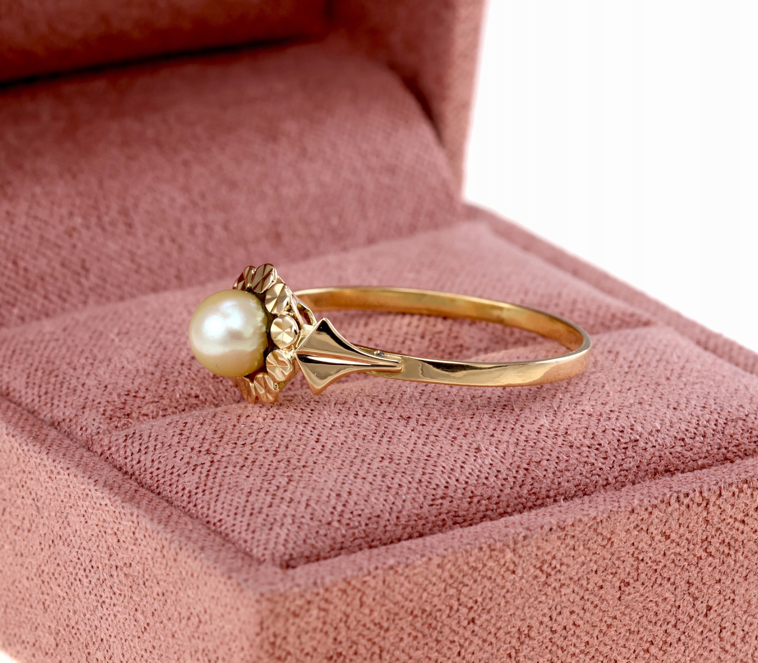 Przedmiotem sprzedaży jest delikatny francuski pierścionek zdobiony perełką słonowodną hodowaną. Średnica korony 9 mm.