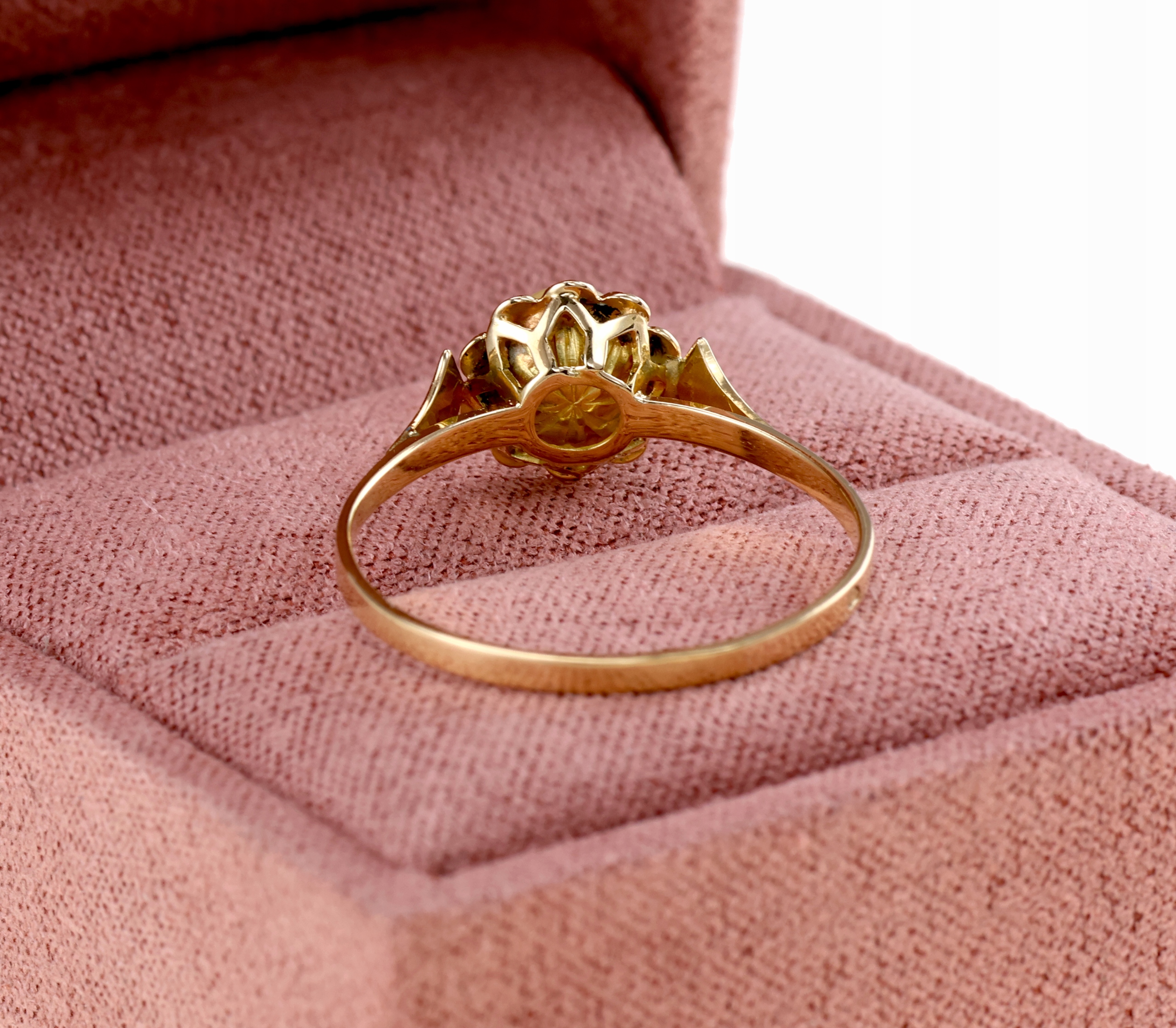 Stan zachowania bardzo dobry. Pierścionek został wyczyszczony i wypolerowany, jest gotowy do założenia. W komplecie ozdobne pudełko.