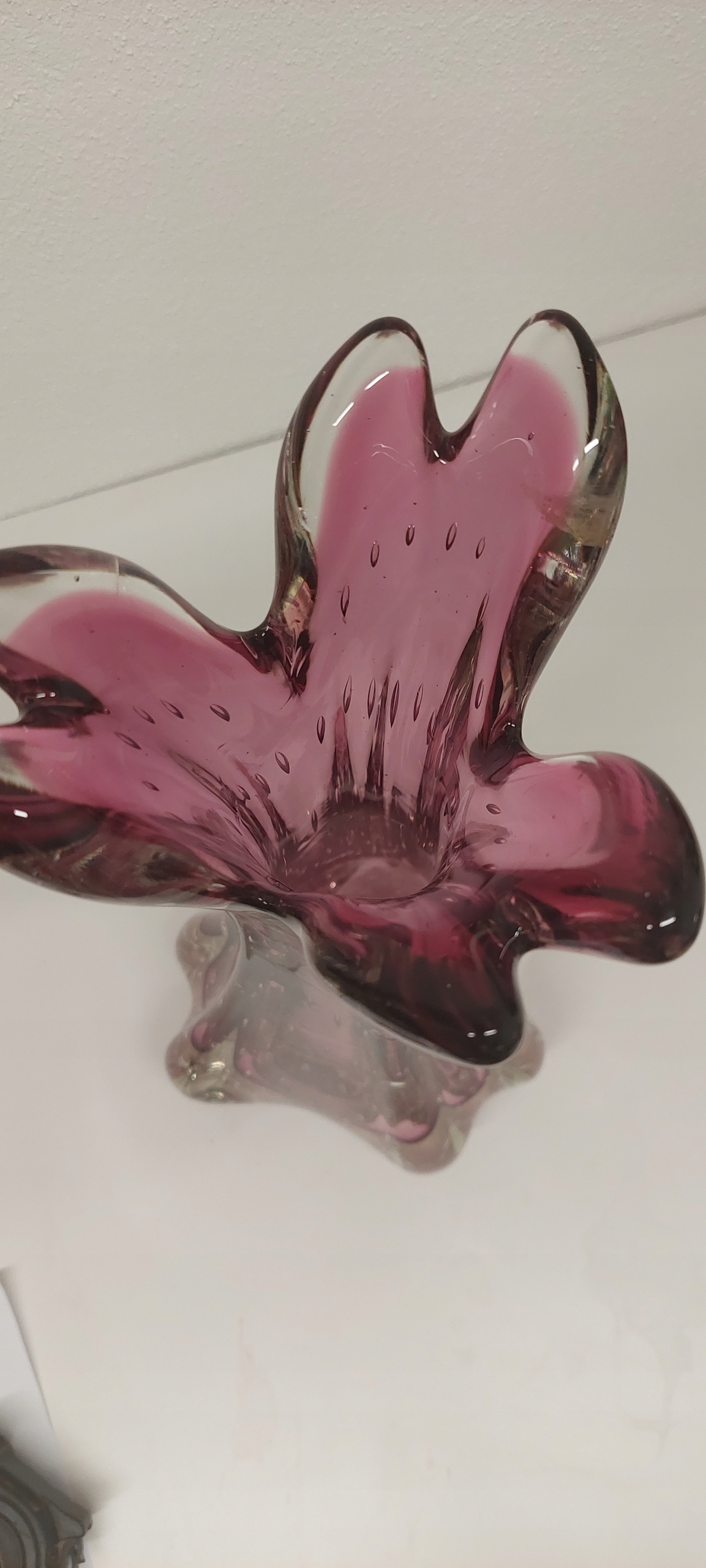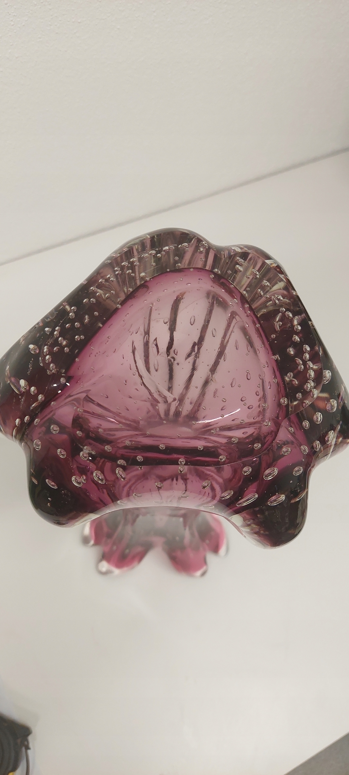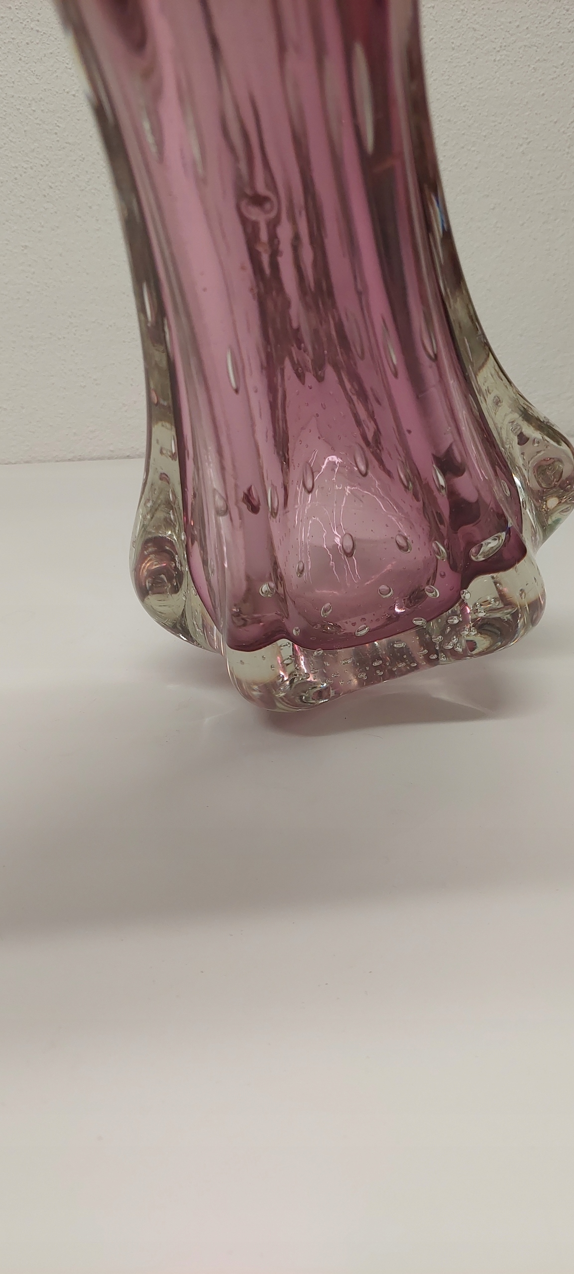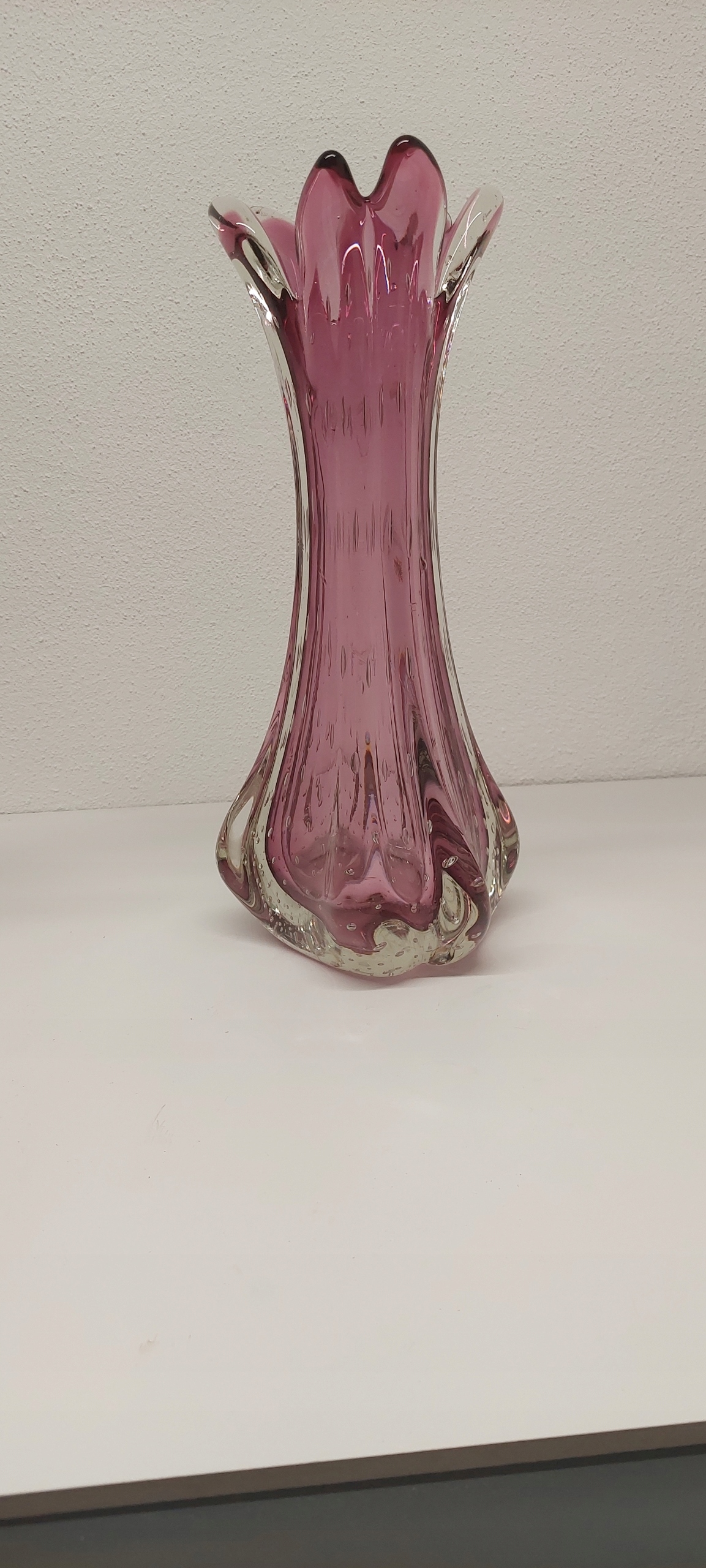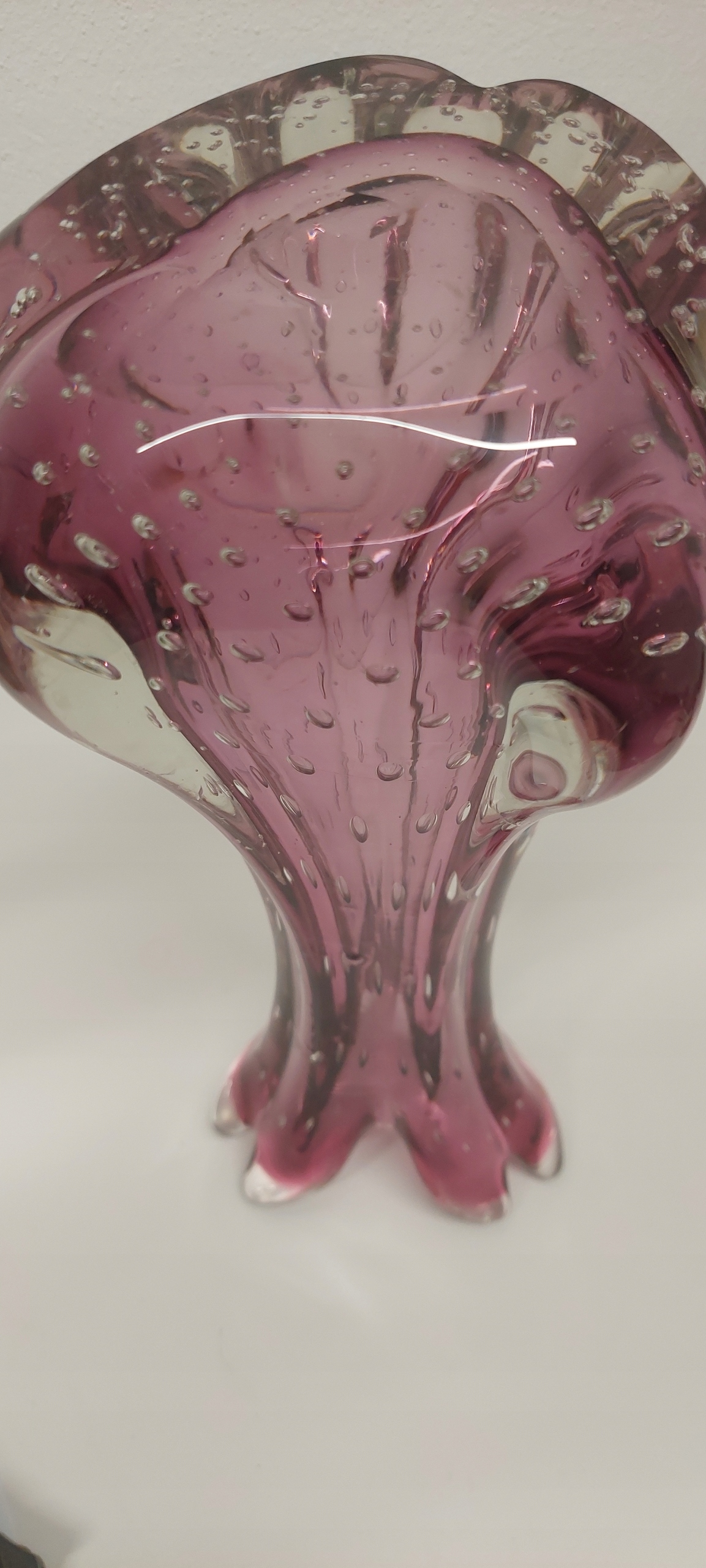 Wazon o wymiarach wysokość 38cm, średnica wlewu 12cm, średnica w brzuścu 197cm. Wazon posiada rysę widoczną na zdjęciu oraz drobne ryski od spodu.