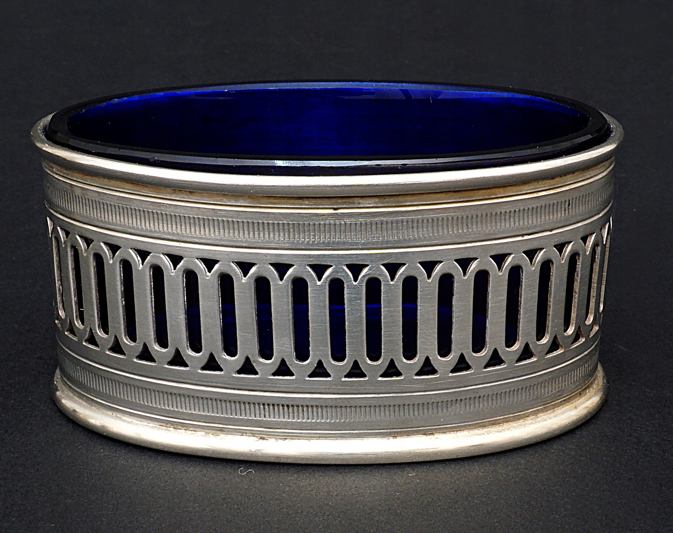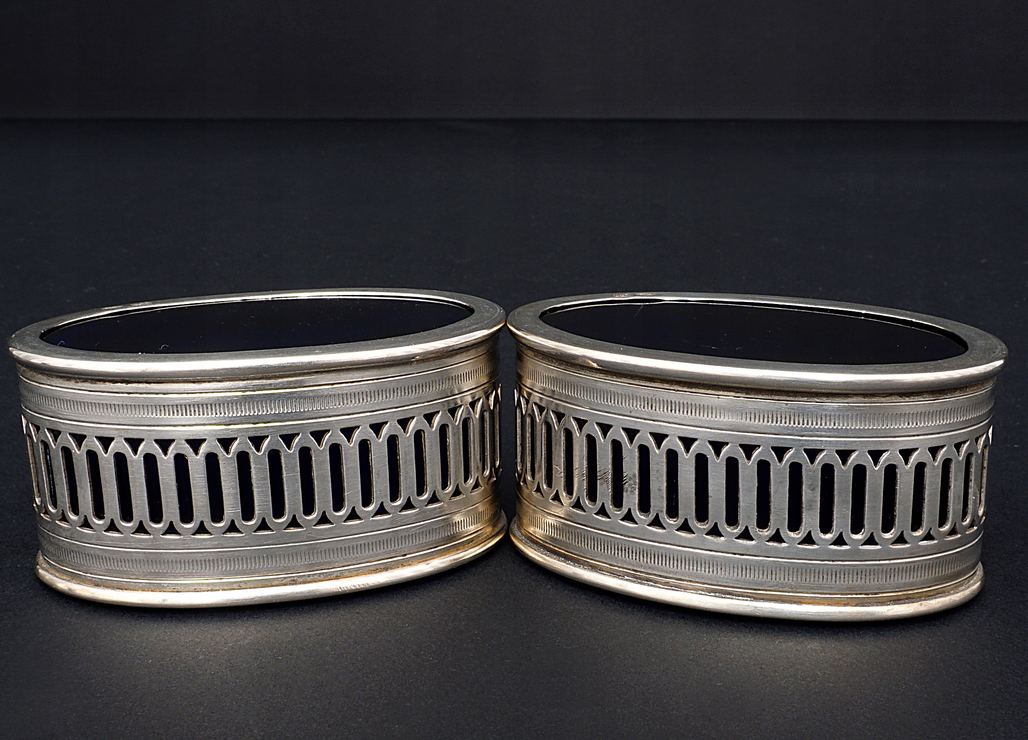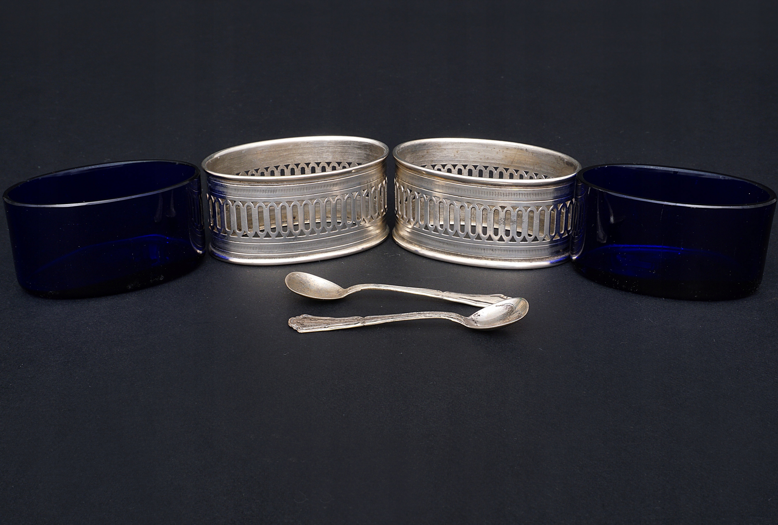 Para solniczek z kobaltowymi, szklanymi wkładami.