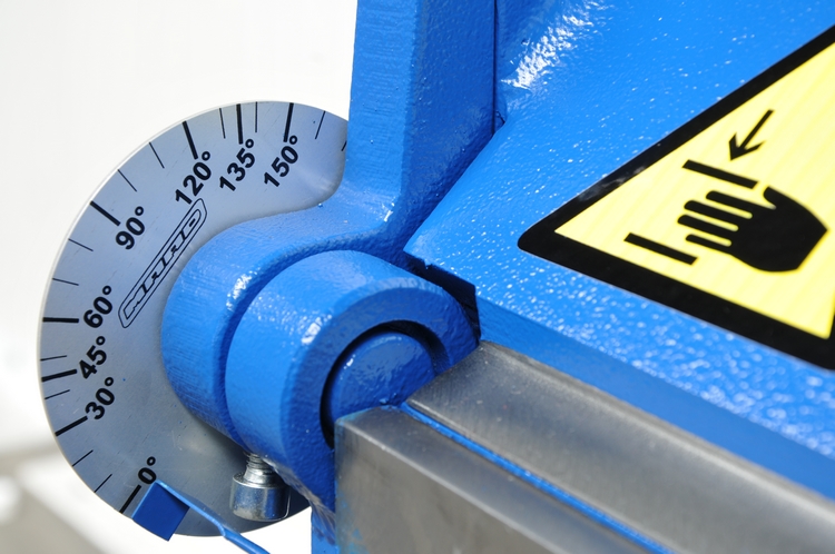 Операции гибки производится путем поворота с помощью ручки на определенную угловую величину балки gnącej. Транспортир закреплен с левой стороны станка при взгляде спереди указывает текущий угол излом металла.