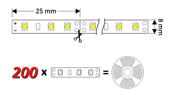 Na życzenie taśmę przygotujemy wedle twoich potrzeb. Dolutujemy zasilacz, przedłużymy przewody zasilające, podzielimy taśmę na potrzebne odcinki. Cięcie odbywa się co 2,5 cm (3 diody).